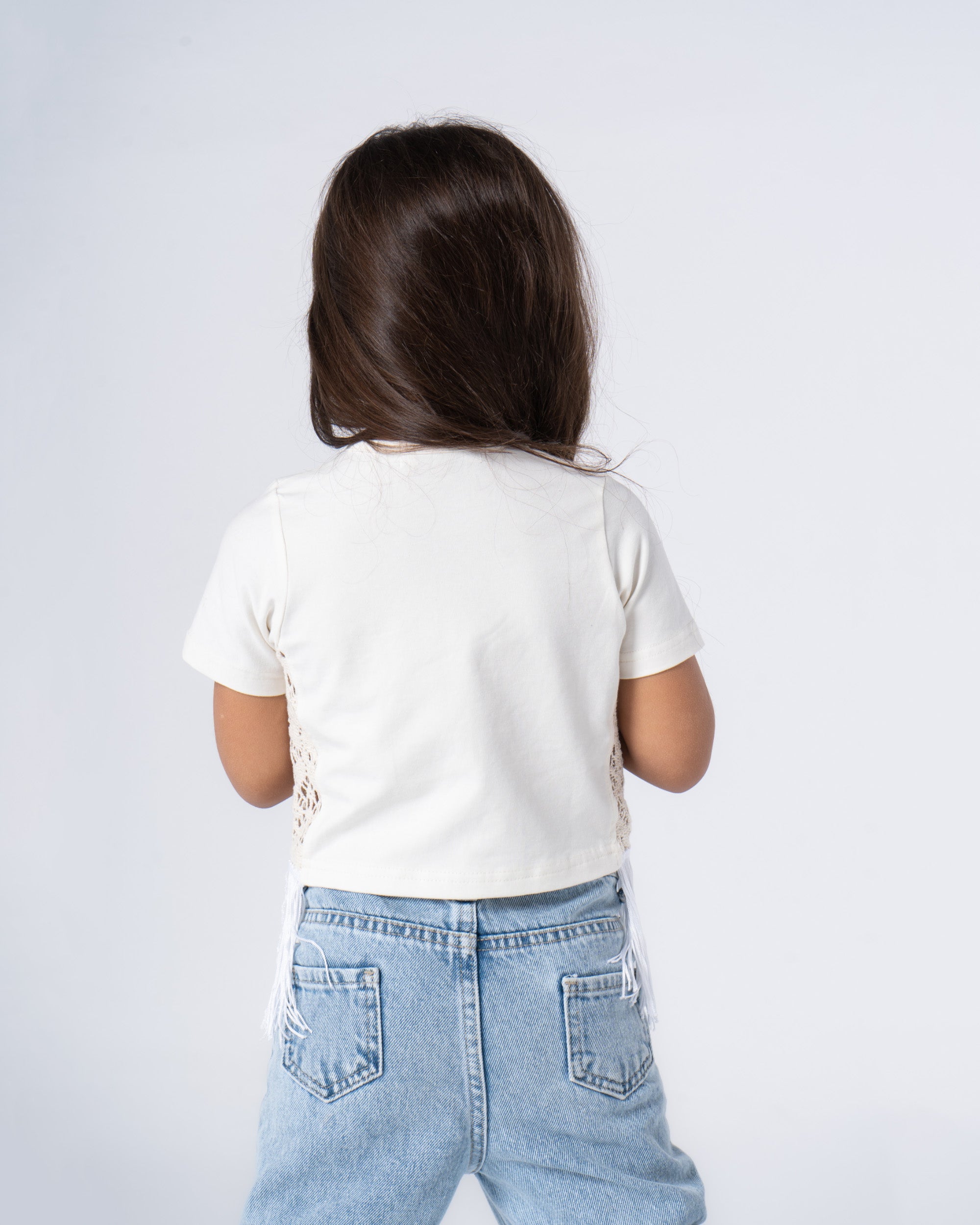 The T-shirt with Crochet on the Side in Off-White is a charming and unique piece. Crafted in a soft off-white hue, this casual t-shirt features delicate crochet detailing along the sides, adding a touch of bohemian flair. The classic t-shirt silhouette provides a comfortable, everyday fit, making this top a versatile choice for a variety of occasions. Pair it with your favorite jeans and sandals for a laid-back, effortless look, or tuck it into a skirt for a more polished ensemble.
