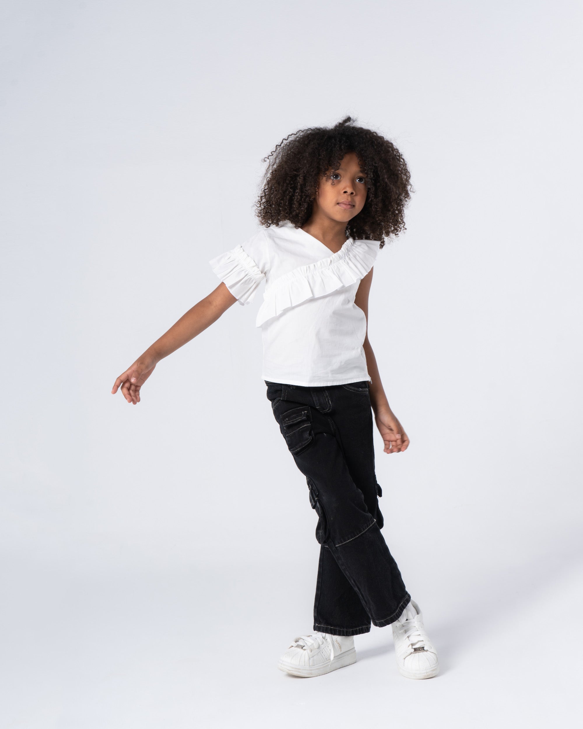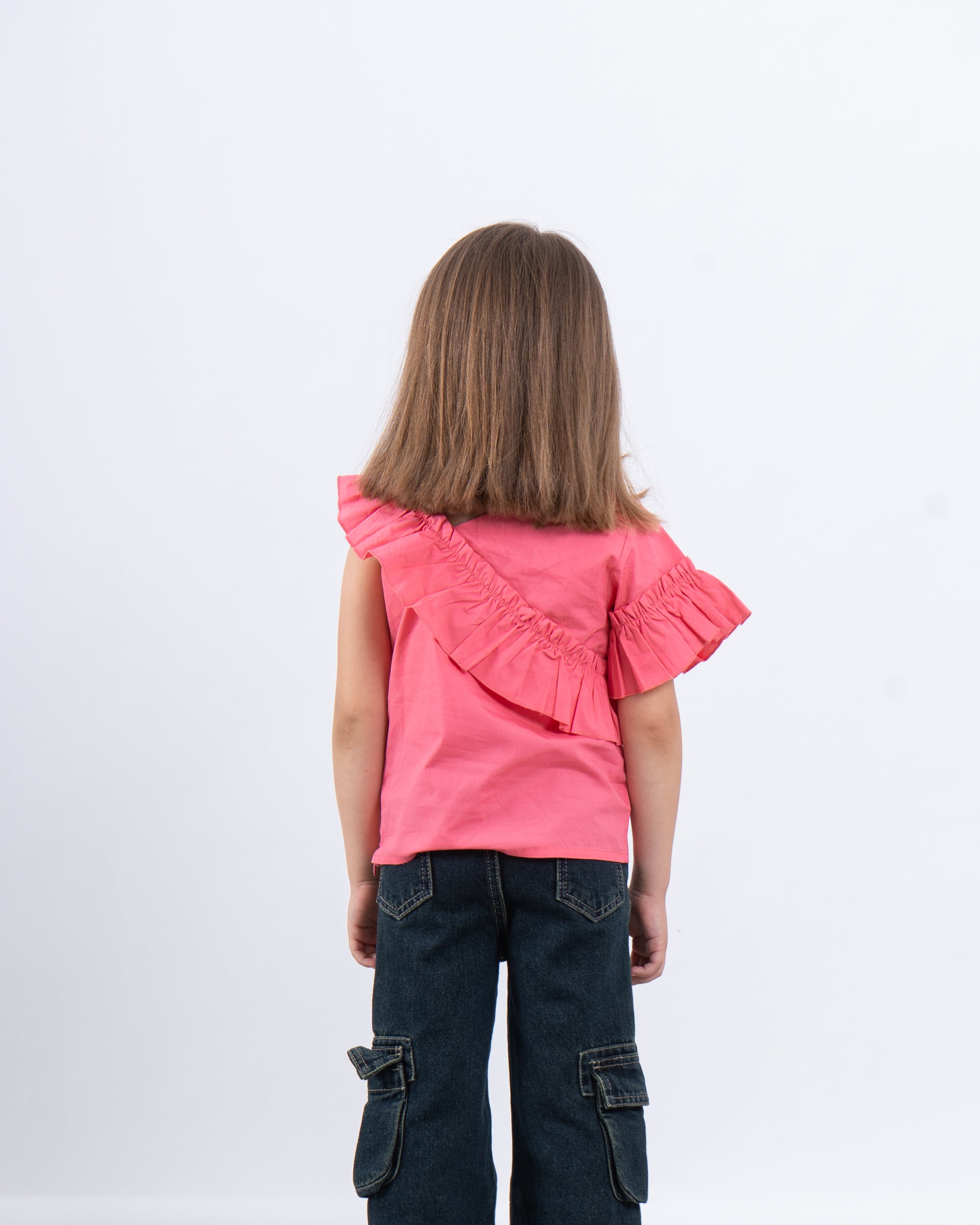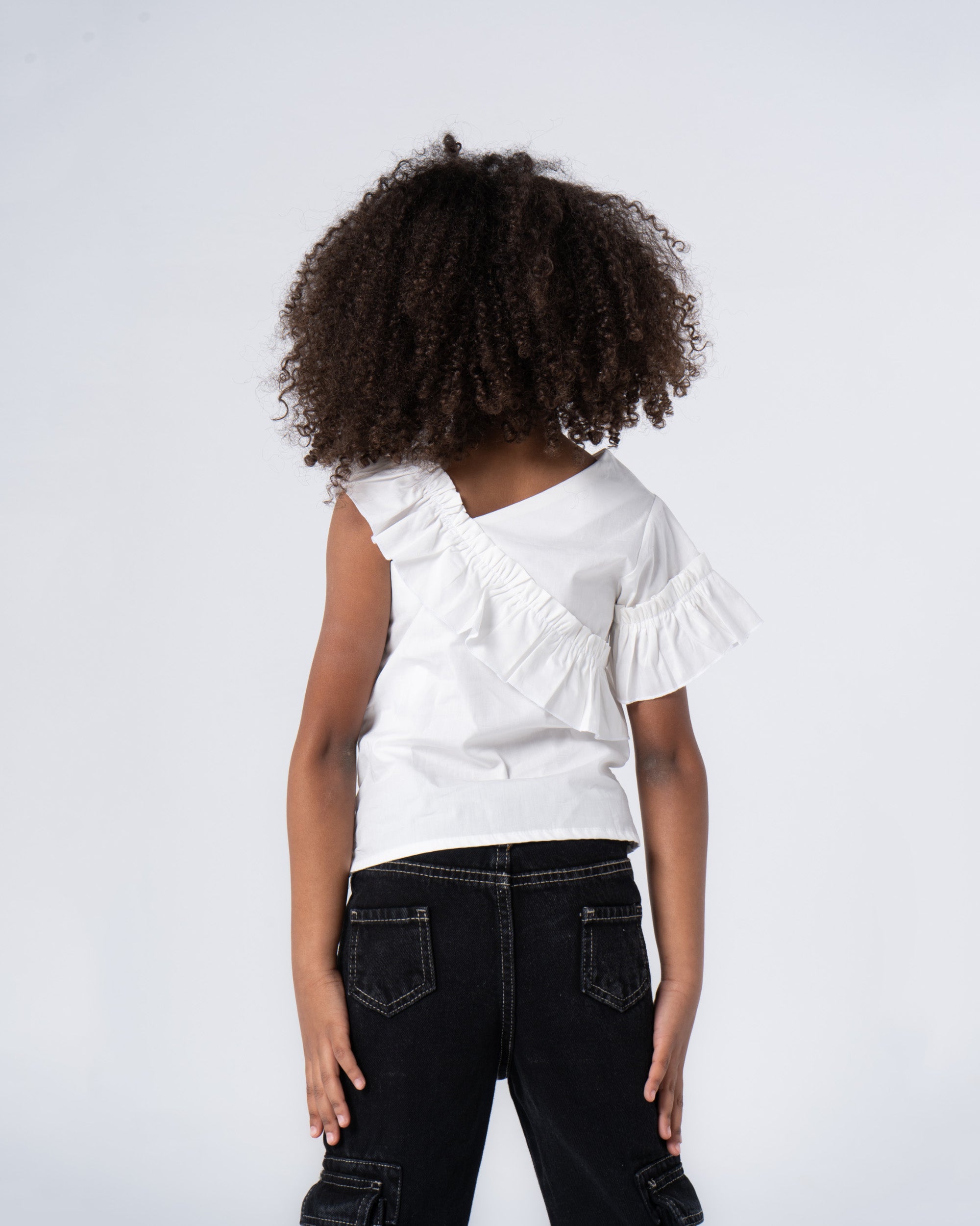 Fun and Frilly! This one-shoulder blouse with playful ruffles comes in sweet pink and crisp white. It adds a touch of whimsy and style to any outfit. Dress it up with a skirt for a special occasion or keep it casual with jeans for a fun summer look. This versatile top will be a favorite for all her adventures!