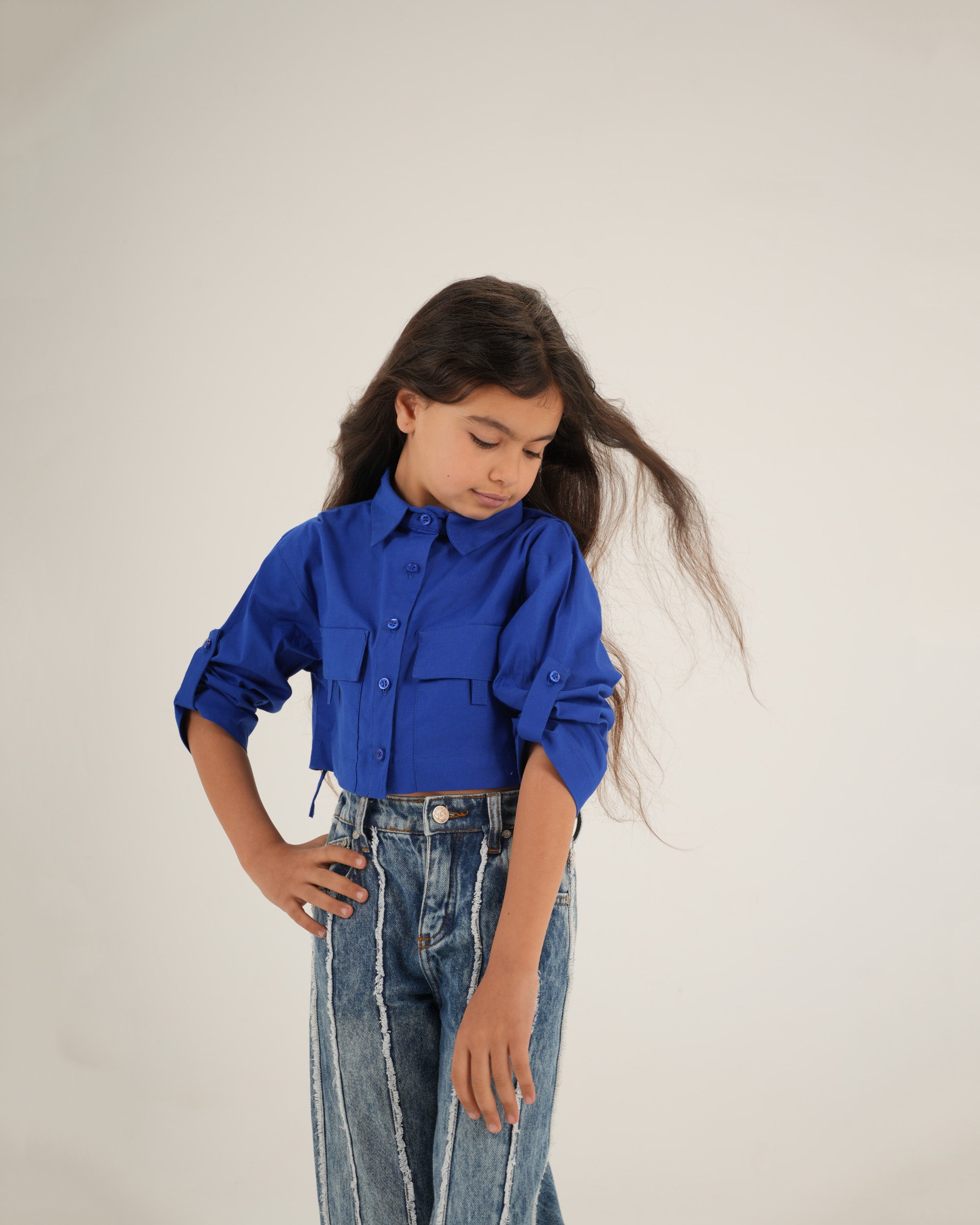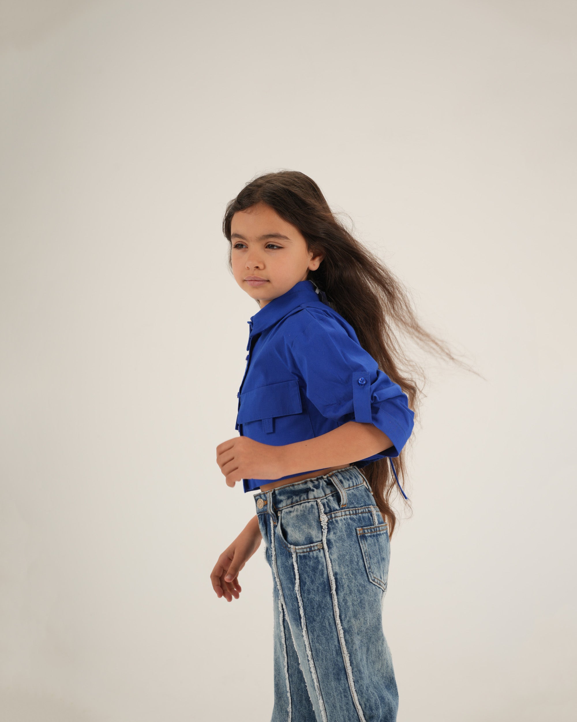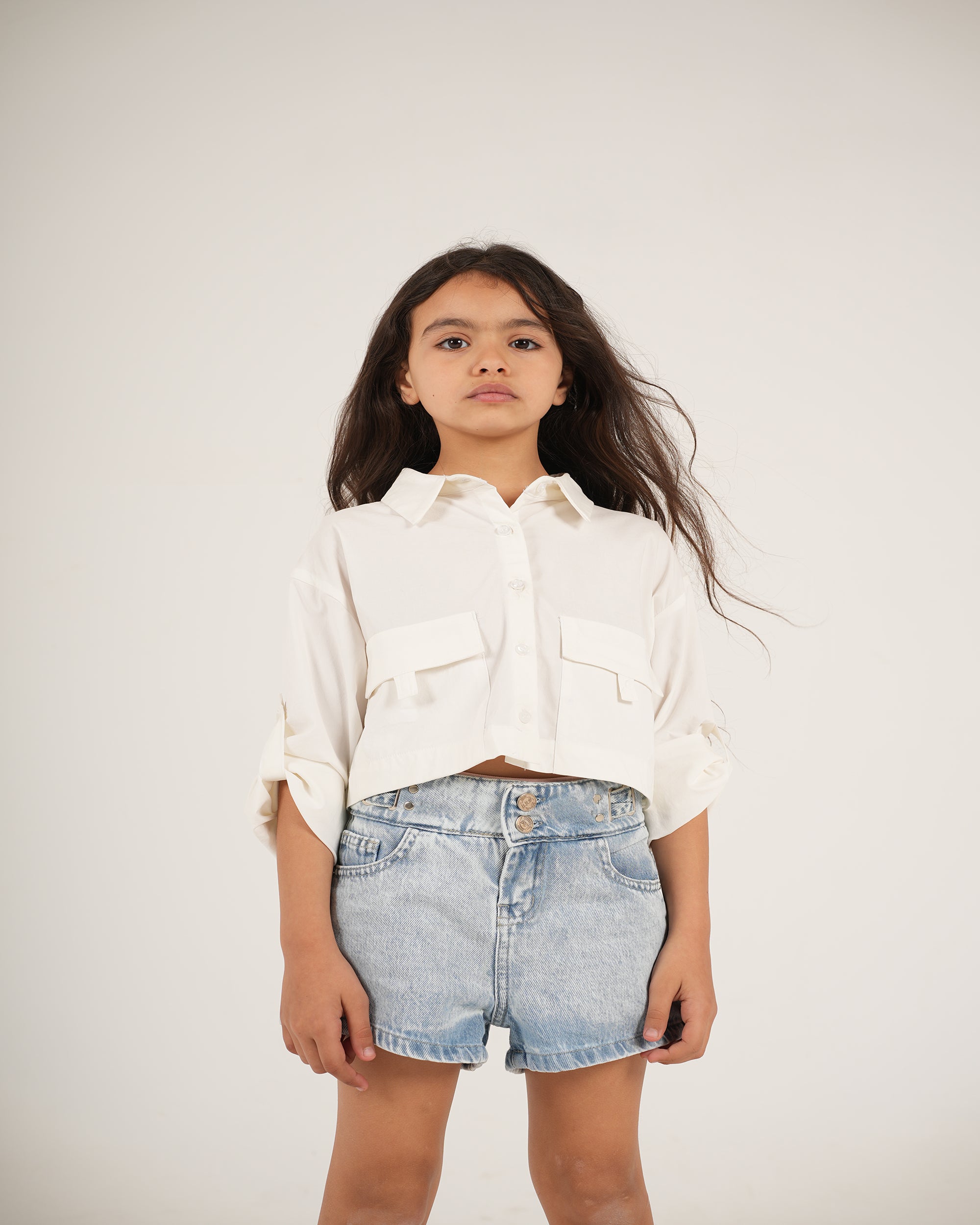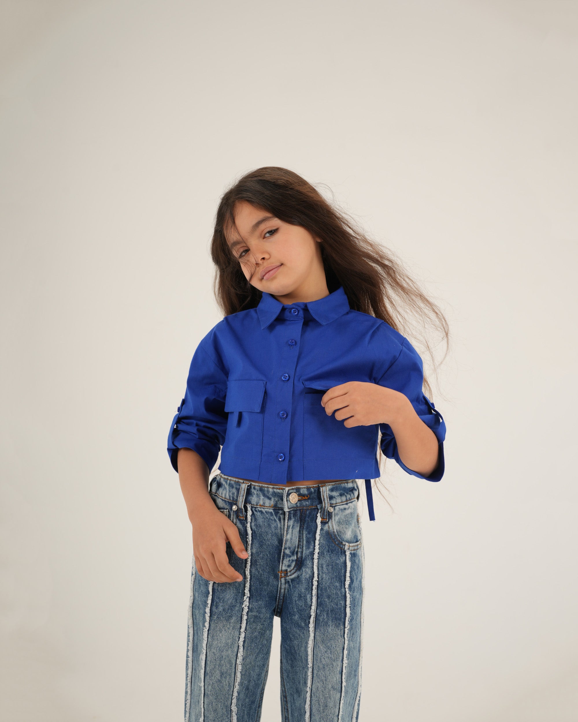 This Kashmir light cropped shirt is your little one's summer essential. The soft, breathable fabric keeps her cool on hot days, while the cropped silhouette adds a trendy touch. The subtle Kashmir detail hints at a touch of luxury, perfect for everyday adventures or special occasions.