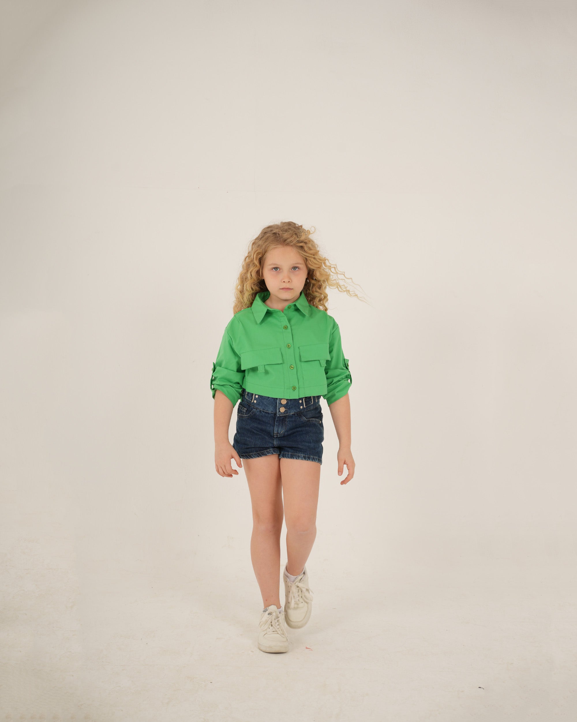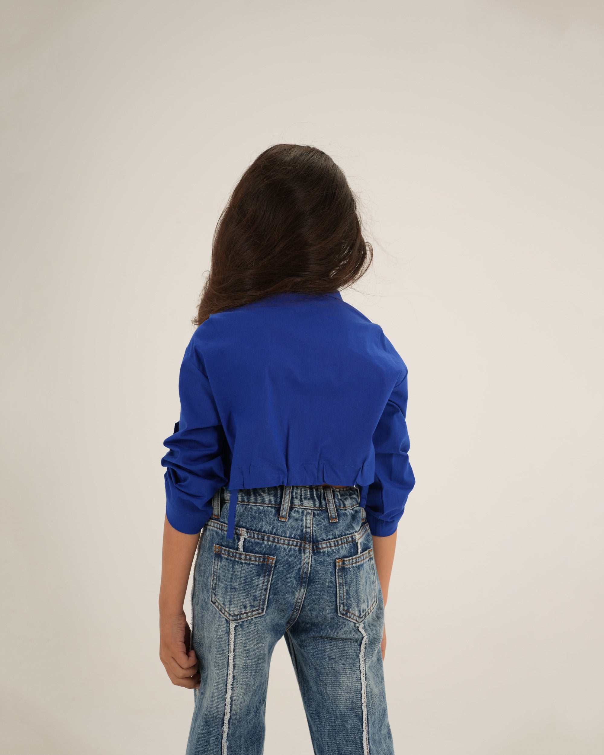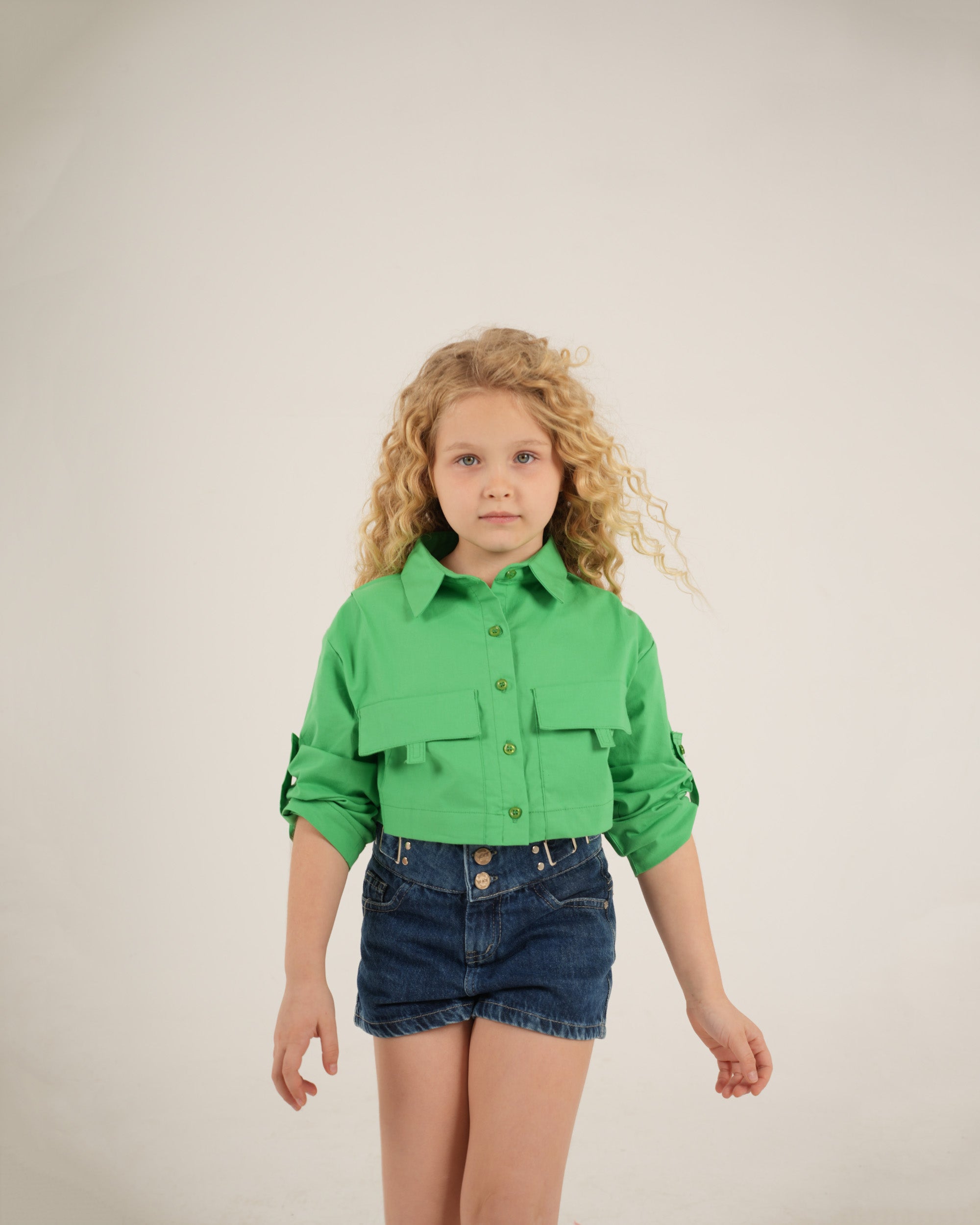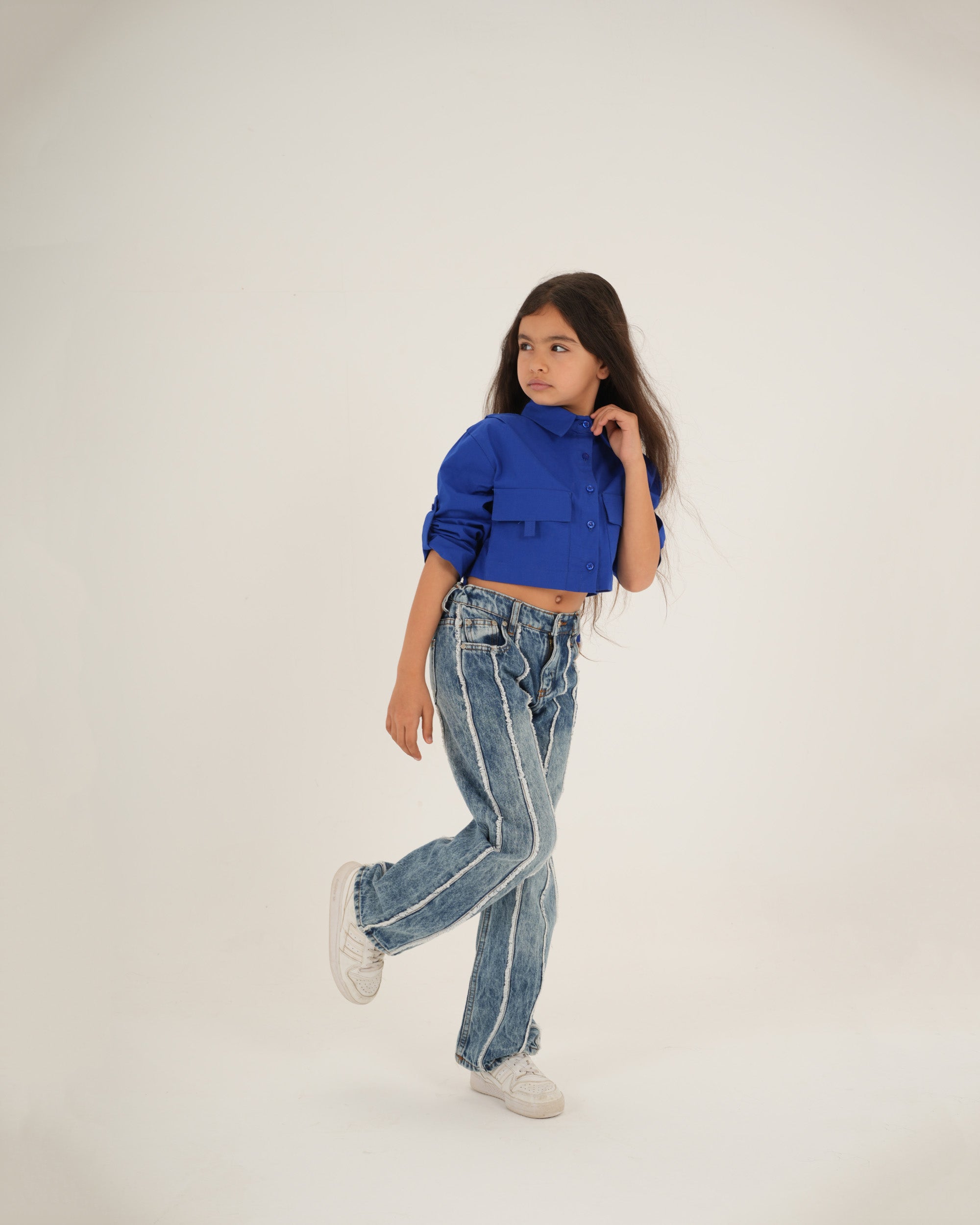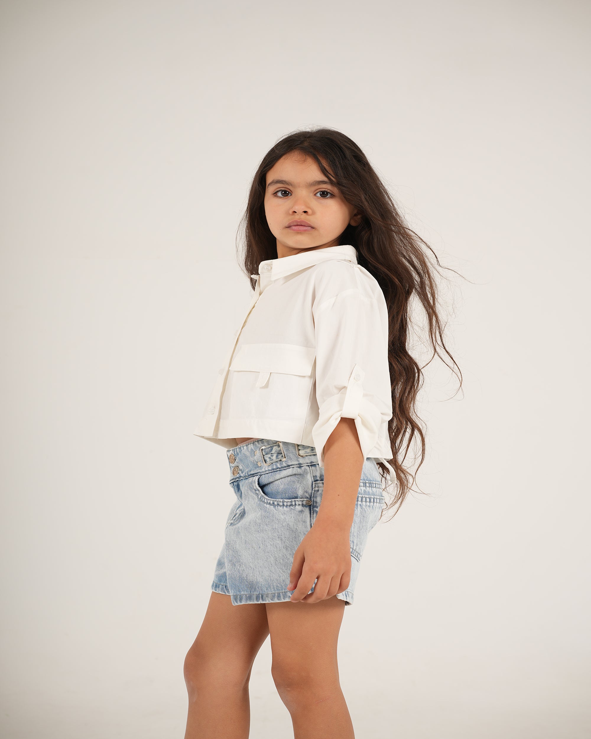 This Kashmir light cropped shirt is your little one's summer essential. The soft, breathable fabric keeps her cool on hot days, while the cropped silhouette adds a trendy touch. The subtle Kashmir detail hints at a touch of luxury, perfect for everyday adventures or special occasions.