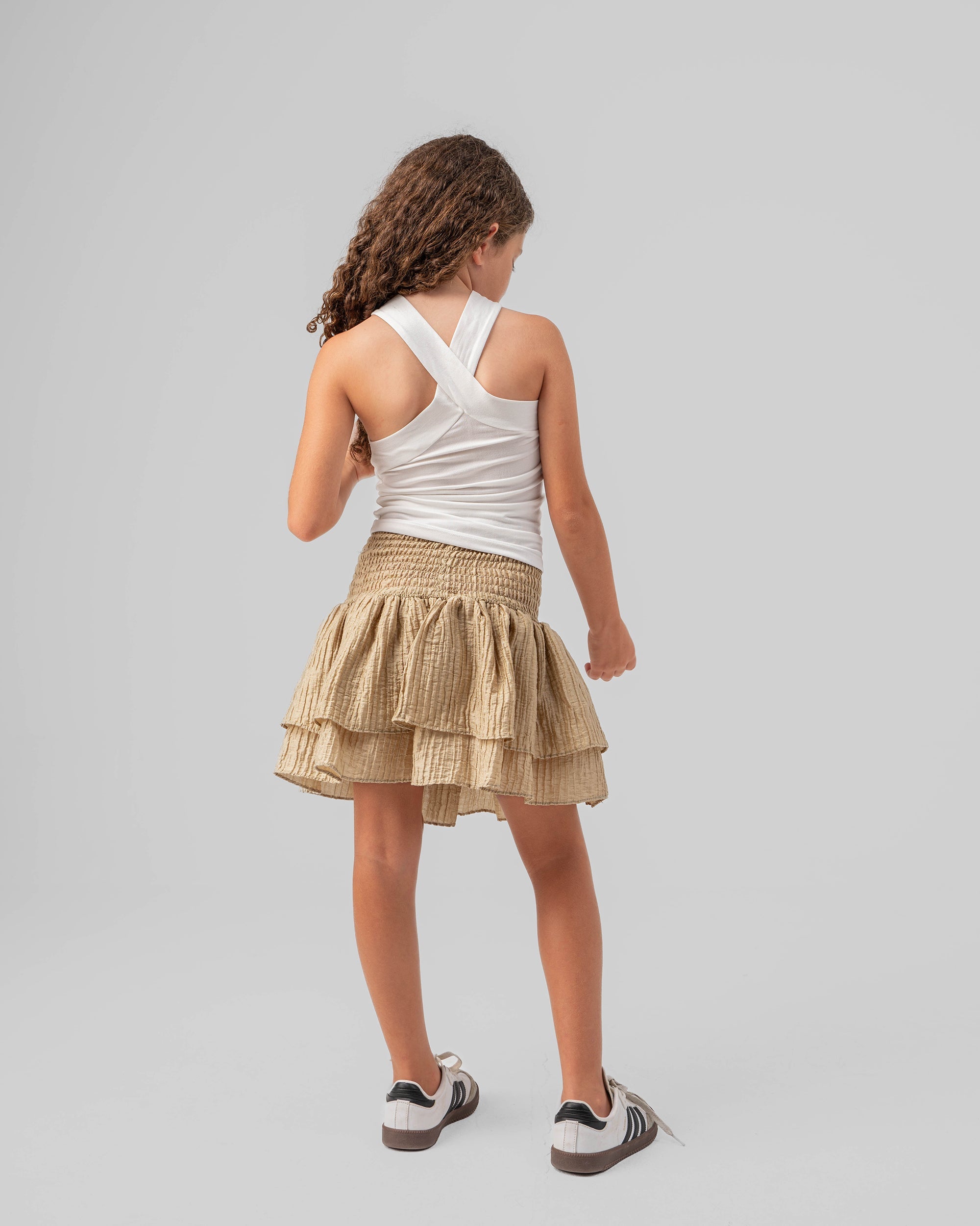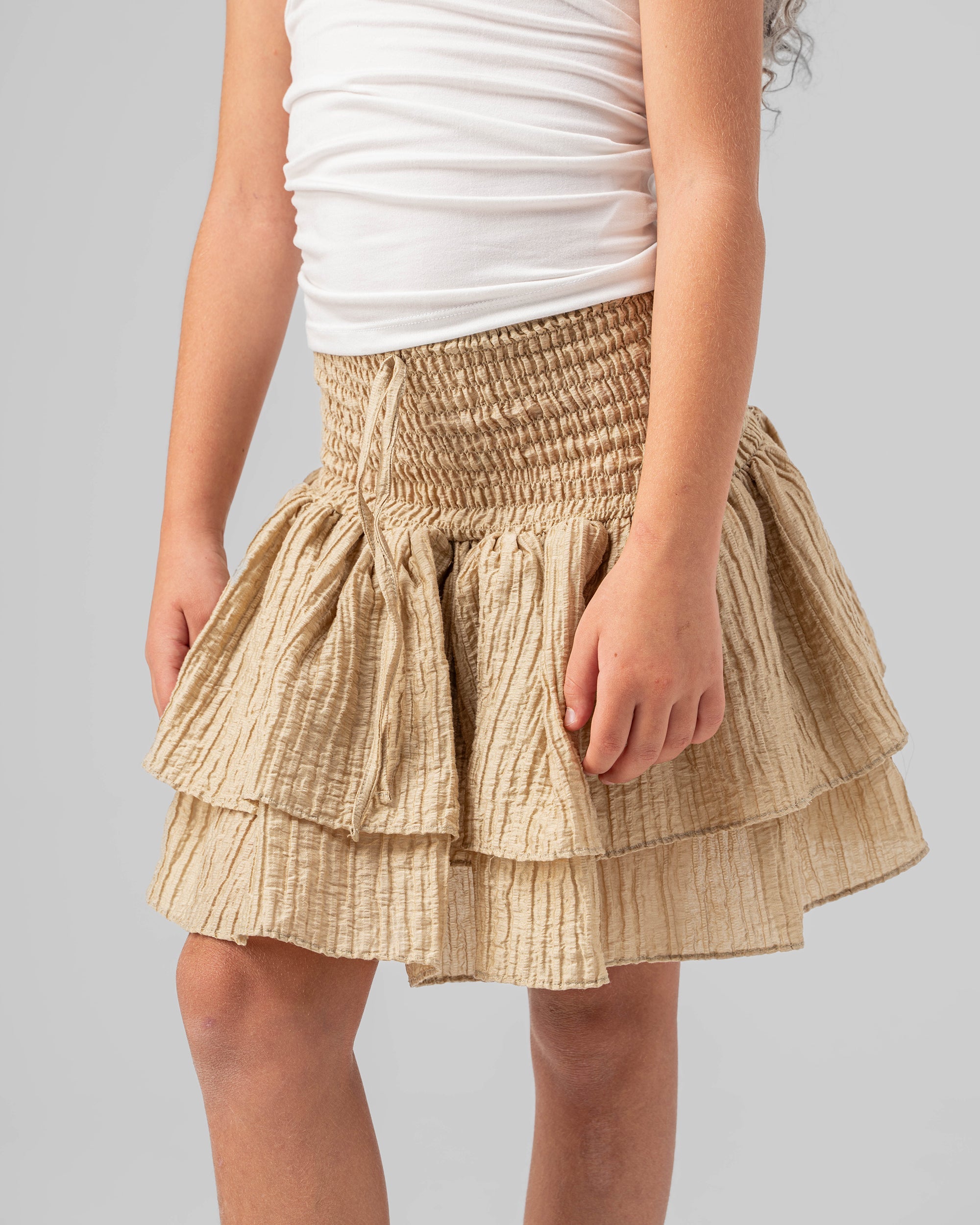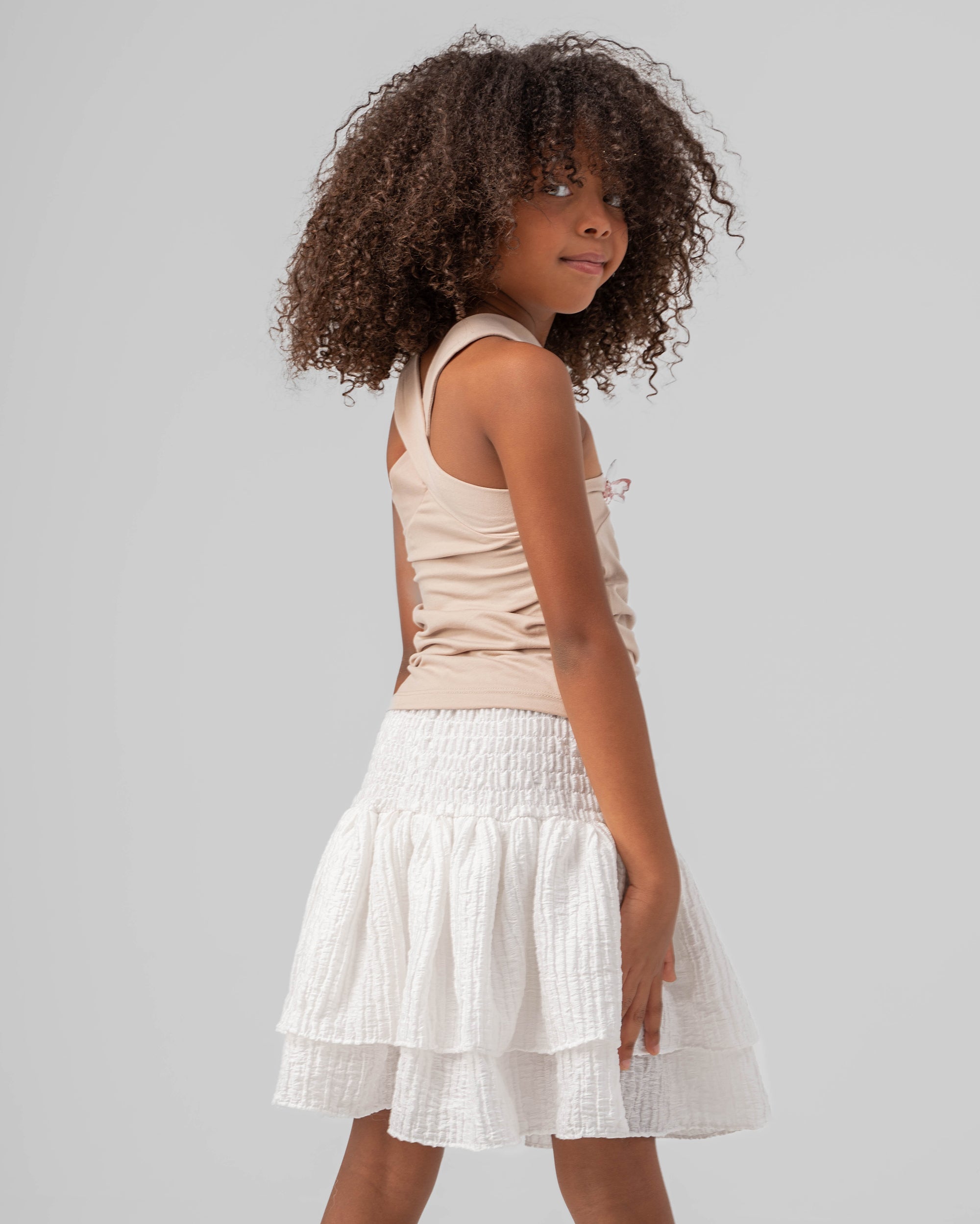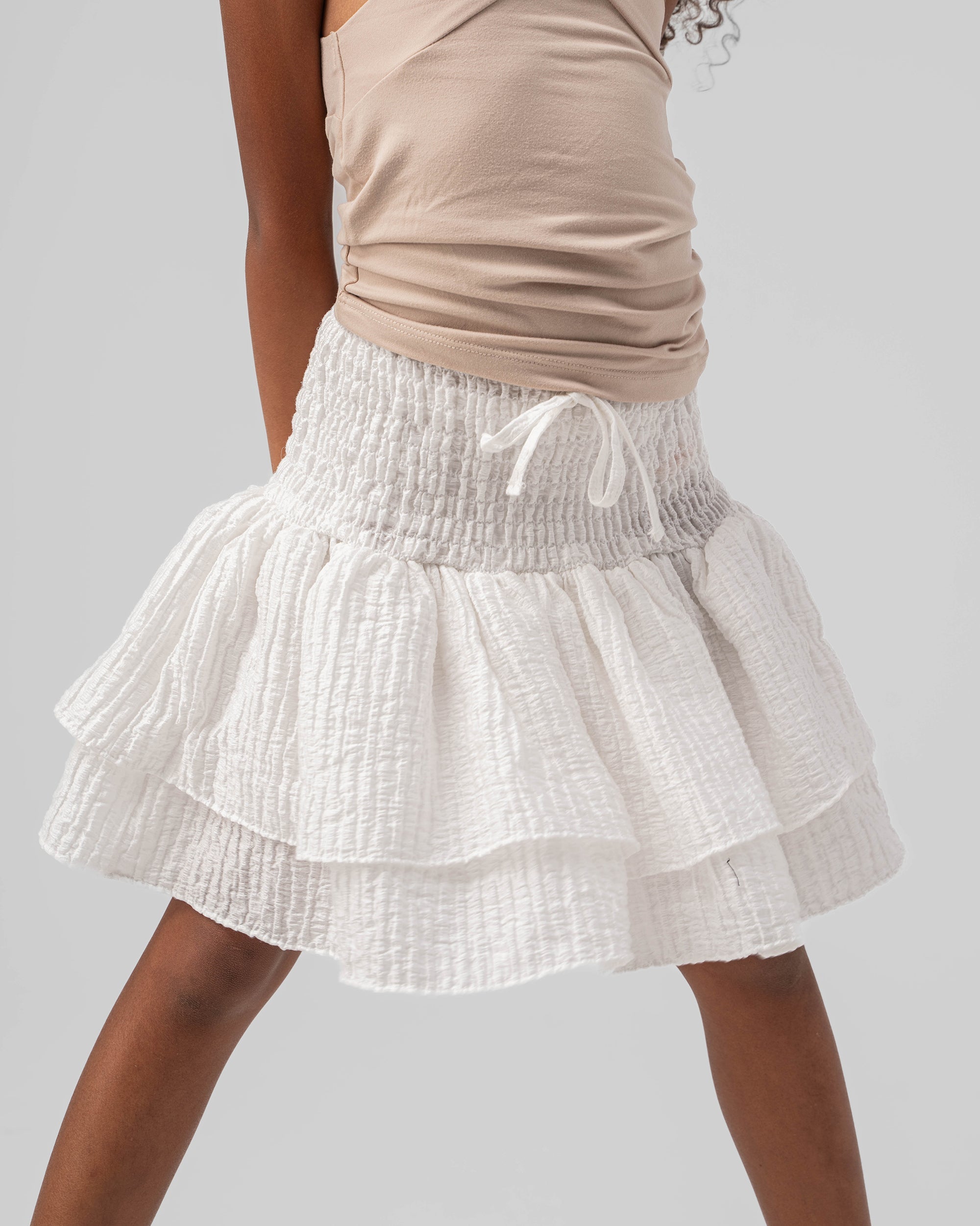 This charming tiered ruffle skirt in white & beige is perfect for adding a playful and stylish touch to any outfit. The layered ruffle design adds volume and movement, while the soft, textured fabric ensures comfort. The elasticized waistband with a drawstring tie allows for an adjustable fit, making it a versatile and comfortable choice for different occasions.
