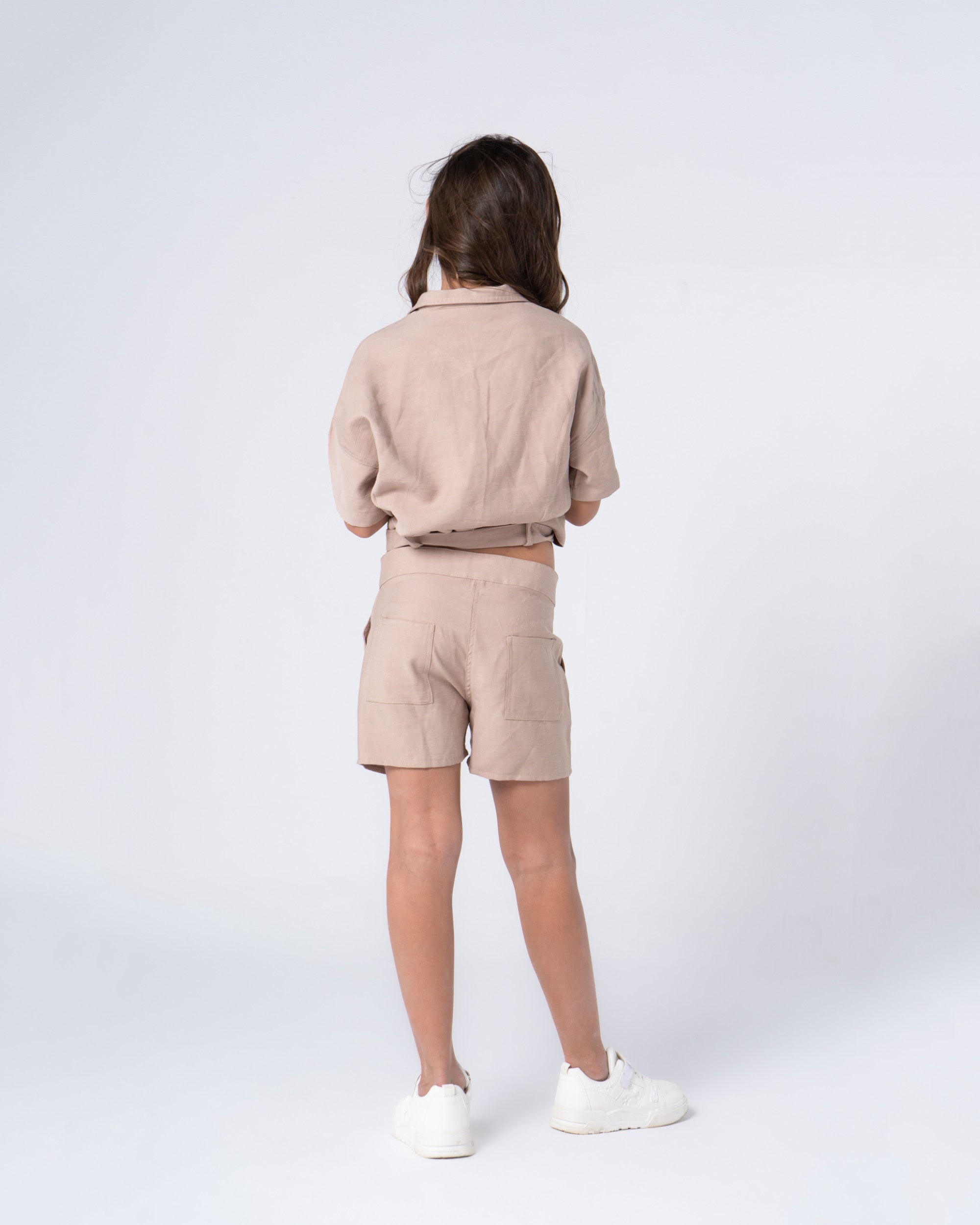 Breezy and beautiful! This beige linen short set is the perfect summer companion for your little explorer. The comfy, relaxed fit keeps her cool on sunny days, while the chic linen material adds a touch of sophistication. This versatile set is perfect for playtime adventures, picnics in the park, or a casual day out. She'll be ready for anything in style!