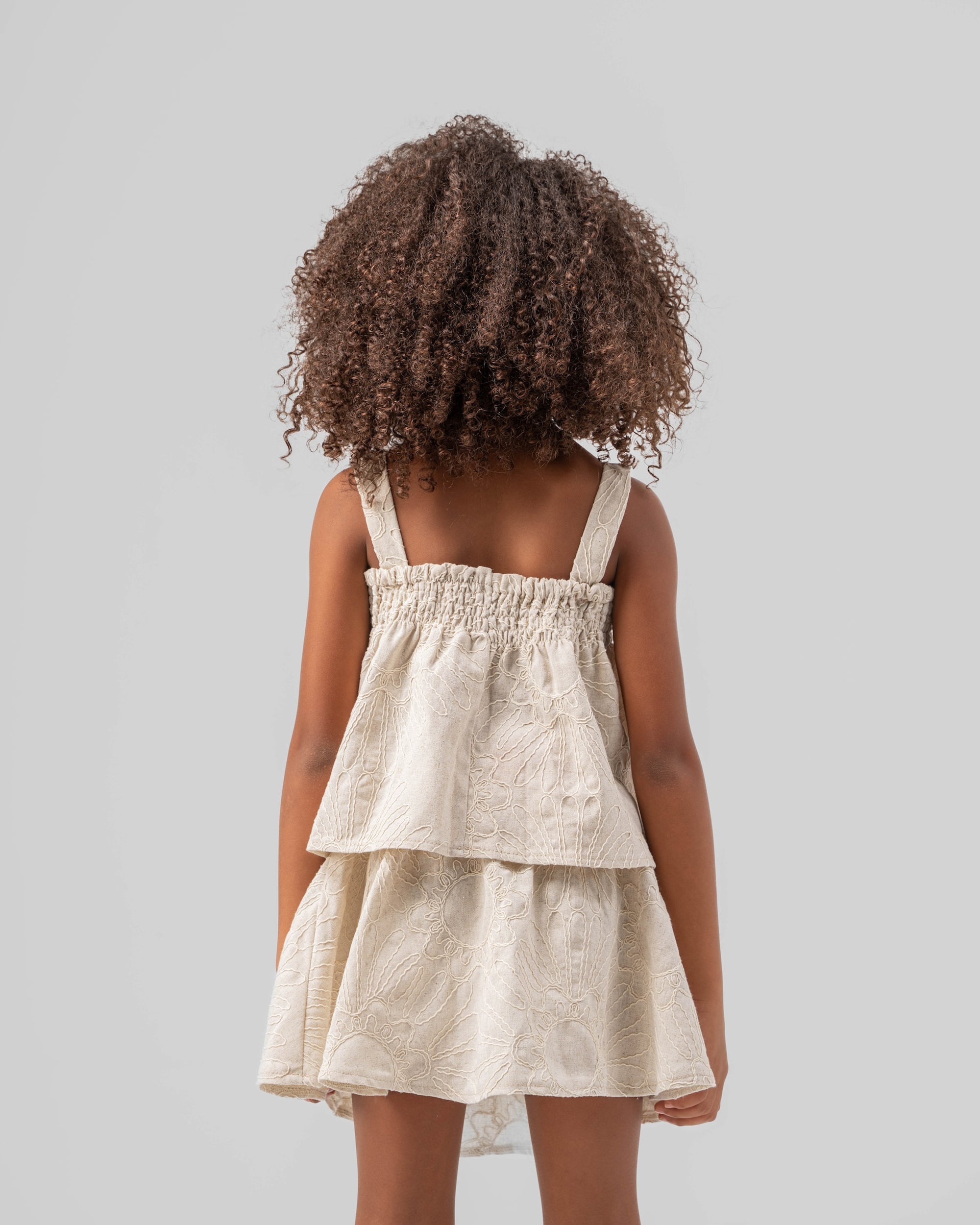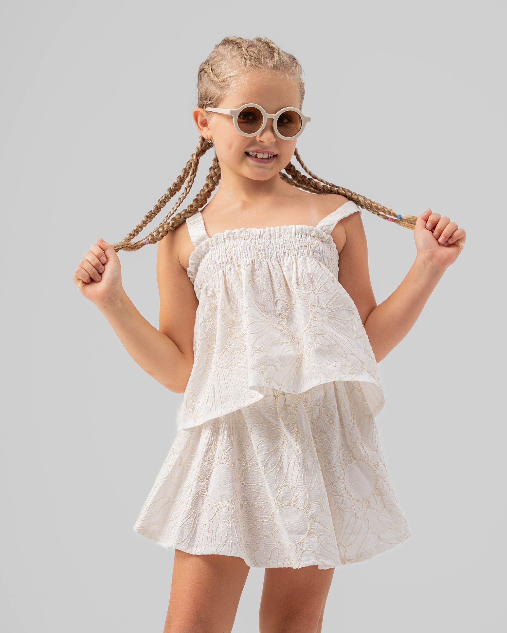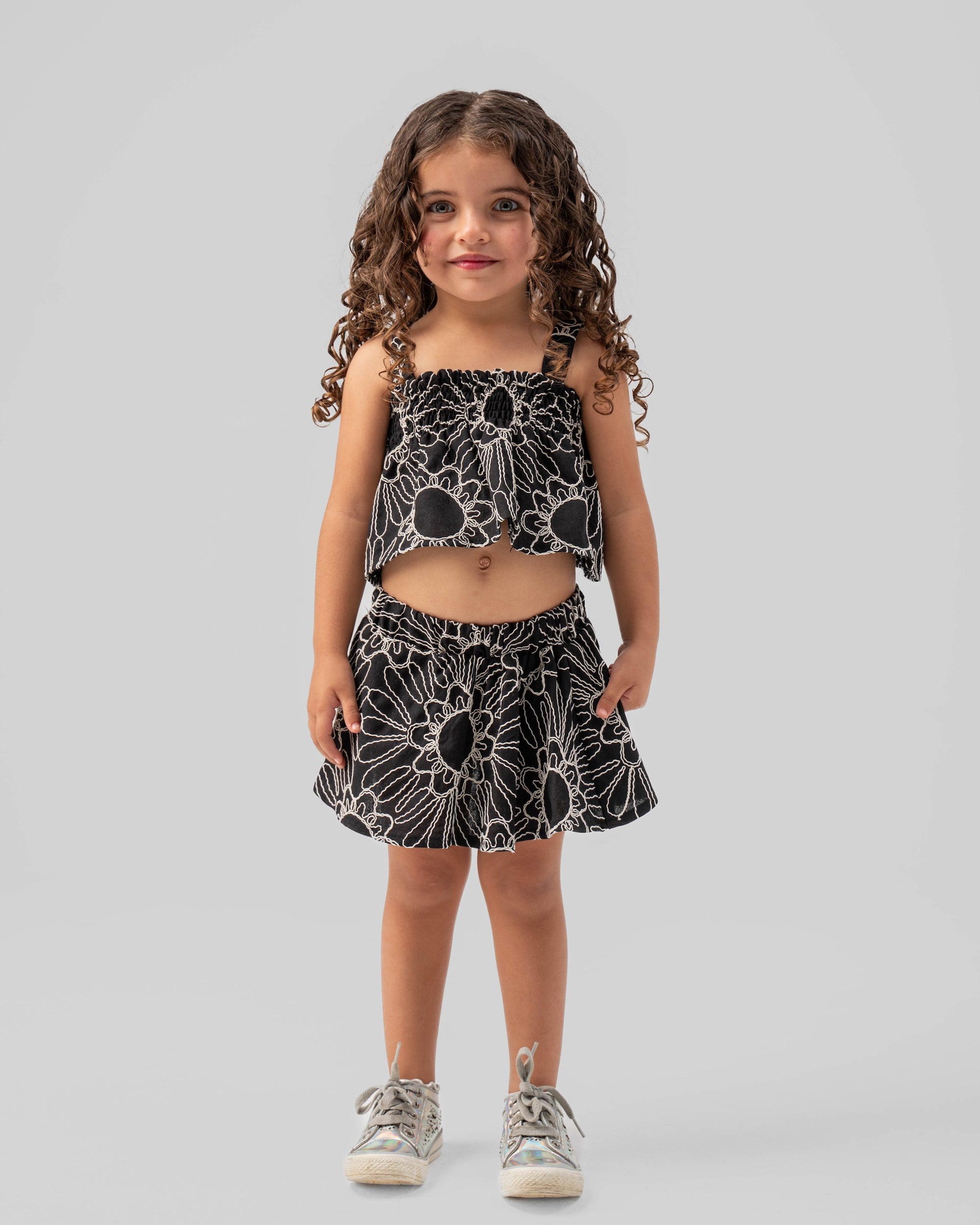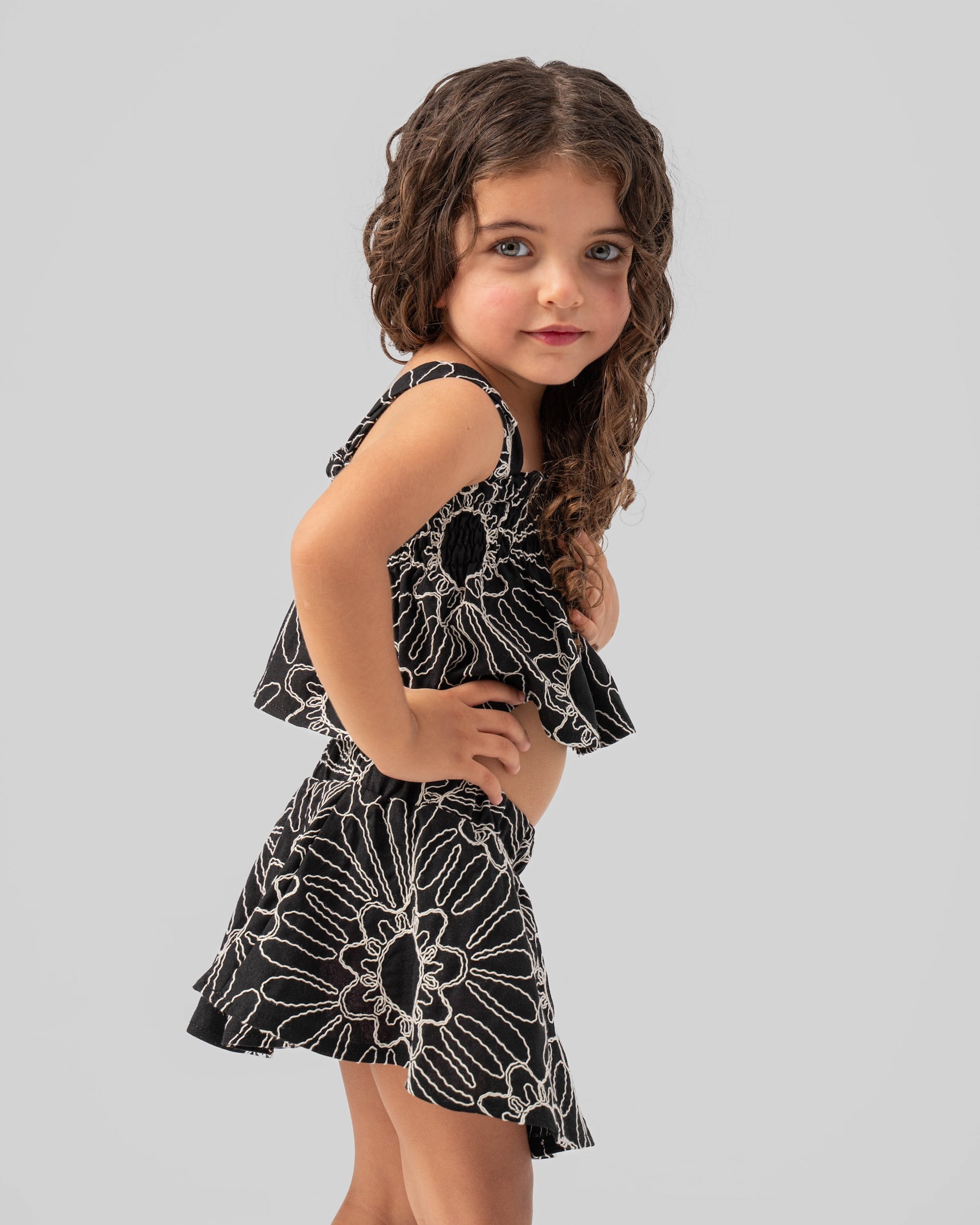 Introducing our delightful embroidered floral top and skirt set, perfect for your little one to embrace her unique style and express her creativity. Crafted from high-quality textured fabric, the sleeveless top features a beautiful array of embroidered flowers that bring a touch of nature's elegance to her wardrobe. The ruffled, smocked neckline adds a playful charm, while the loose fit ensures comfort and ease of movement for all her adventures.