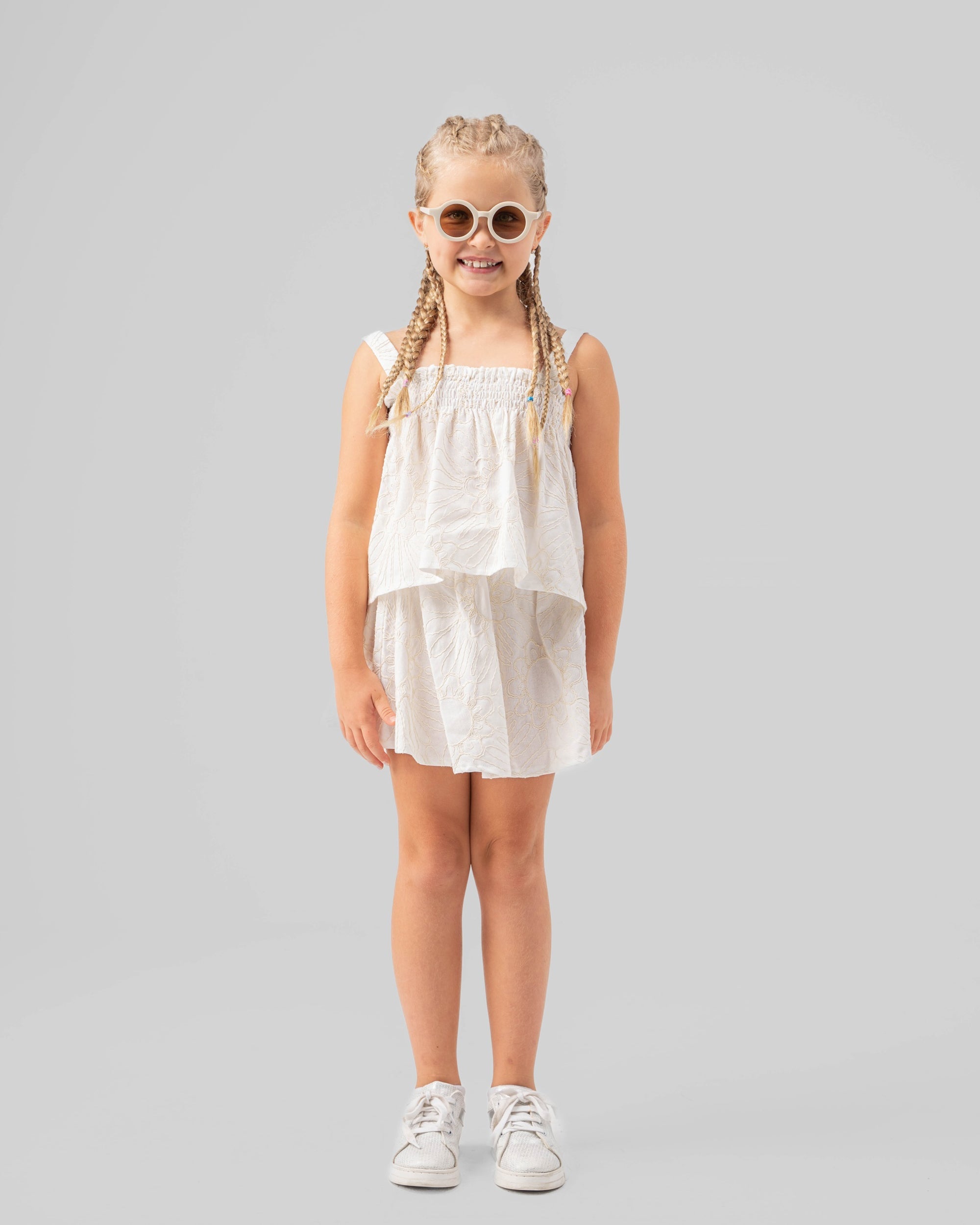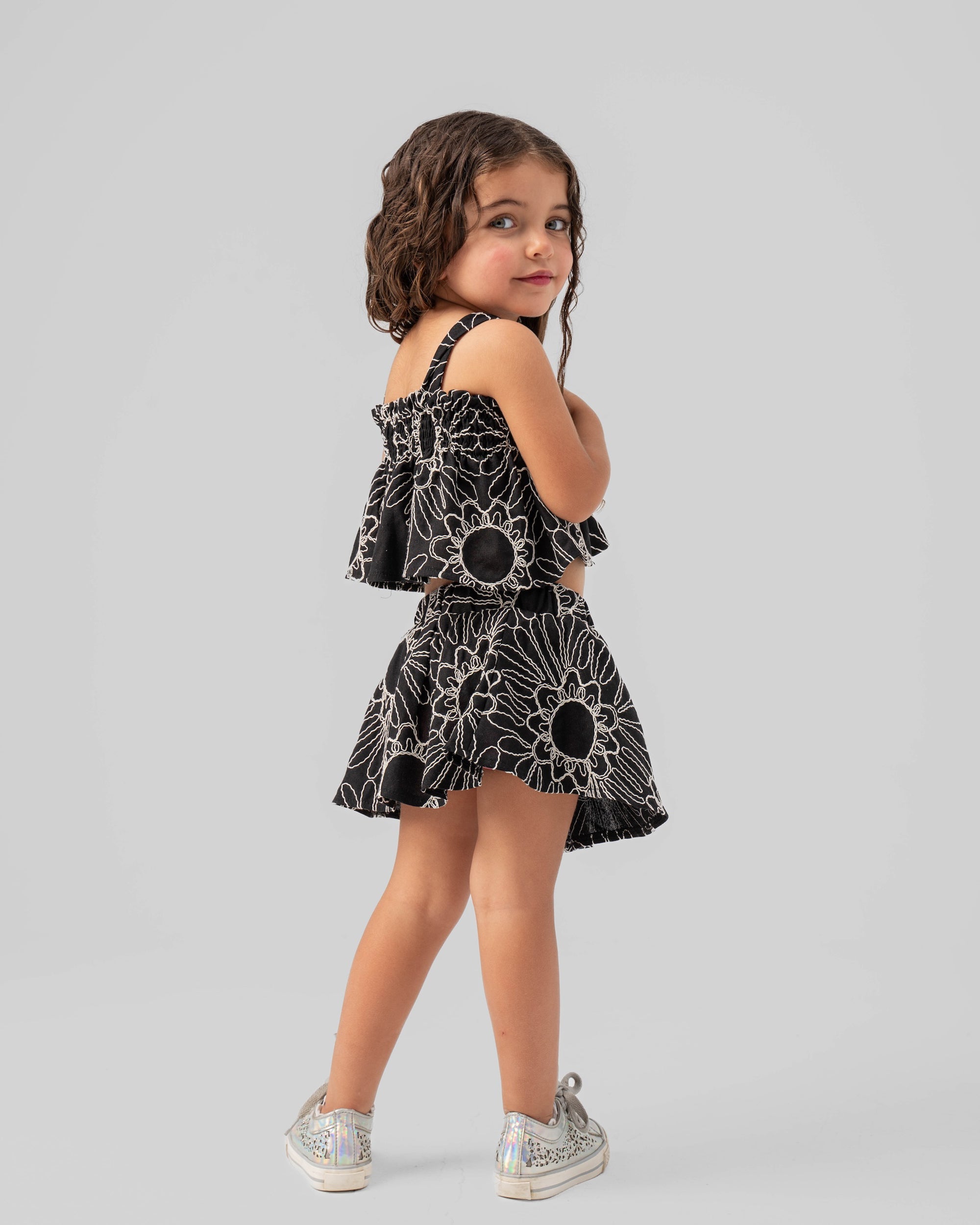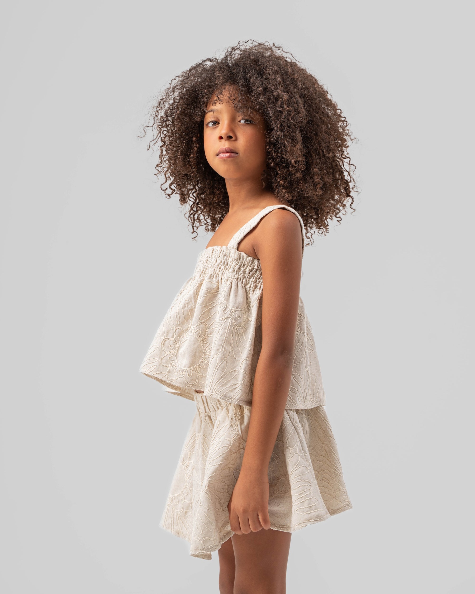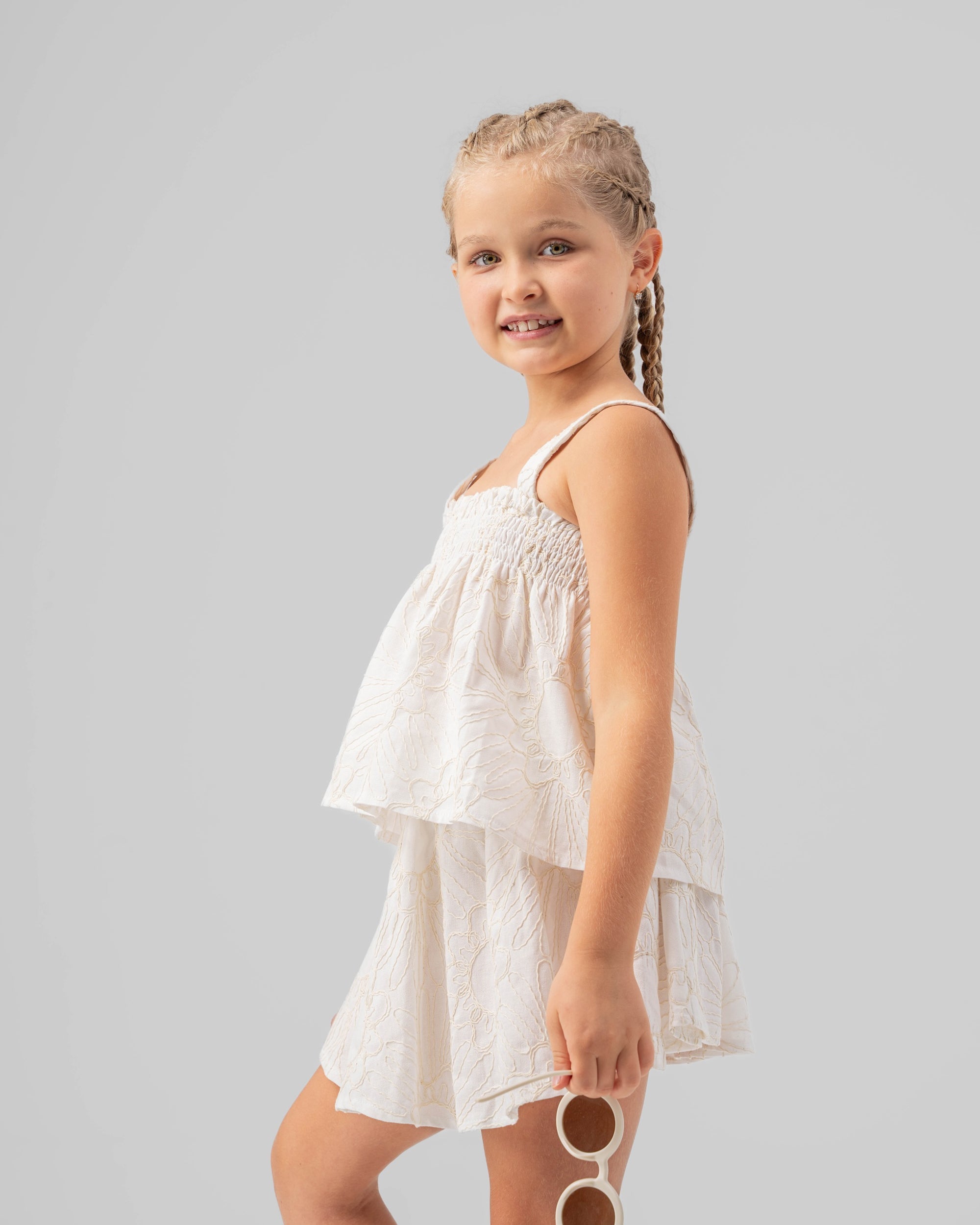 Introducing our delightful embroidered floral top and skirt set, perfect for your little one to embrace her unique style and express her creativity. Crafted from high-quality textured fabric, the sleeveless top features a beautiful array of embroidered flowers that bring a touch of nature's elegance to her wardrobe. The ruffled, smocked neckline adds a playful charm, while the loose fit ensures comfort and ease of movement for all her adventures.