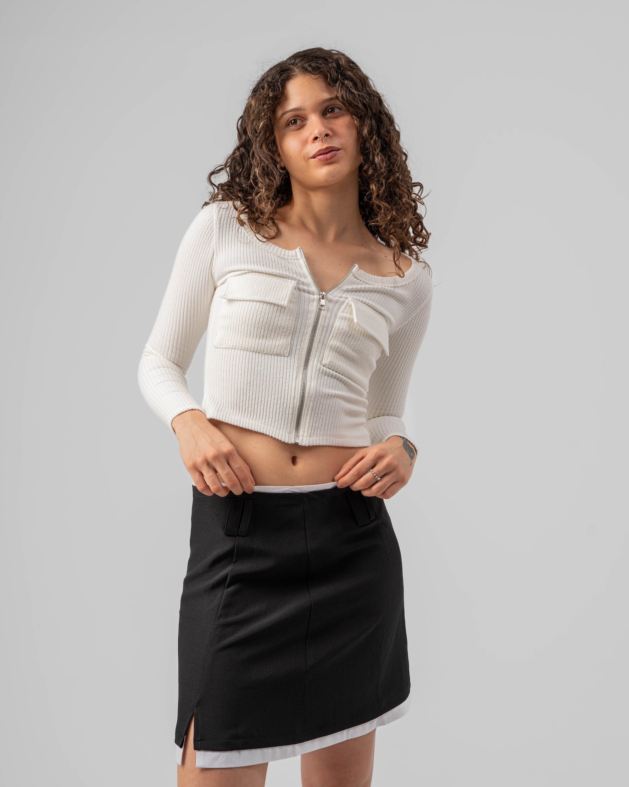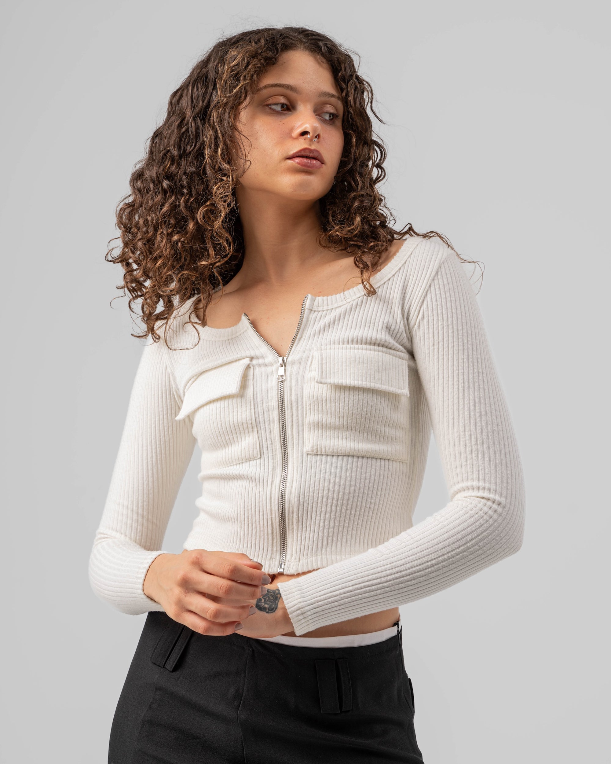 For a cozy-chic look, check out the Women Pocket Zip-Up Ribbed Top in Off-White. This soft, ribbed top features handy zip pockets, perfect for keeping your essentials close at hand. Pair it with the matching Cargo Pants for a cool, coordinated ensemble.