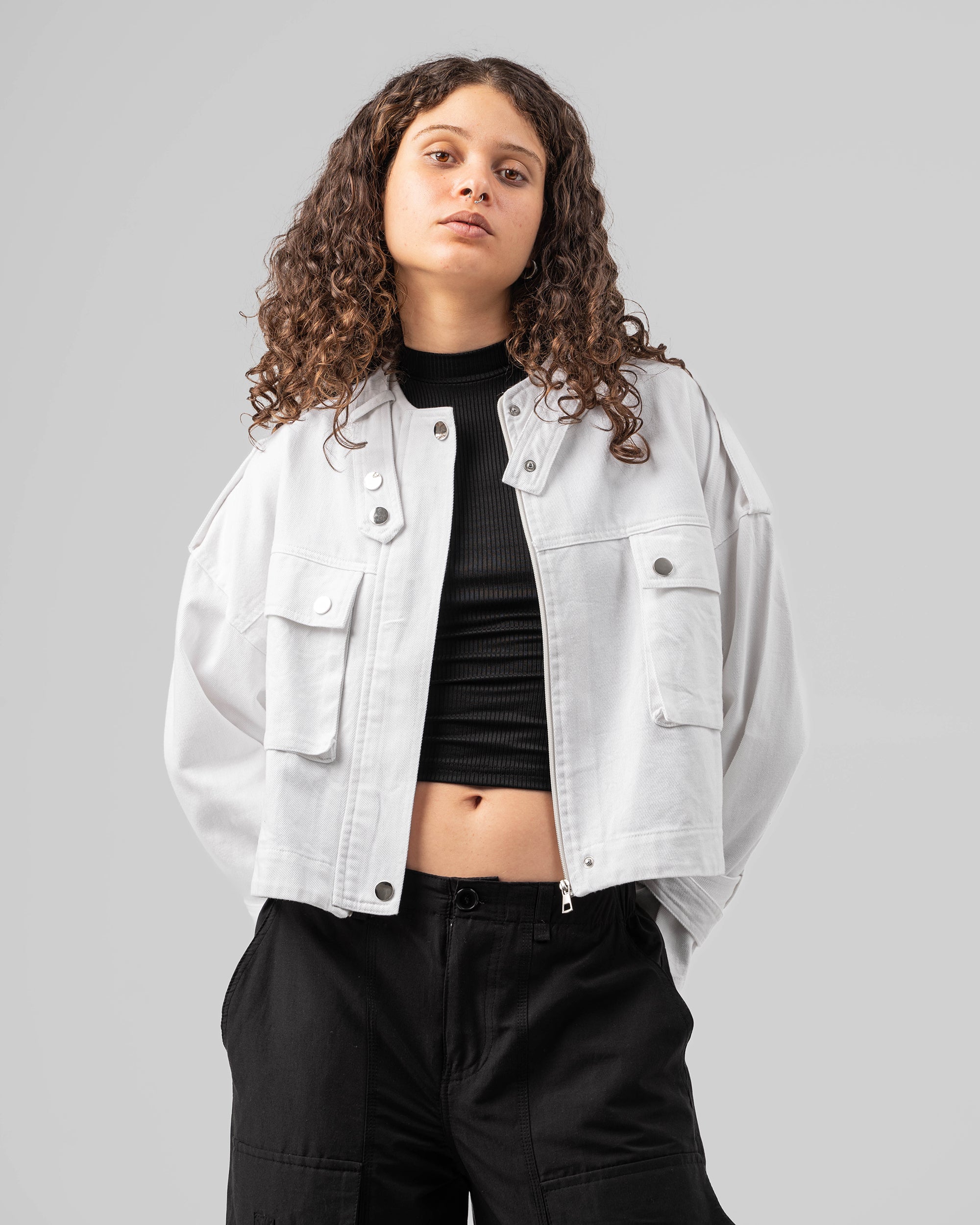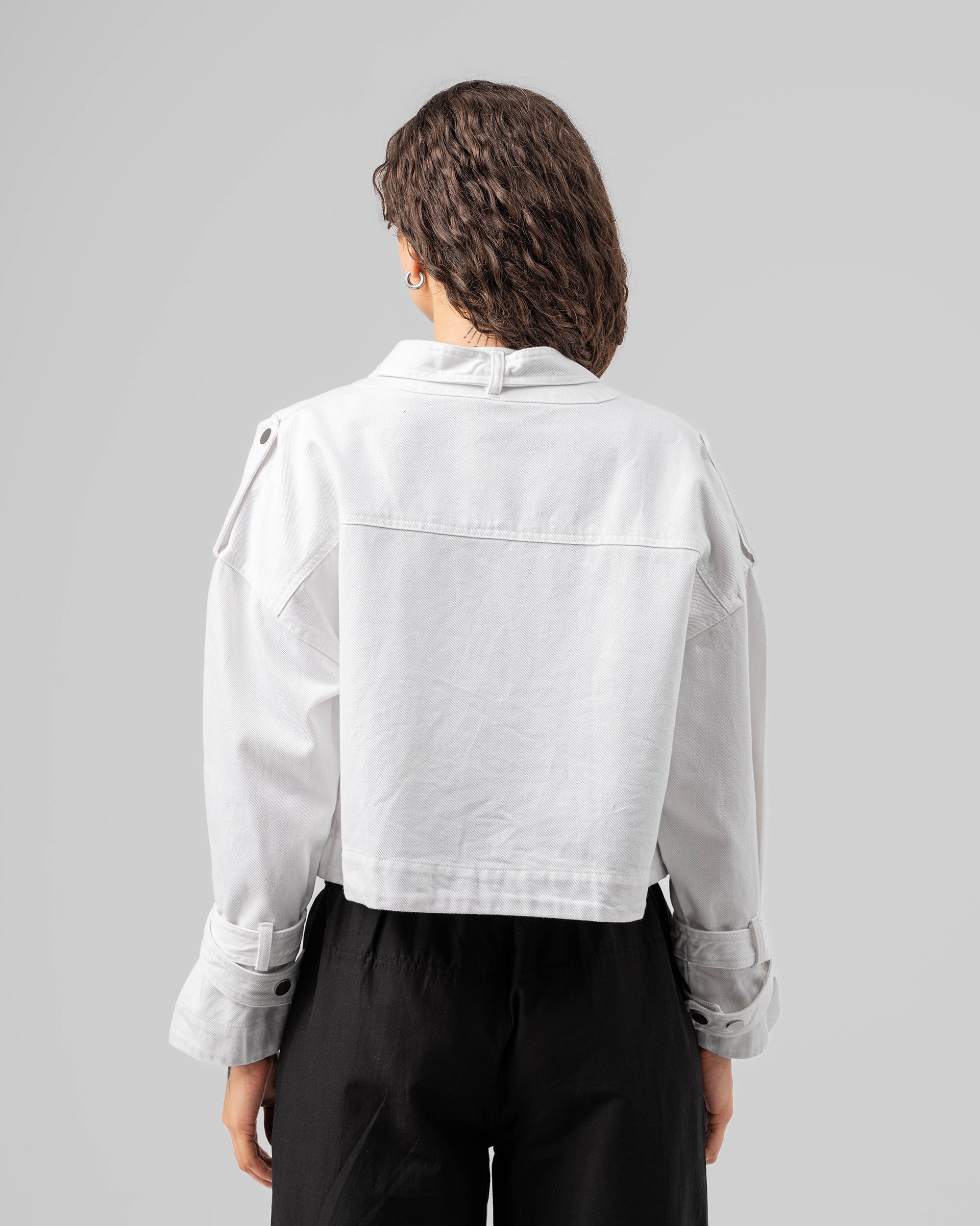 Utility Chic: This crisp white jacket is your summer armor. Functional pockets meet a relaxed silhouette, offering effortless style with a touch of practicality. Layer it over anything for instant cool.