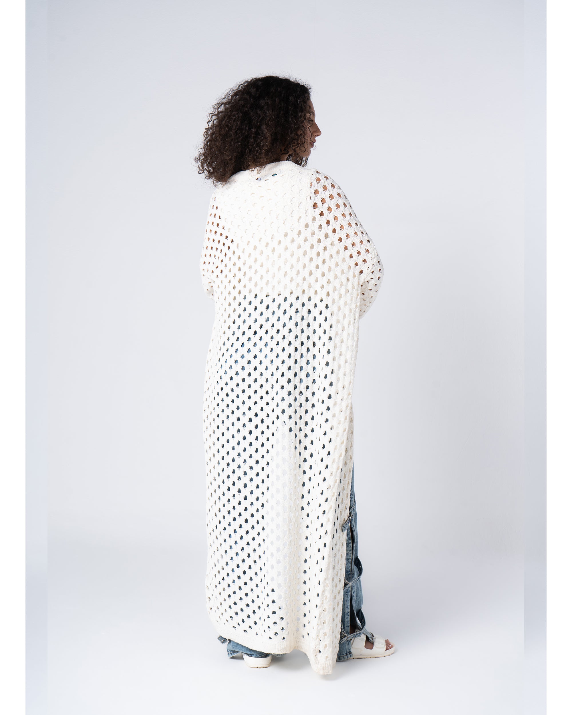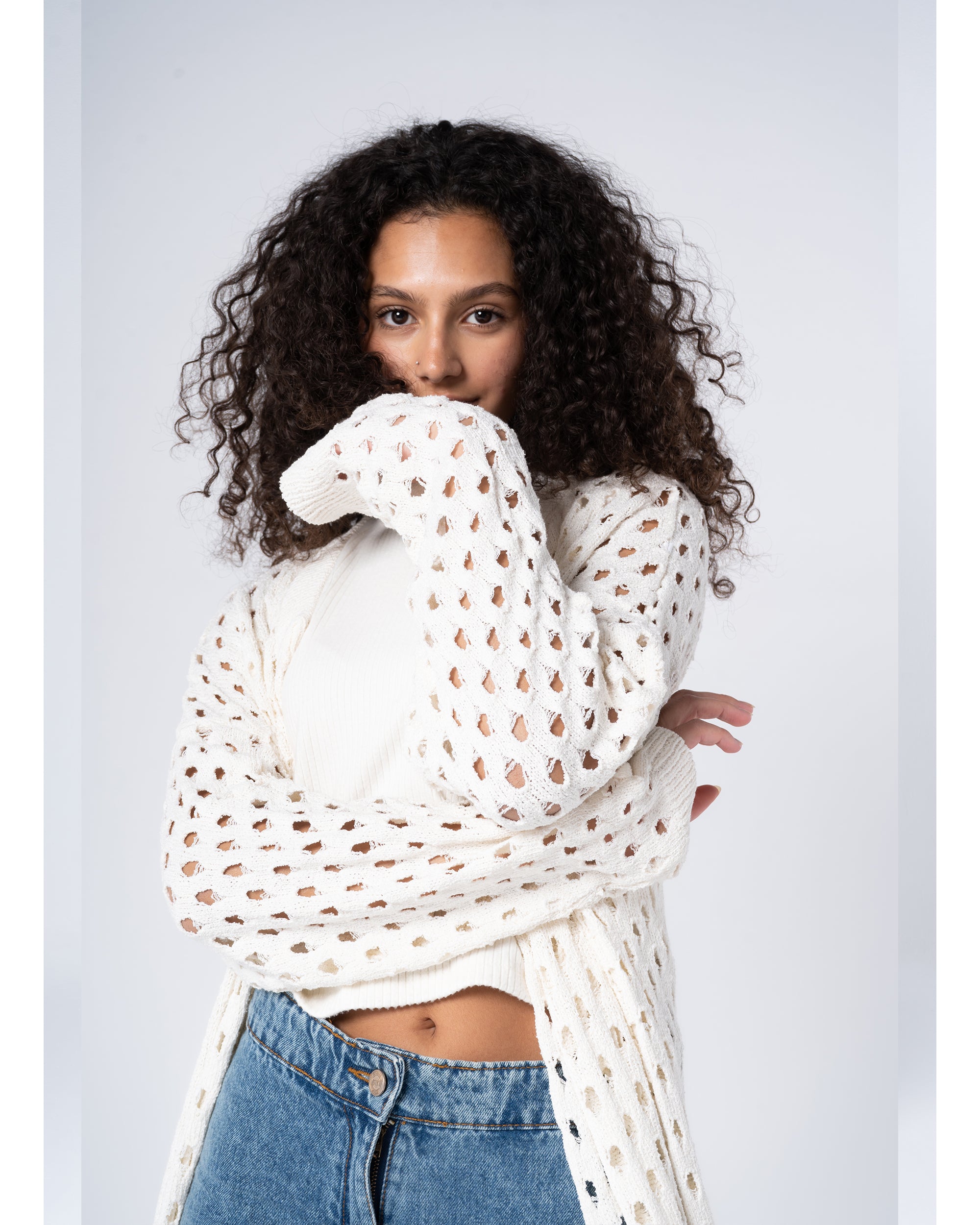 Delicate openwork details lend an elegant, airy feel to this off-white cardigan for women. The lightweight, breathable fabric ensures all-day comfort, while the relaxed, open-front silhouette creates a stylish, layering piece. This versatile cardigan can be dressed up or down to suit any occasion.
