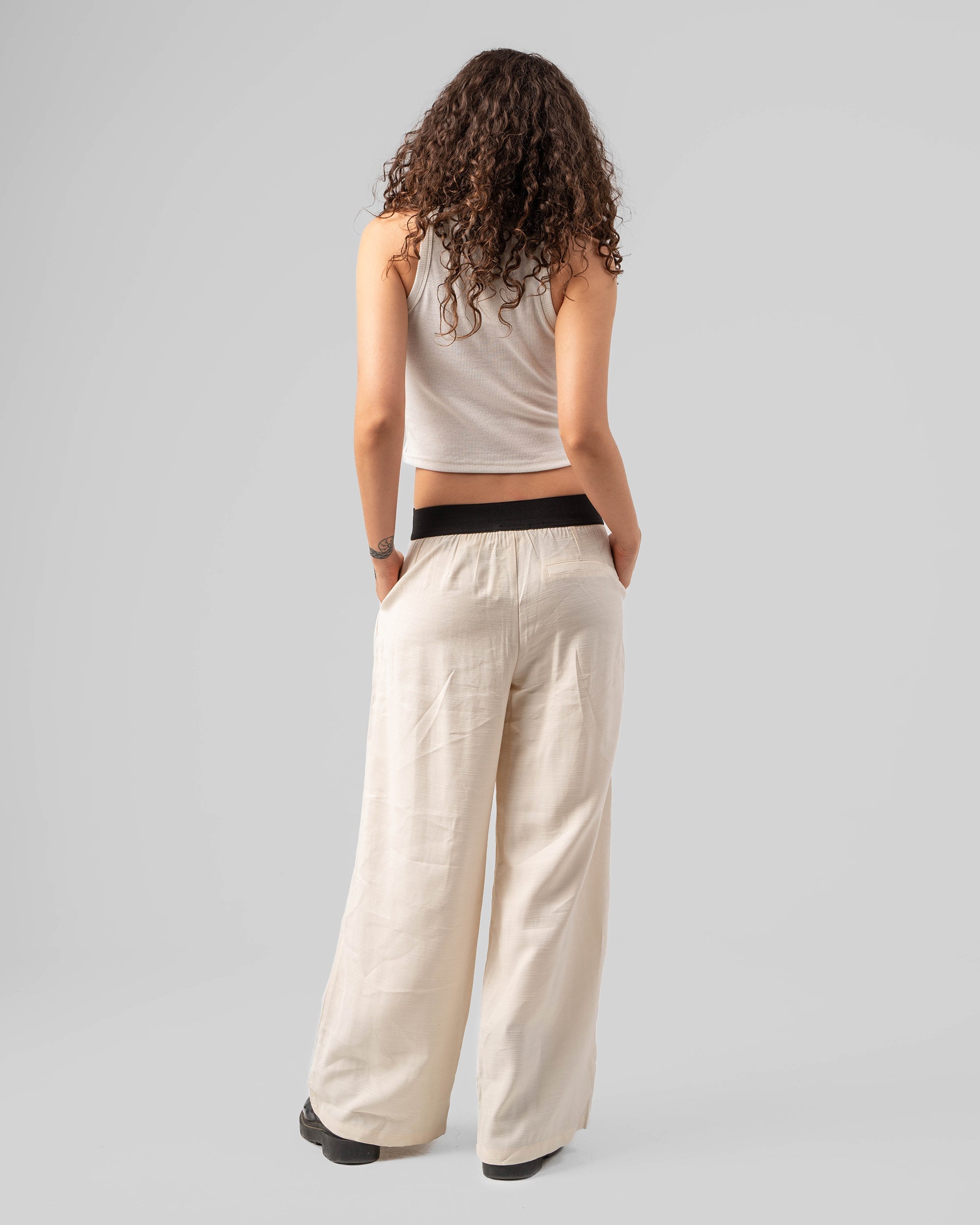 Elevate your casual wardrobe with these wide-leg relaxed fit trousers in a sophisticated cream shade. Crafted from lightweight and breathable fabric, these trousers offer comfort and style for effortless everyday wear. The elastic waistband with a contrasting black accent provides a modern touch and a secure fit, while the flowy silhouette ensures ease of movement.