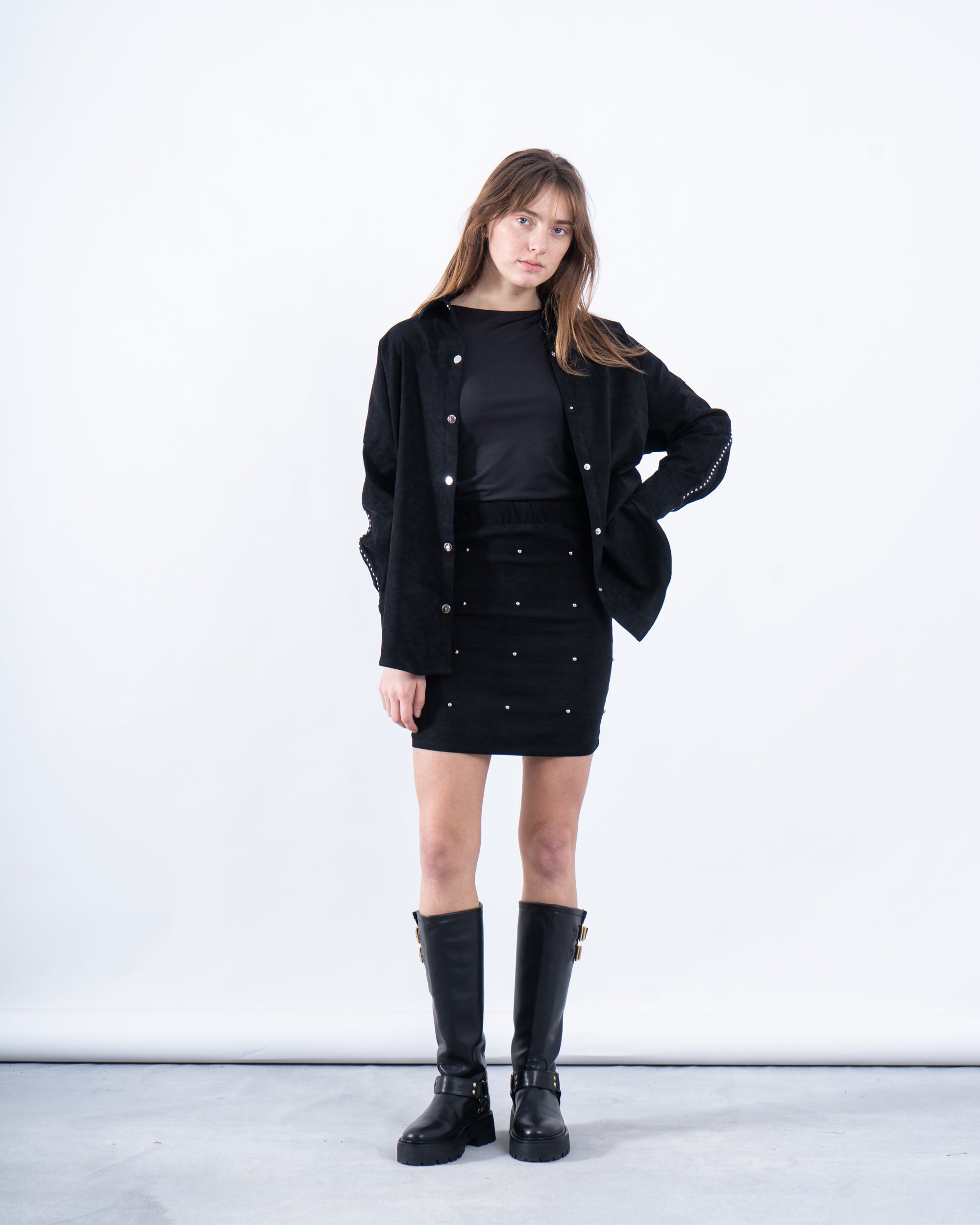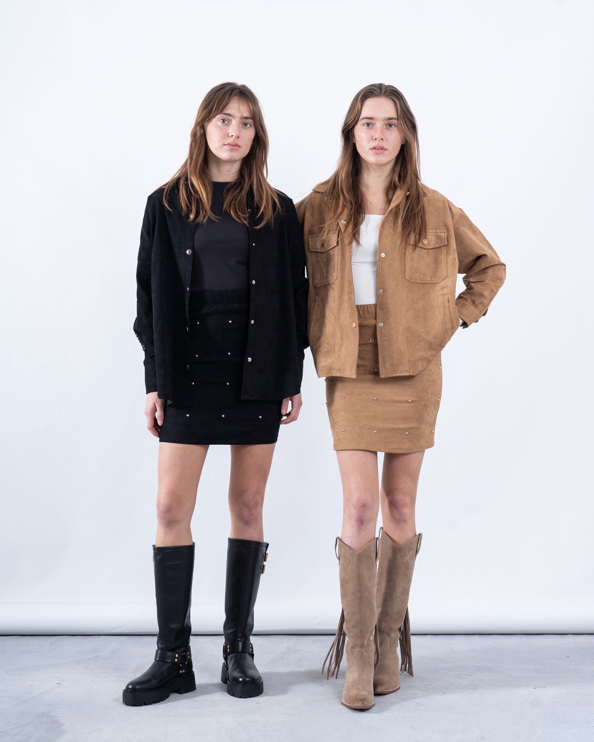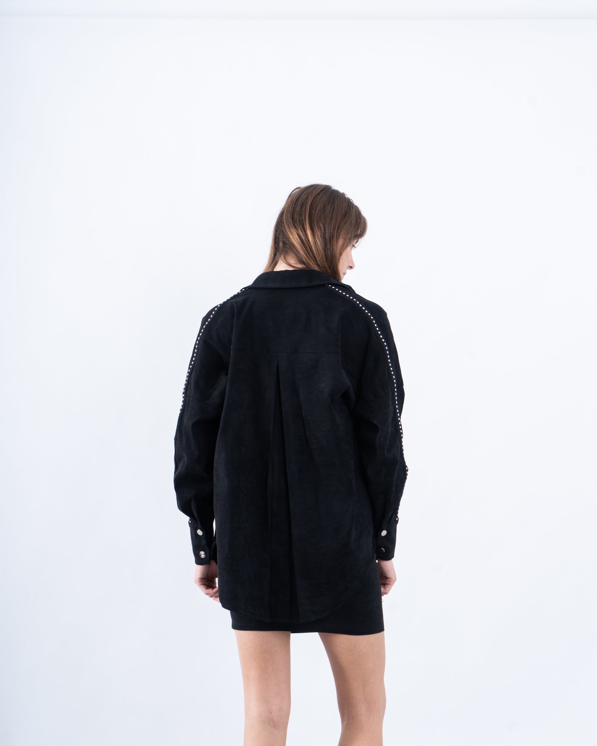 Elevate your layering game with this chic suede button-up shirt, perfect for transitional seasons. Its lightweight construction and stylish striped detailing make it a versatile wardrobe staple.