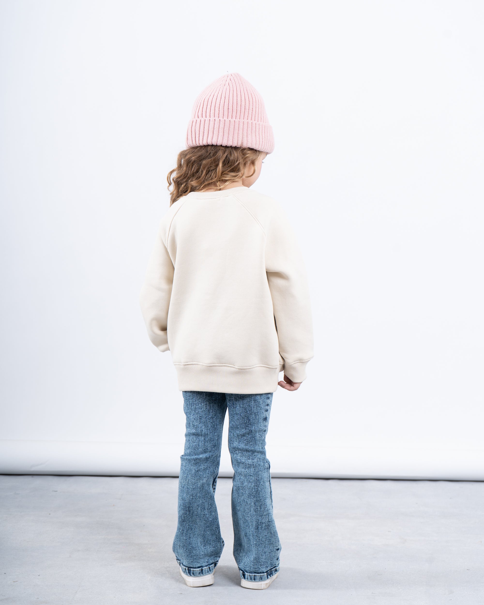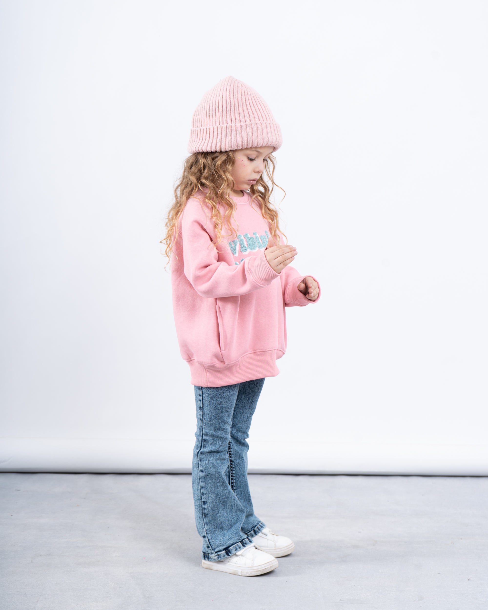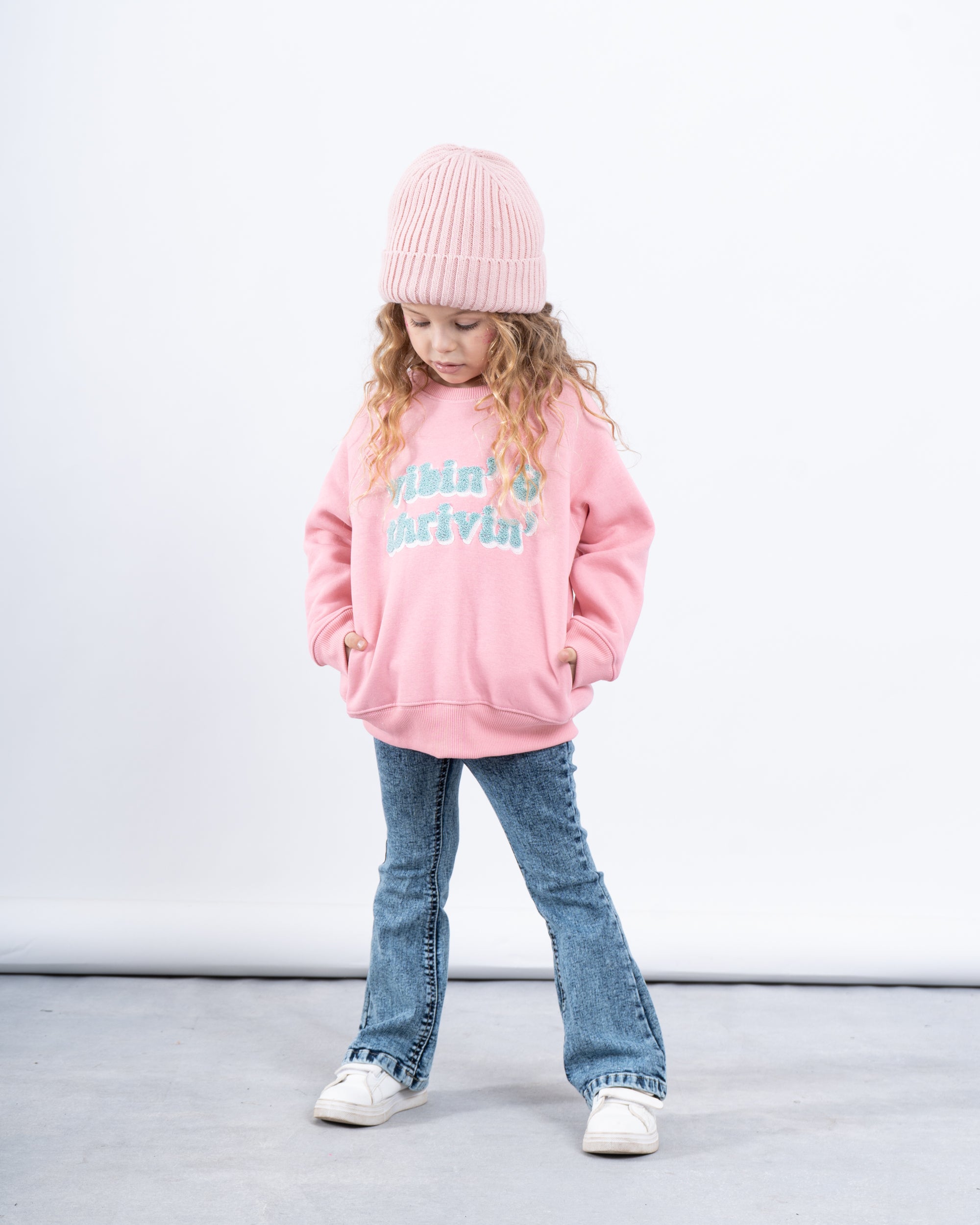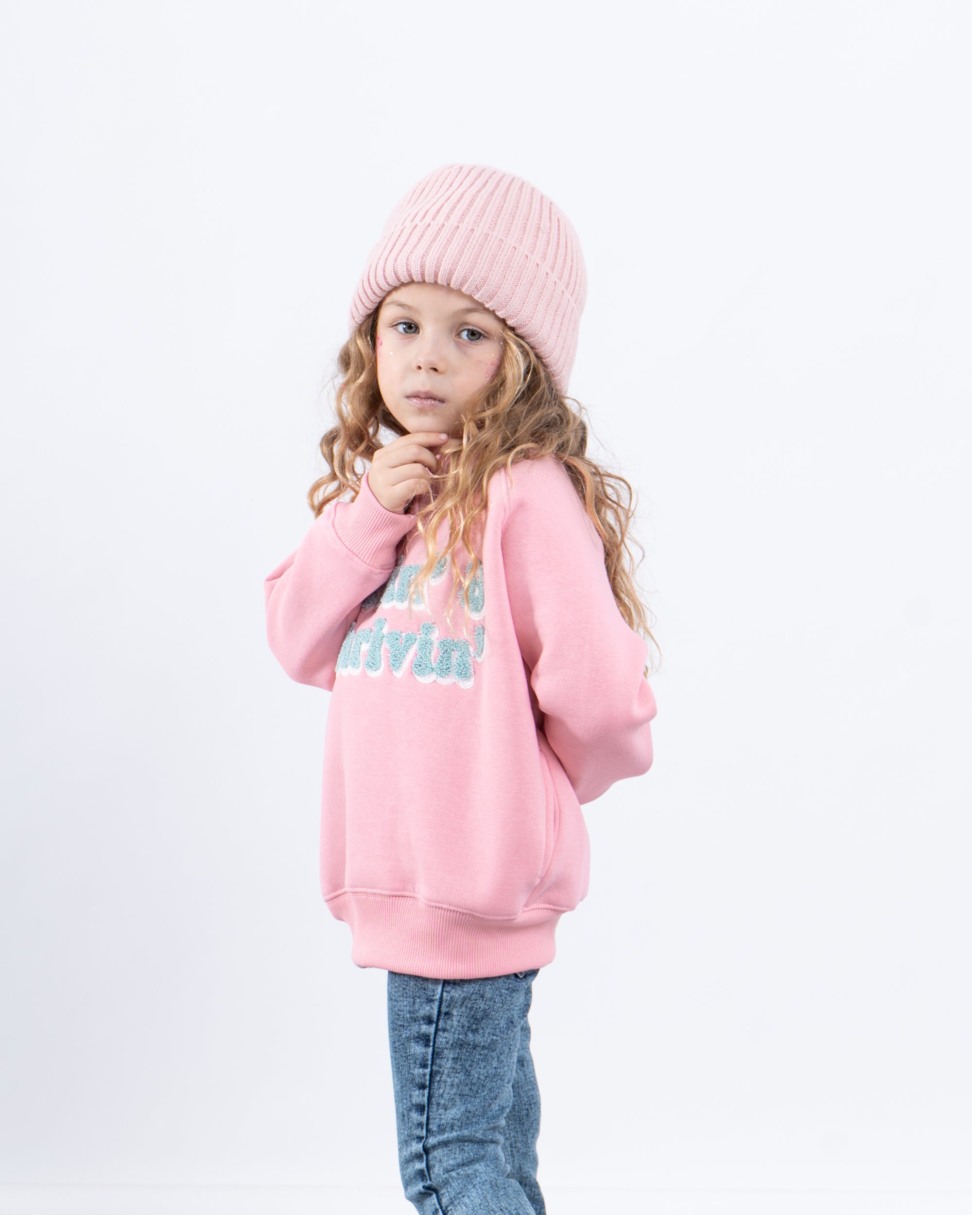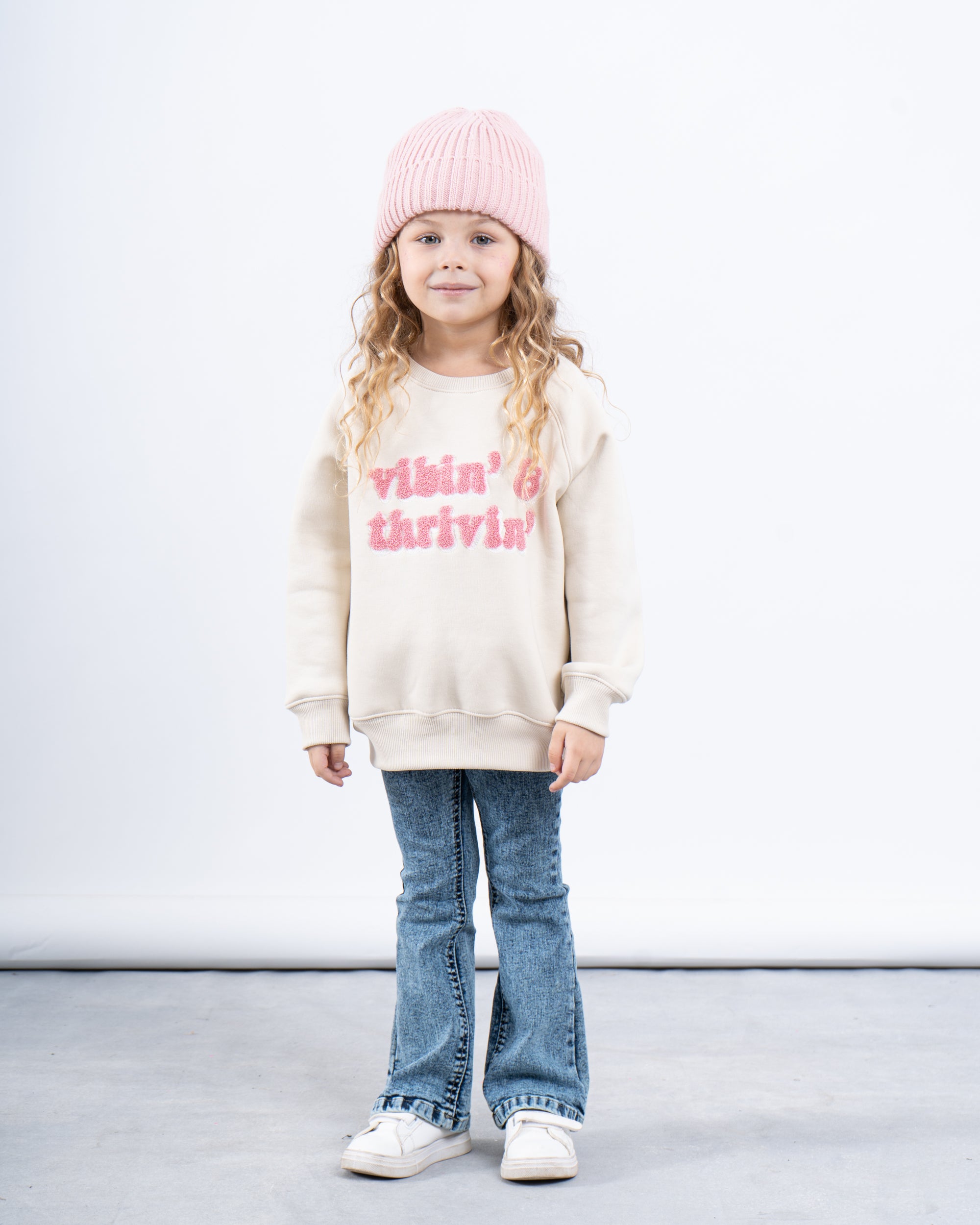 Keep your little one warm and stylish with this “Vibin’ & Thrivin’” fleece-lined sweatshirt. Featuring a bold chenille-textured slogan and a relaxed fit, this cozy piece is perfect for cooler days. Made from soft fabric with a fleece interior, it combines comfort and style effortlessly. Available in cream and pink for versatile styling options.