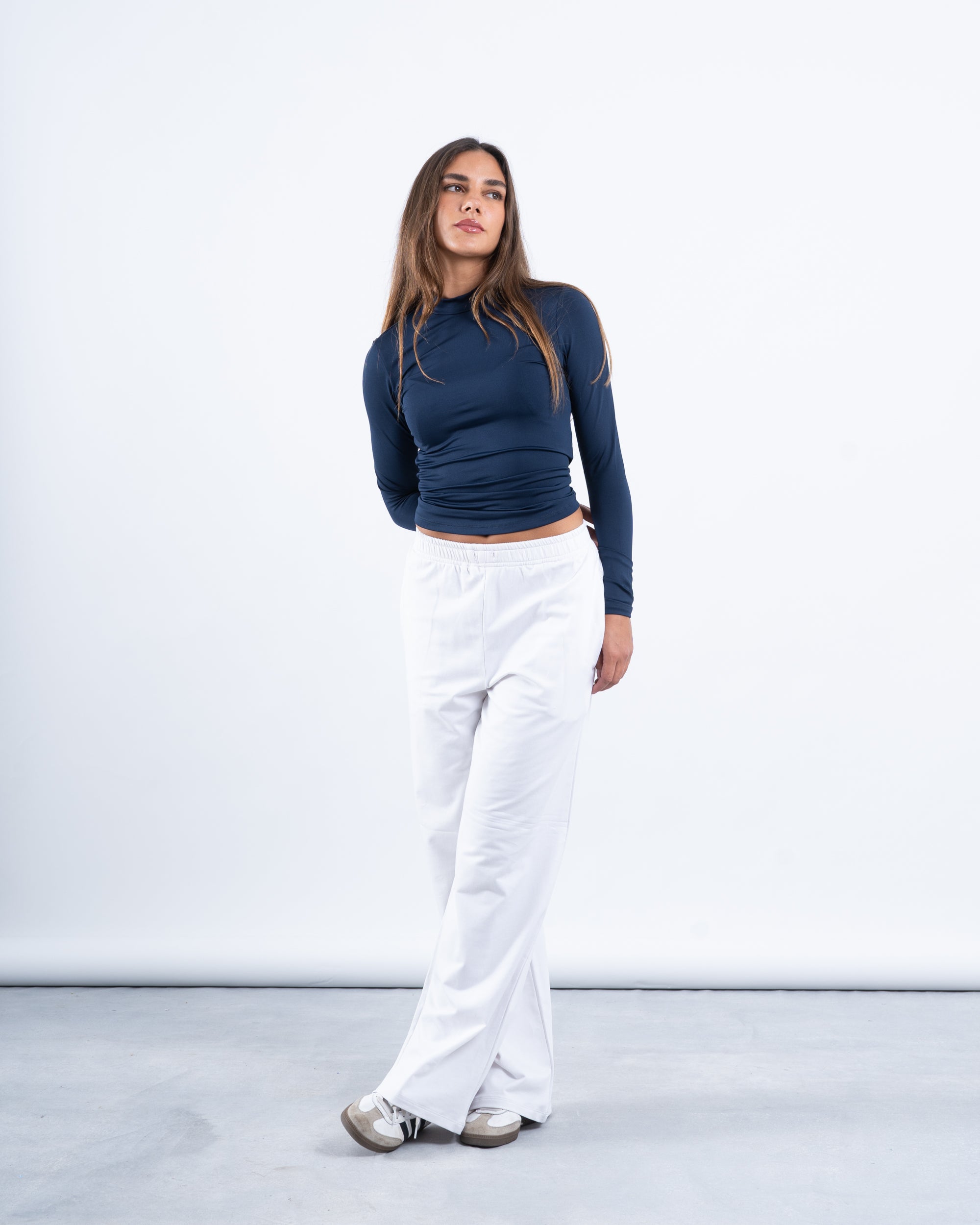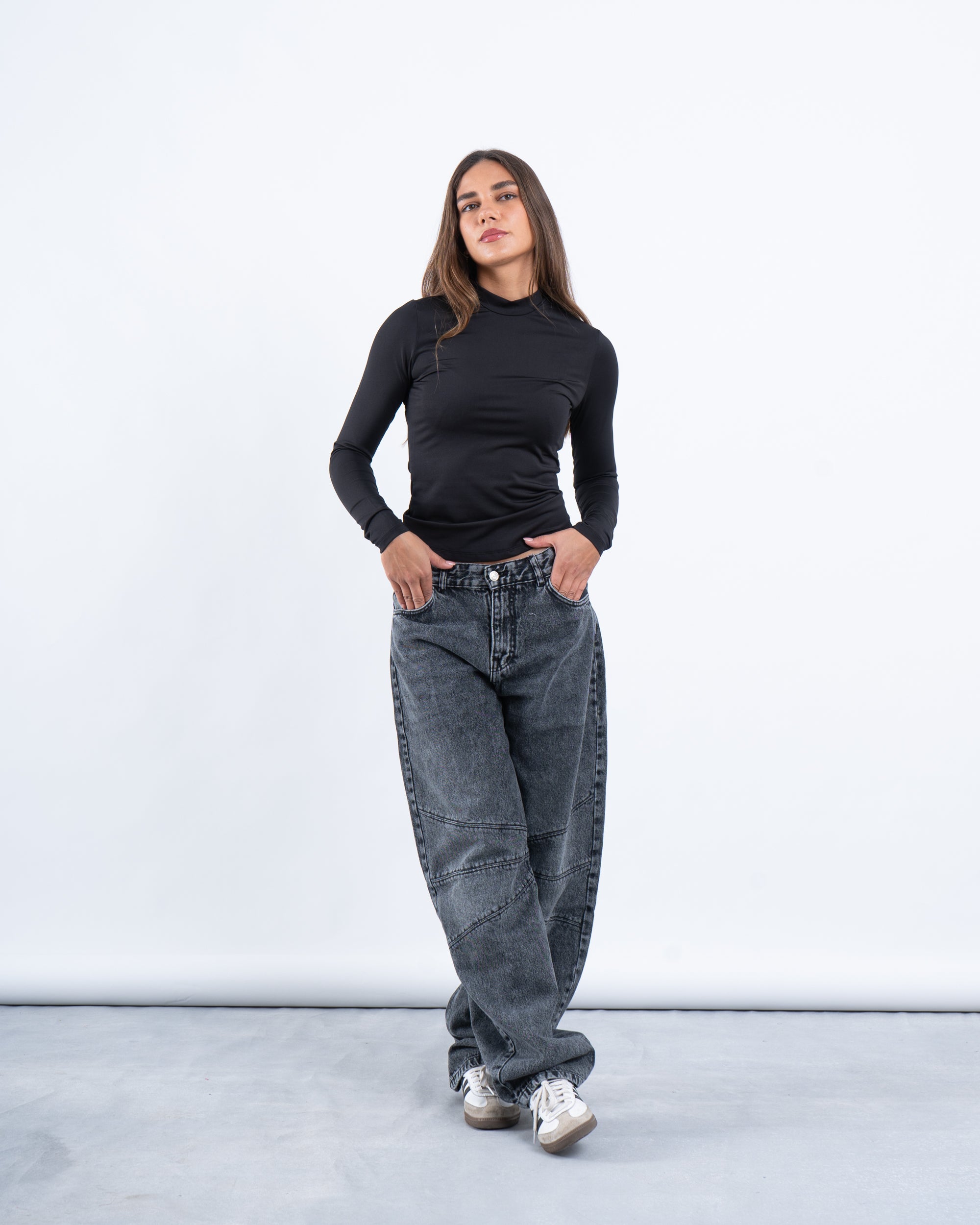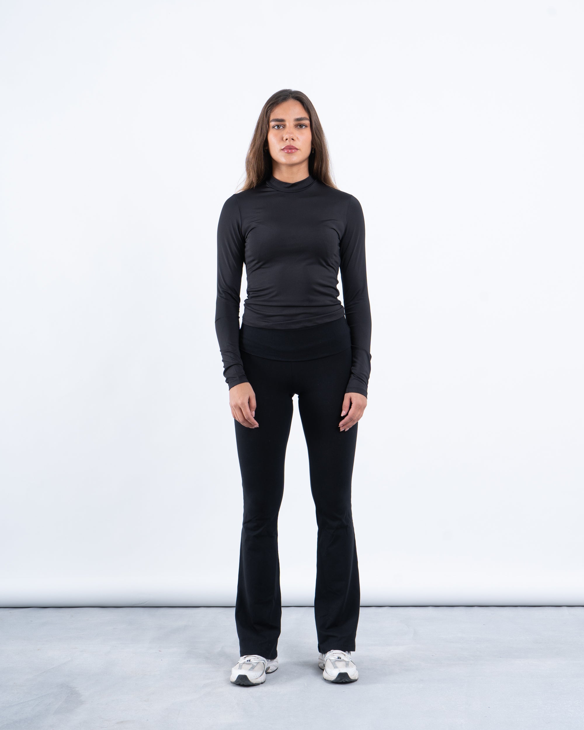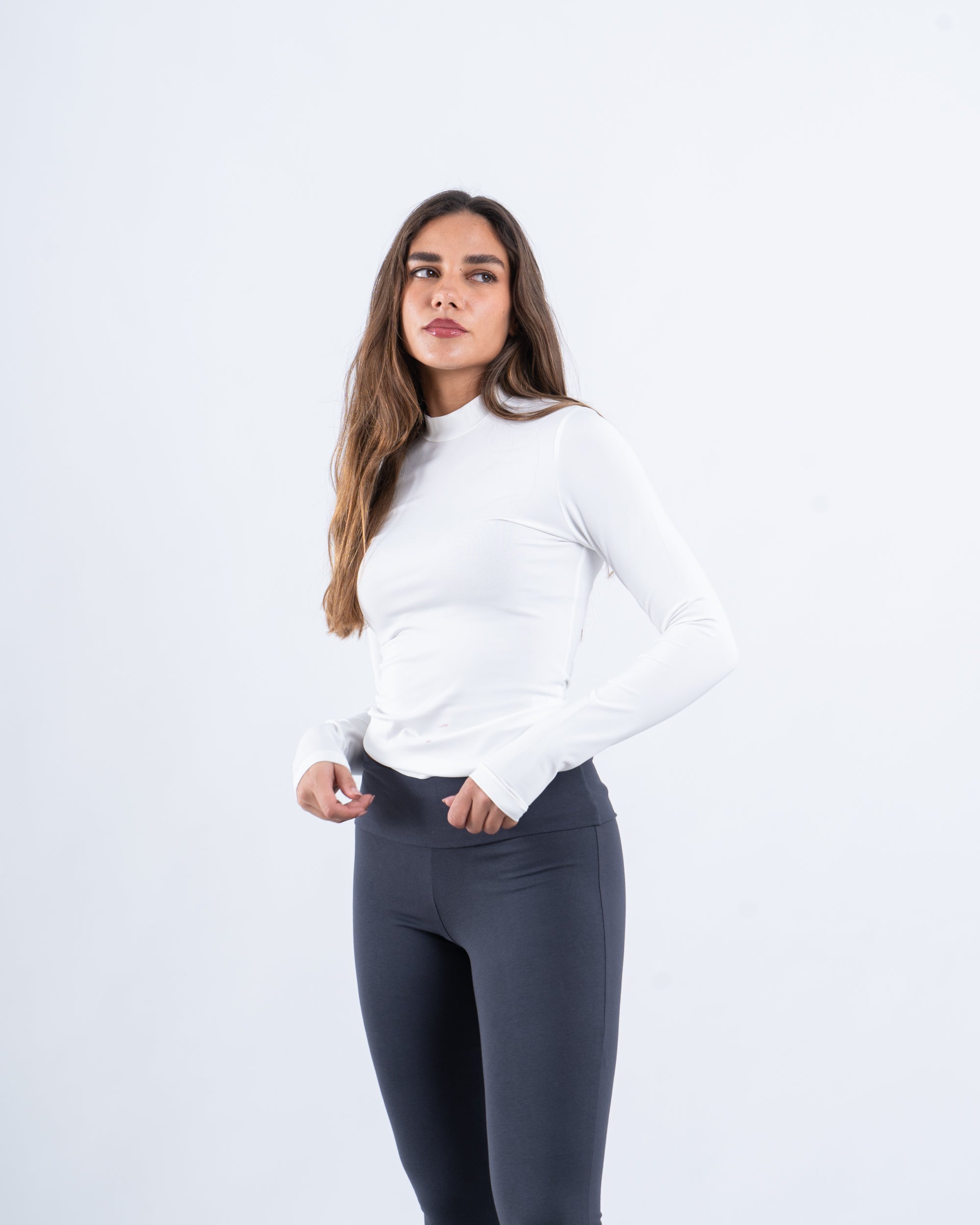 • Fit: Fitted design with a high neckline and long sleeves, creating a streamlined silhouette.