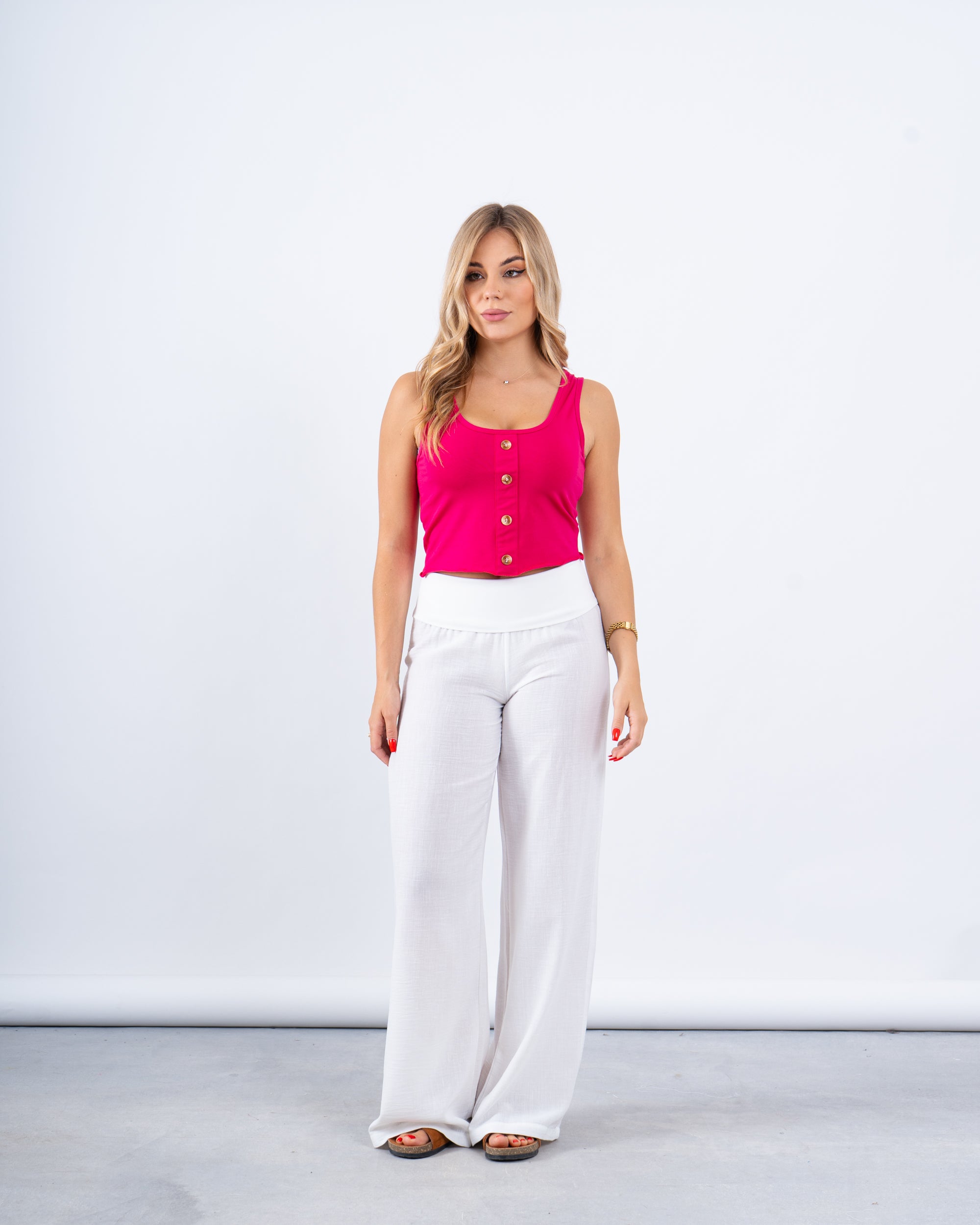 A must-have summer staple — this ribbed crop tank features a soft stretch fabric and front button details for a laid-back yet polished look. Easy to mix and match, it’s your go-to piece for effortless everyday styling.