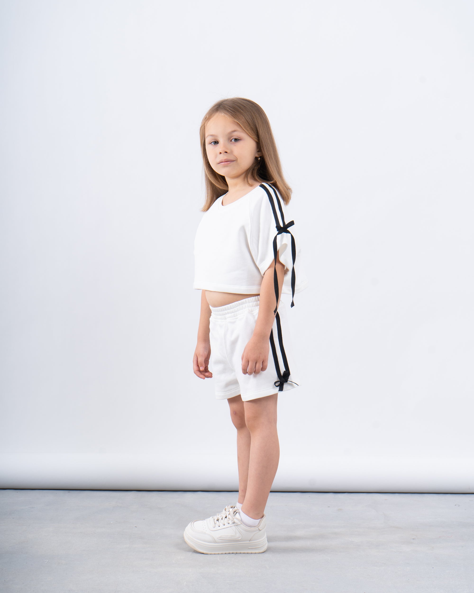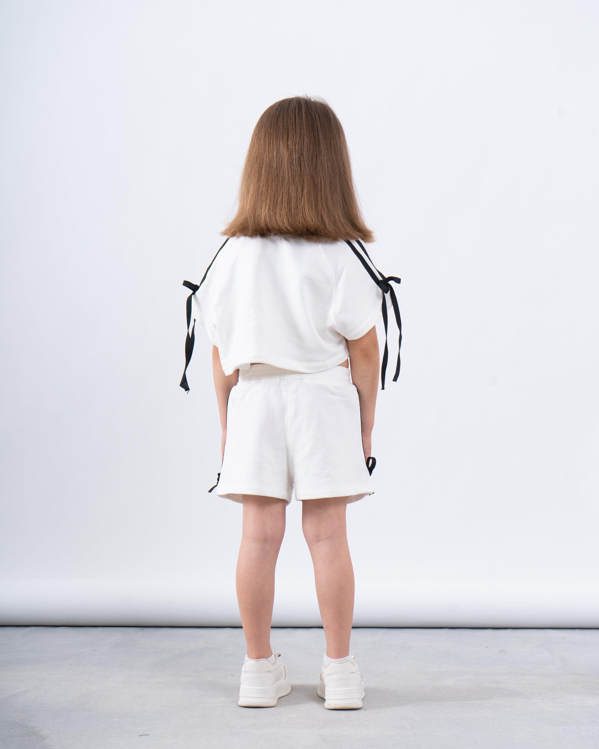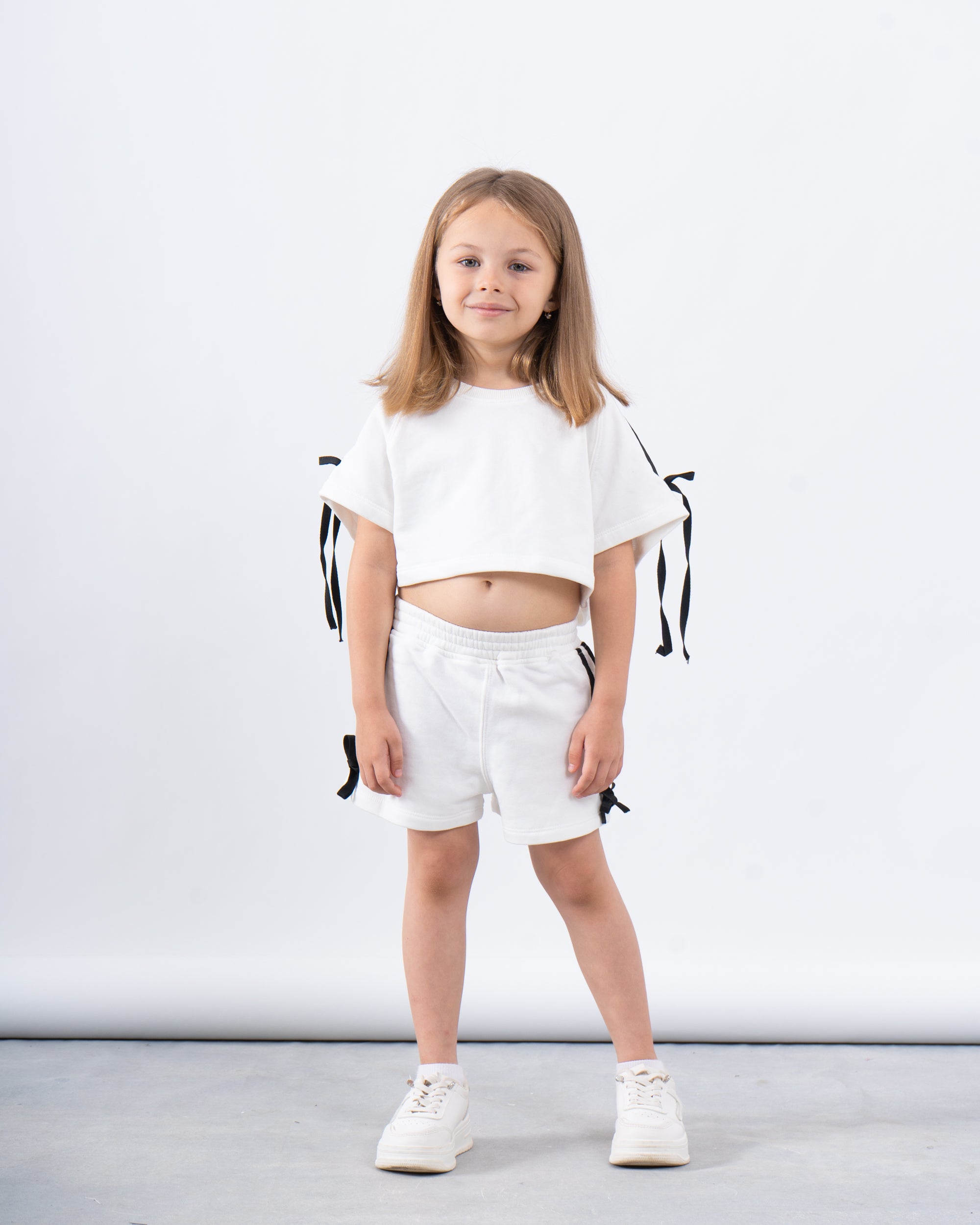 A sporty cropped top with playful ribbon tie details along the sleeves. Lightweight and comfortable, it’s the perfect mix of cute and cool for everyday adventures.
