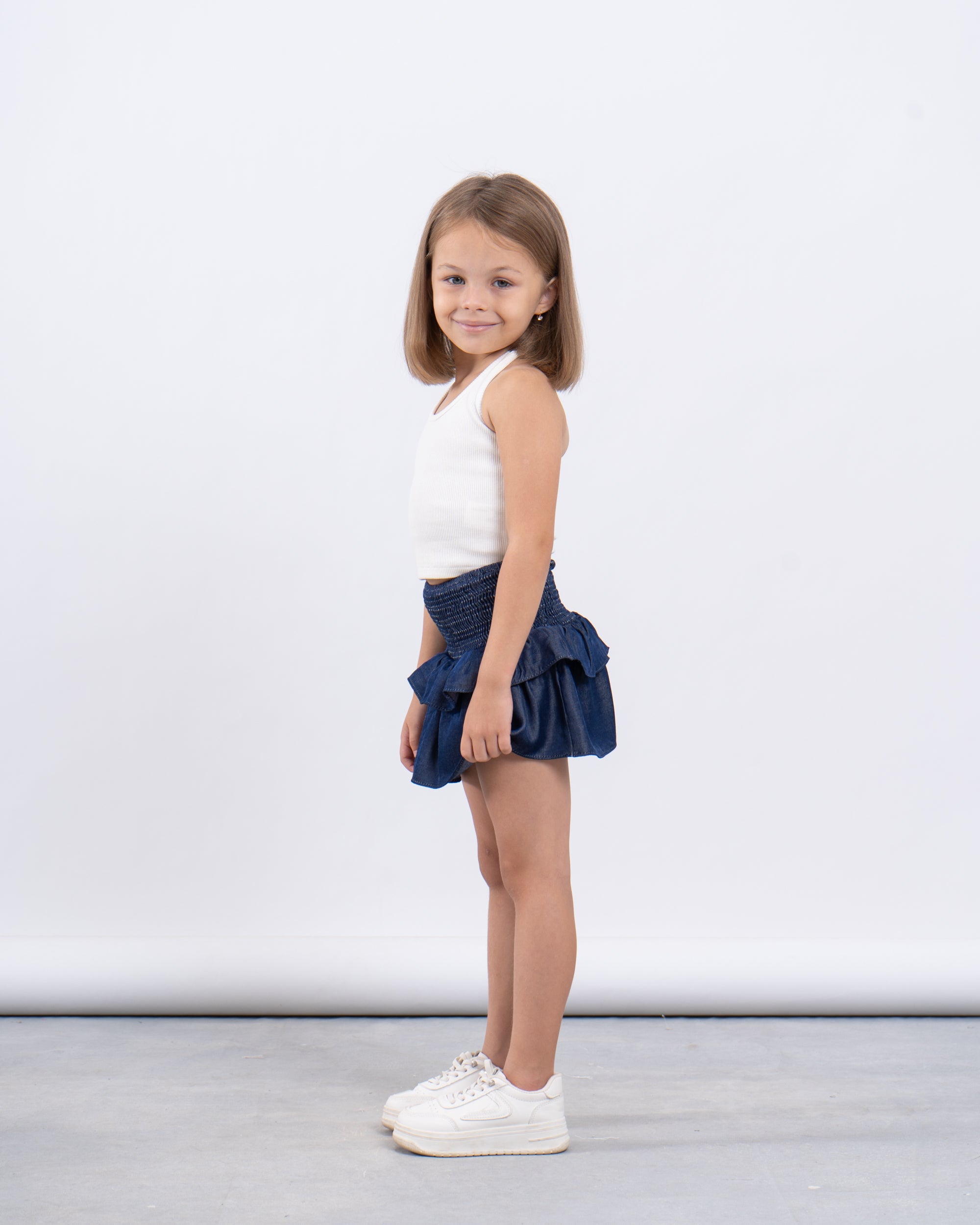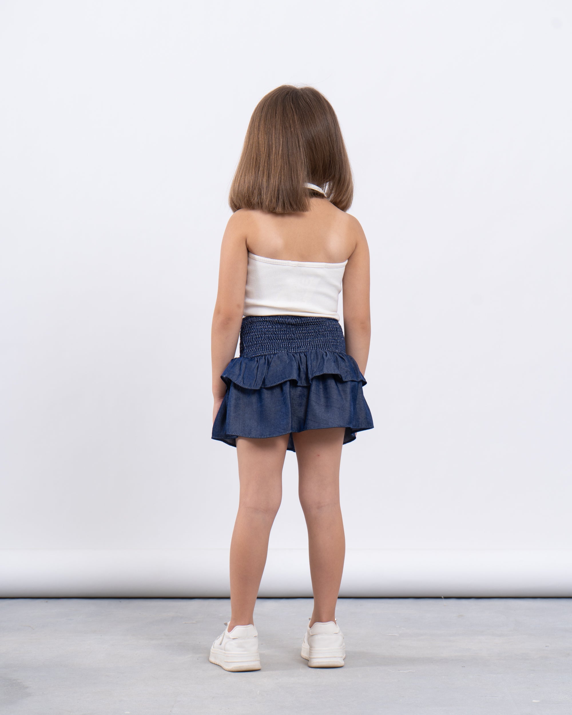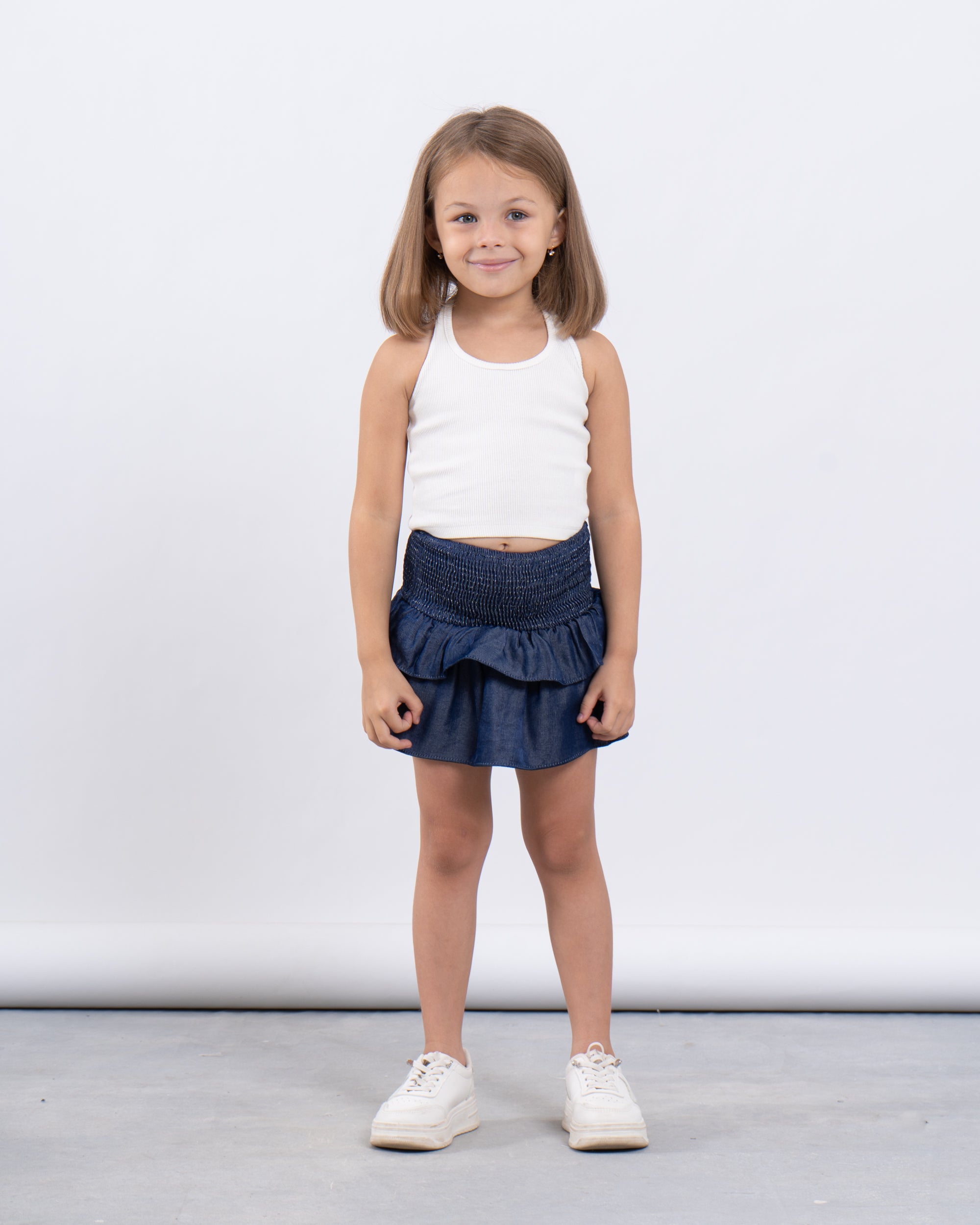 A cute and comfy skirt with a soft denim-look finish, featuring a smocked waistband for all-day comfort and a playful ruffle detail. Perfect for casual days and easy styling.