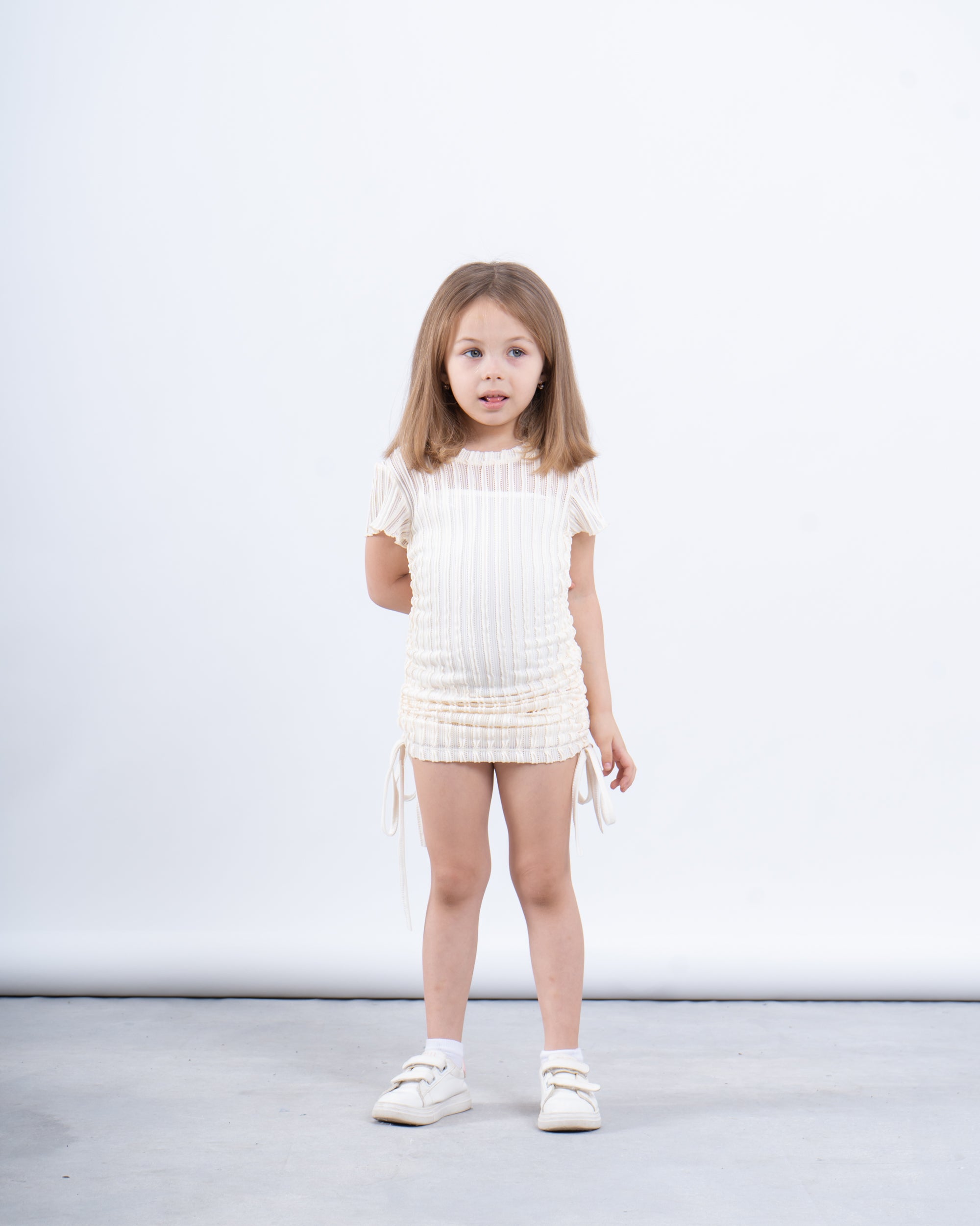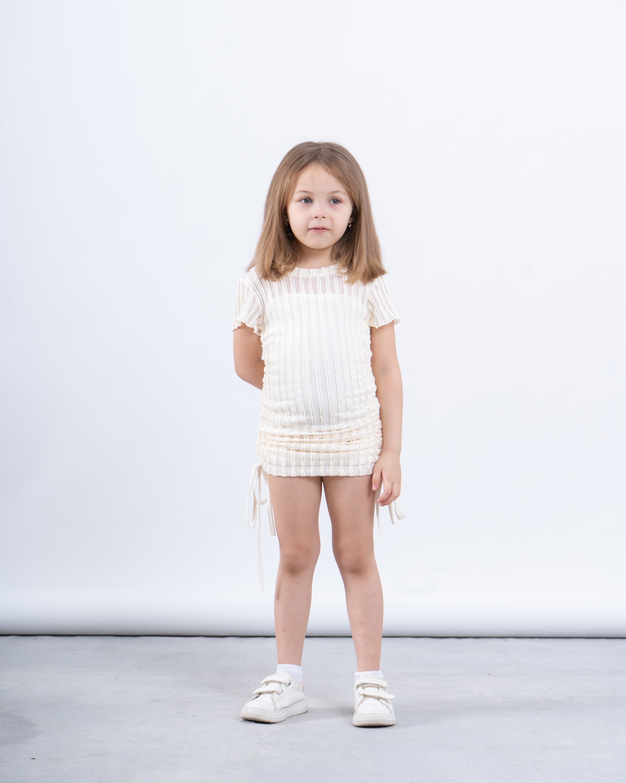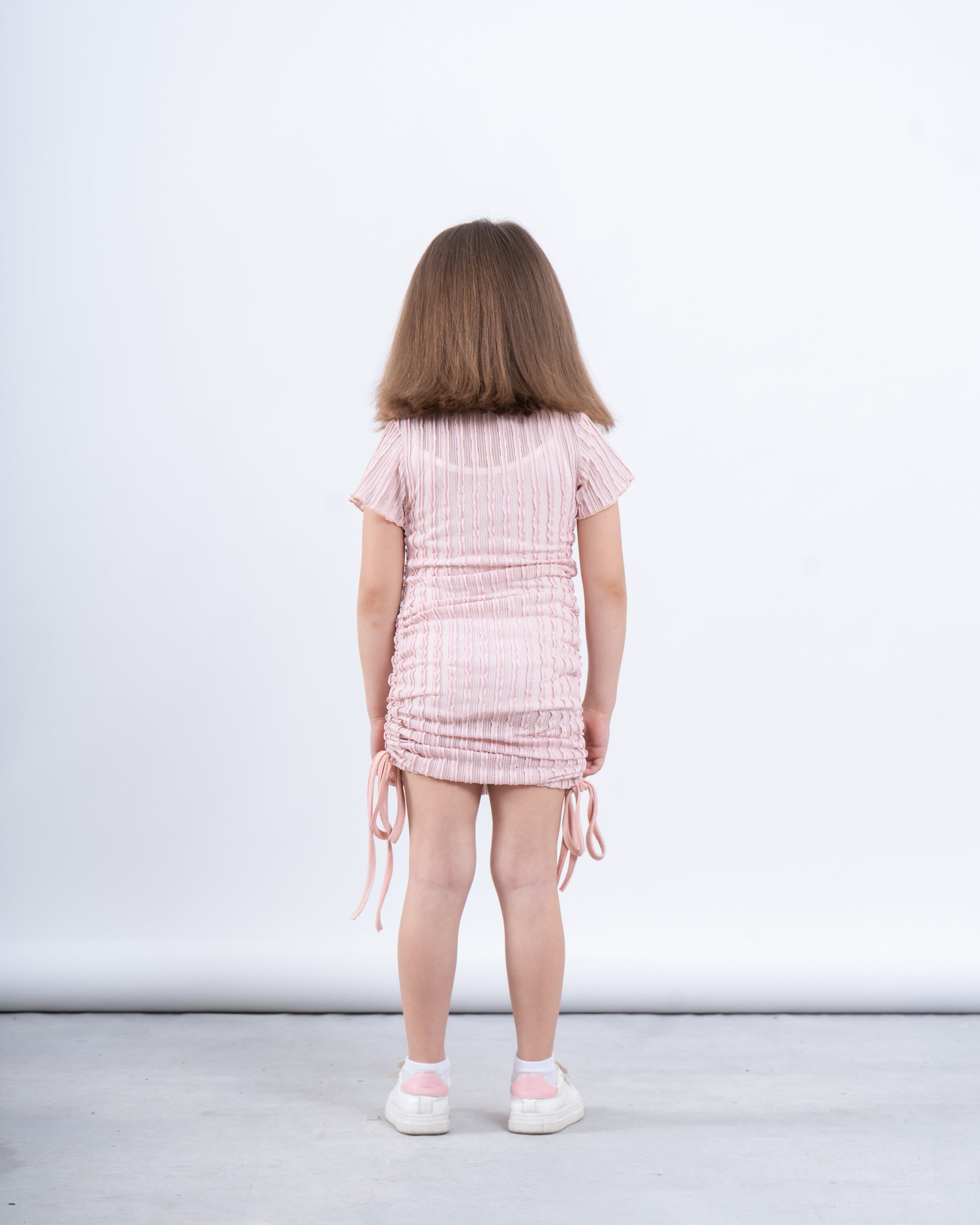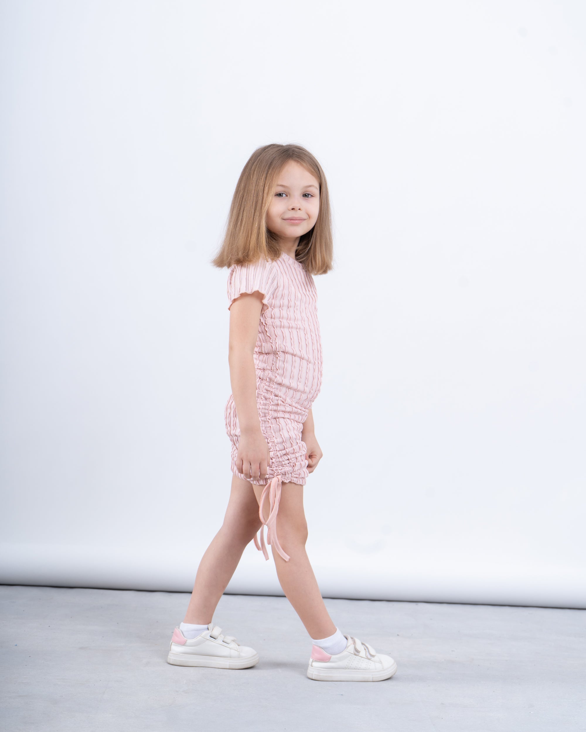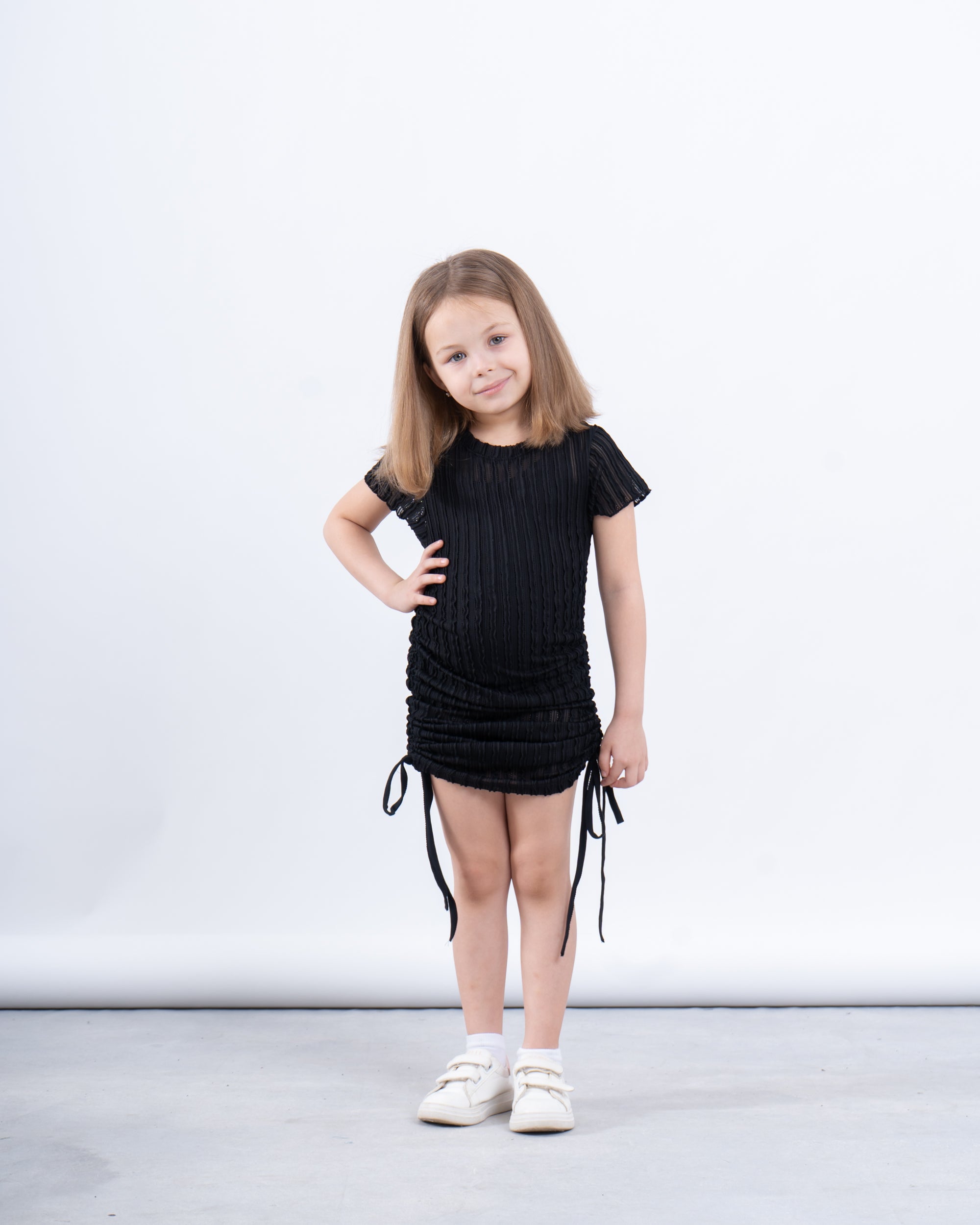 A stylish essential for your little trendsetter! This ribbed ruched dress blends fashion and comfort with its unique crinkled texture and adjustable side drawstrings. Designed with a soft, stretchy fabric, it offers a flattering fit while allowing easy movement for playtime or special occasions. Whether styled casually with sneakers or dressed up with ballet flats, this dress is perfect for any look.
