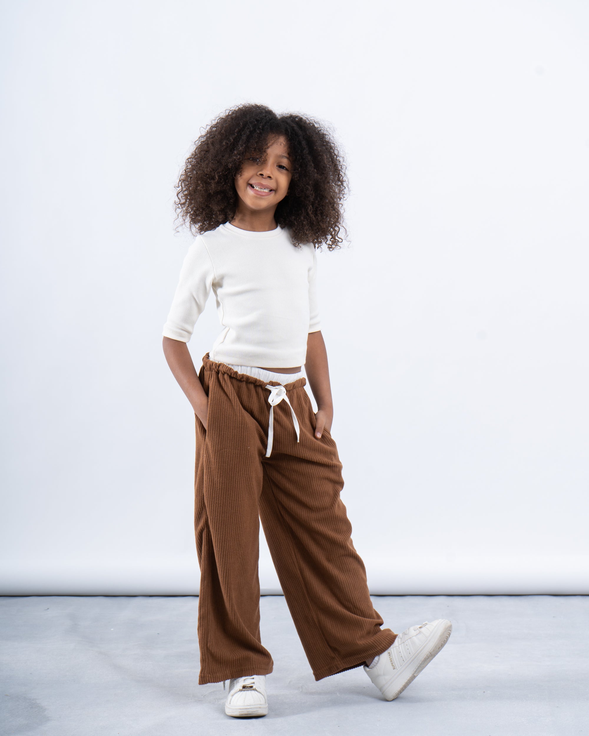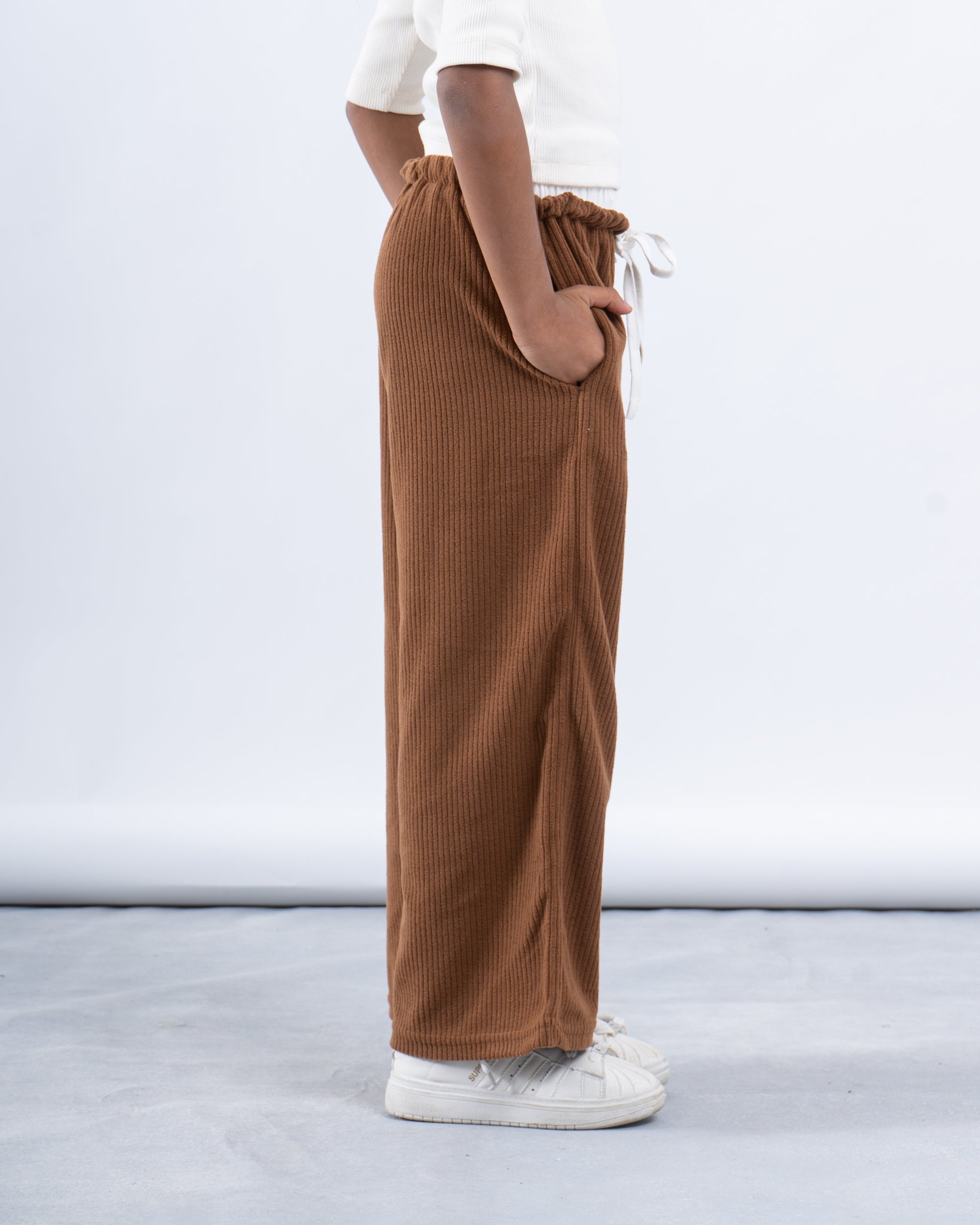 Give their wardrobe a cozy upgrade with these brown ribbed wide-leg pants. Made from soft, textured fabric, these pants offer both style and comfort, perfect for lounging or casual outings. The relaxed wide-leg fit and adjustable drawstring waistband make them easy to wear, while the rich brown hue adds a touch of warmth to any outfit. Ideal for pairing with tees, sweaters, or hoodies for a laid-back look.