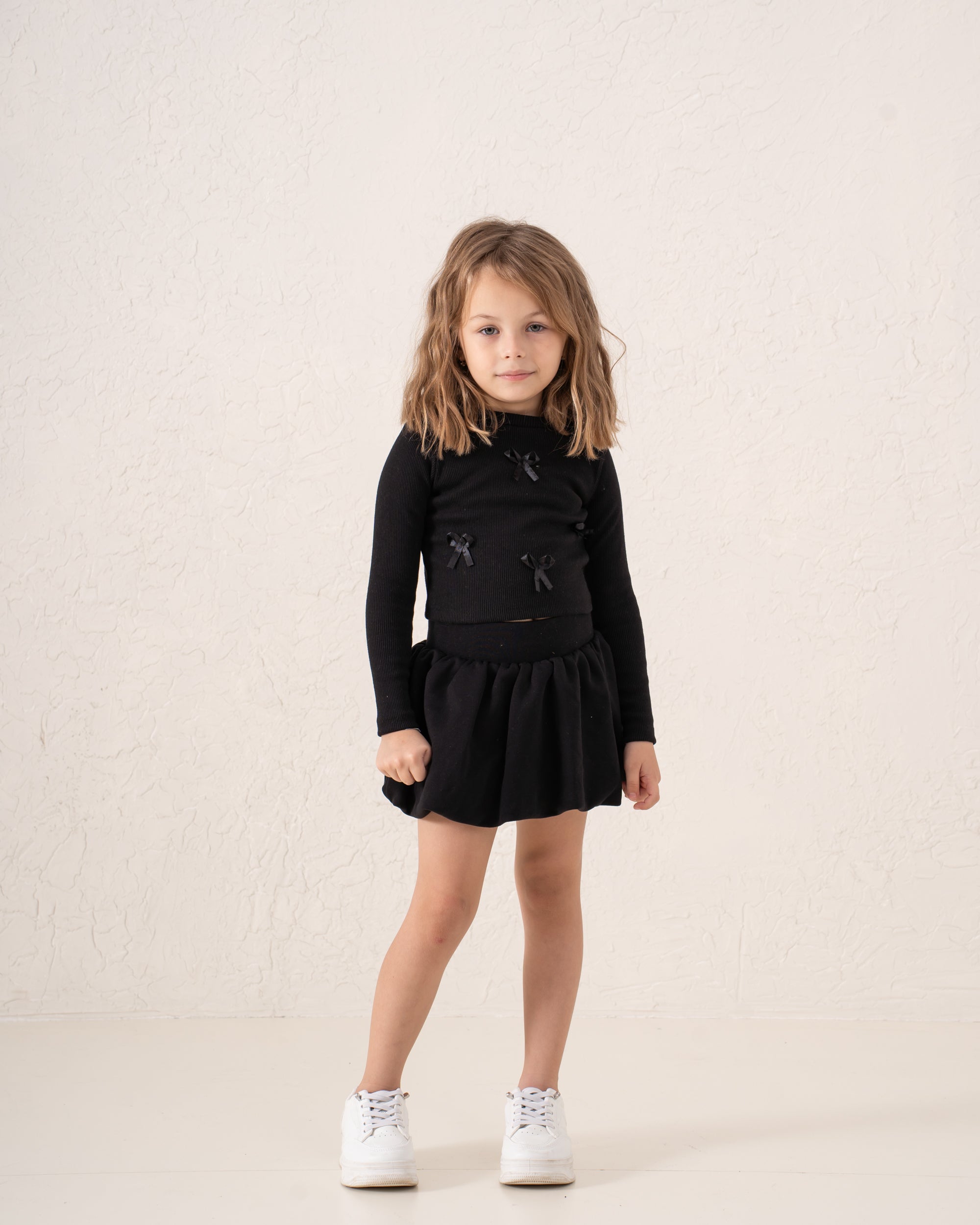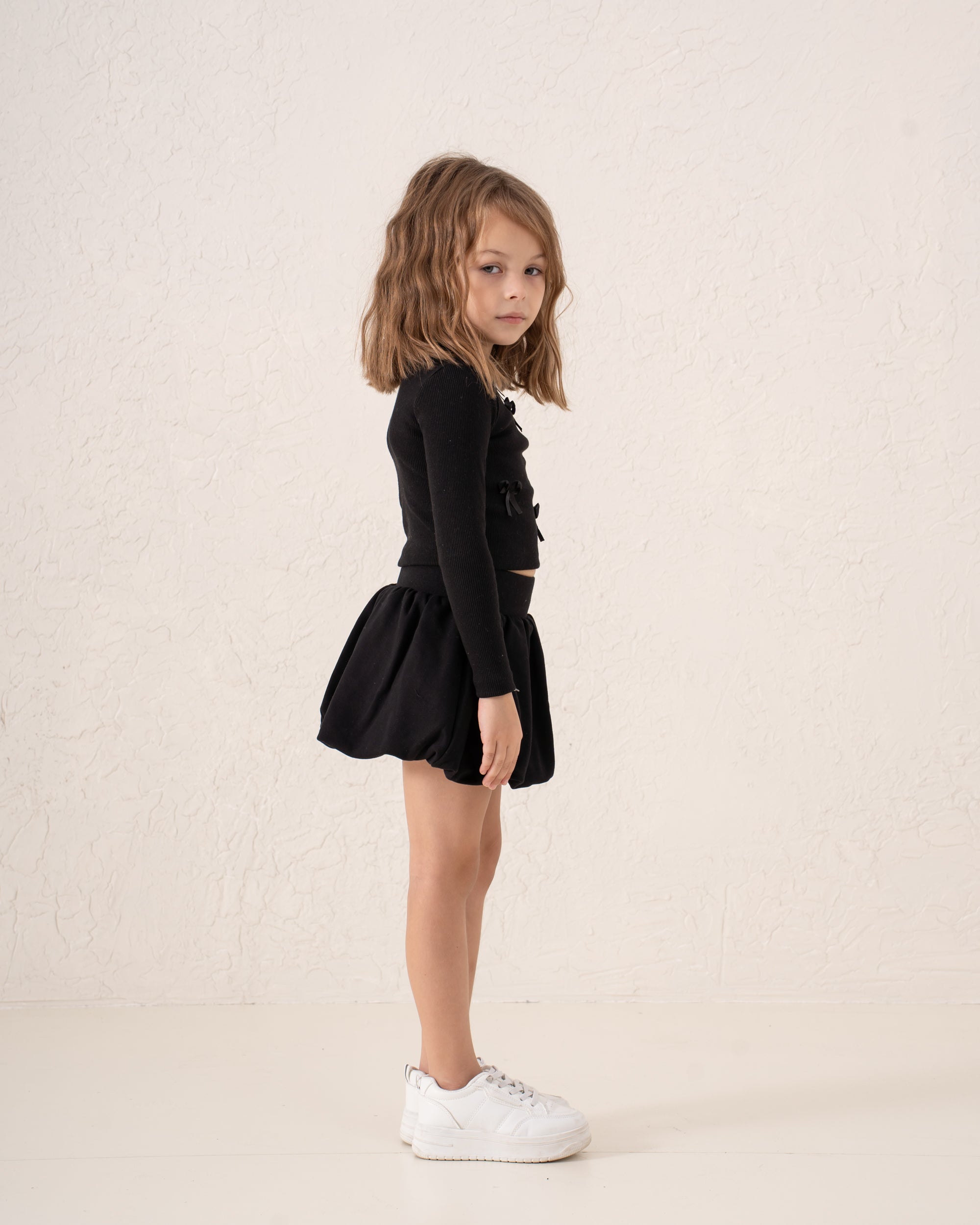 Girly and playful, this puffball skirt features a comfortable ribbed waistband and a voluminous bubble silhouette. Perfect for styling with the matching bow top or mixing with other knits.