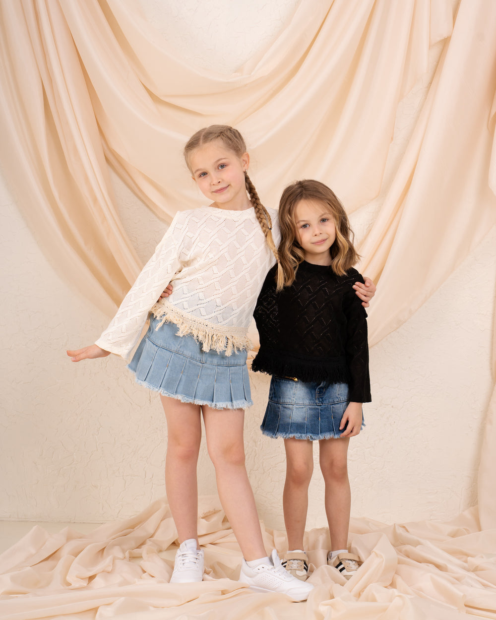 A chic and modern girl's knit top featuring a sophisticated open-shoulder design and a unique pointelle pattern.