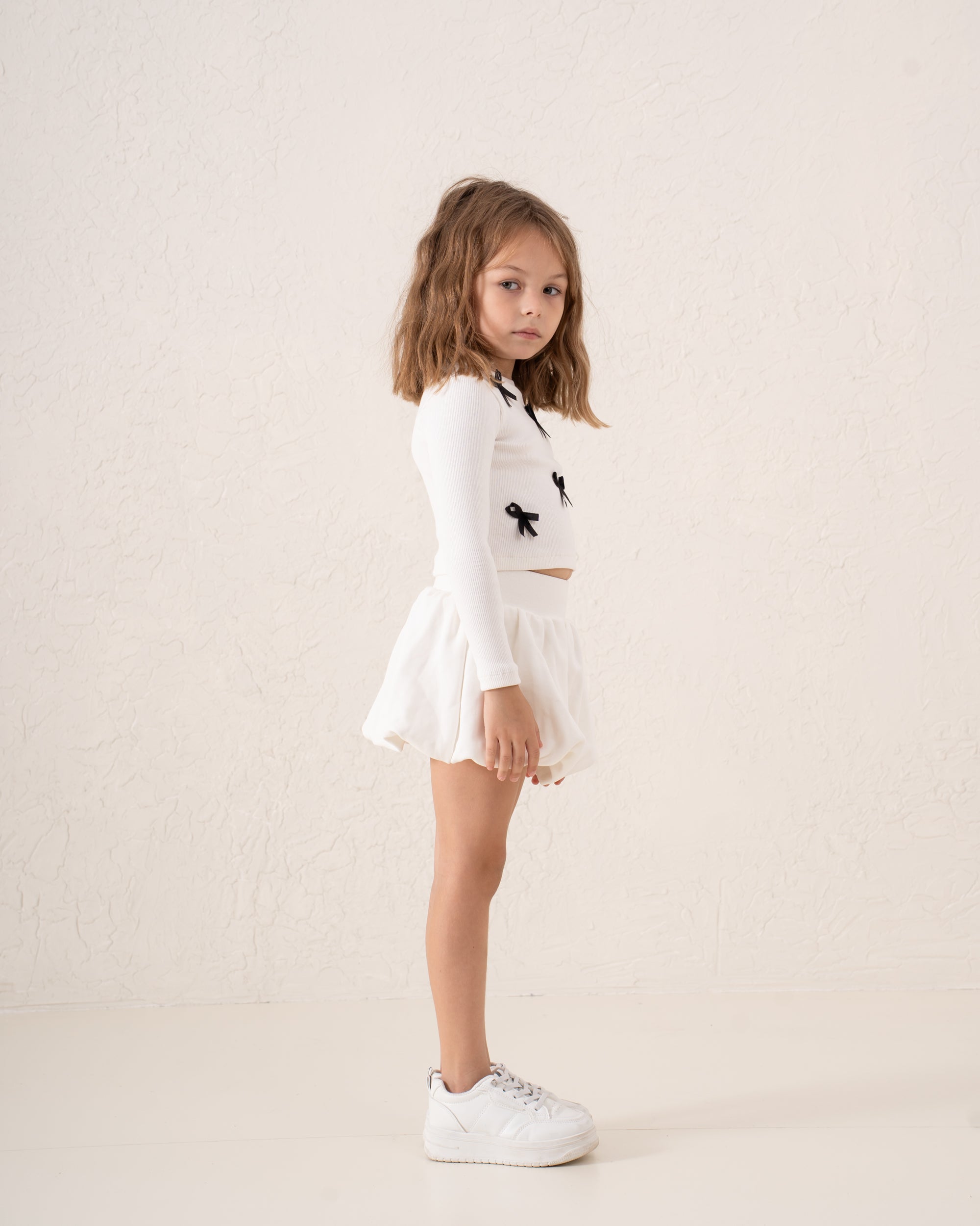 Playful and feminine, this ribbed knit top is decorated with delicate bow appliqués for a sweet yet chic look. Designed in a slightly cropped cut for easy pairing with high-waist bottoms or the matching skirt.