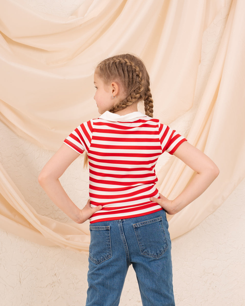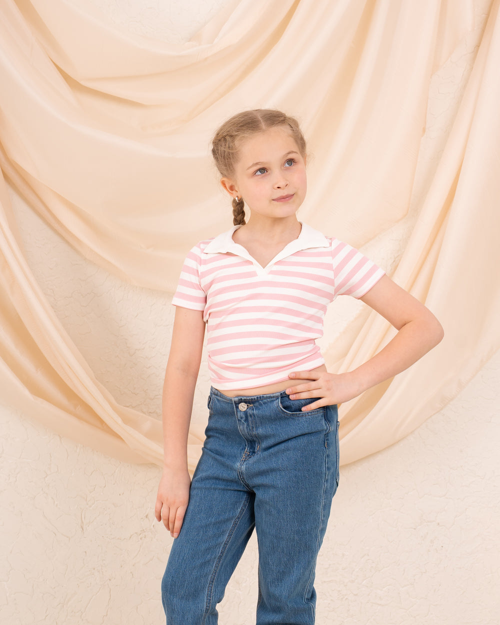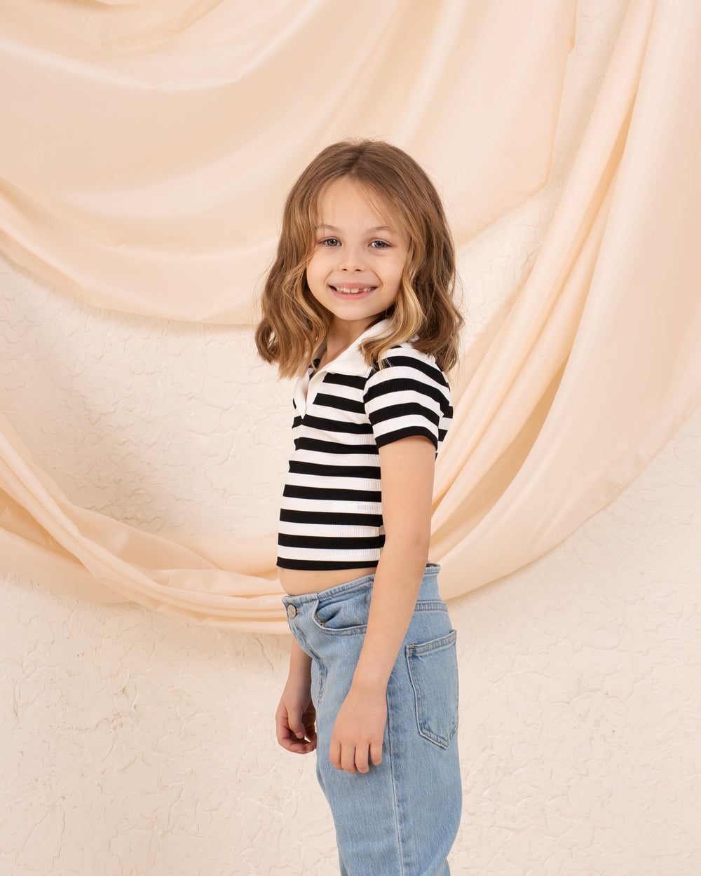 A charming ribbed polo shirt with a soft striped texture, designed for all-day comfort and play.