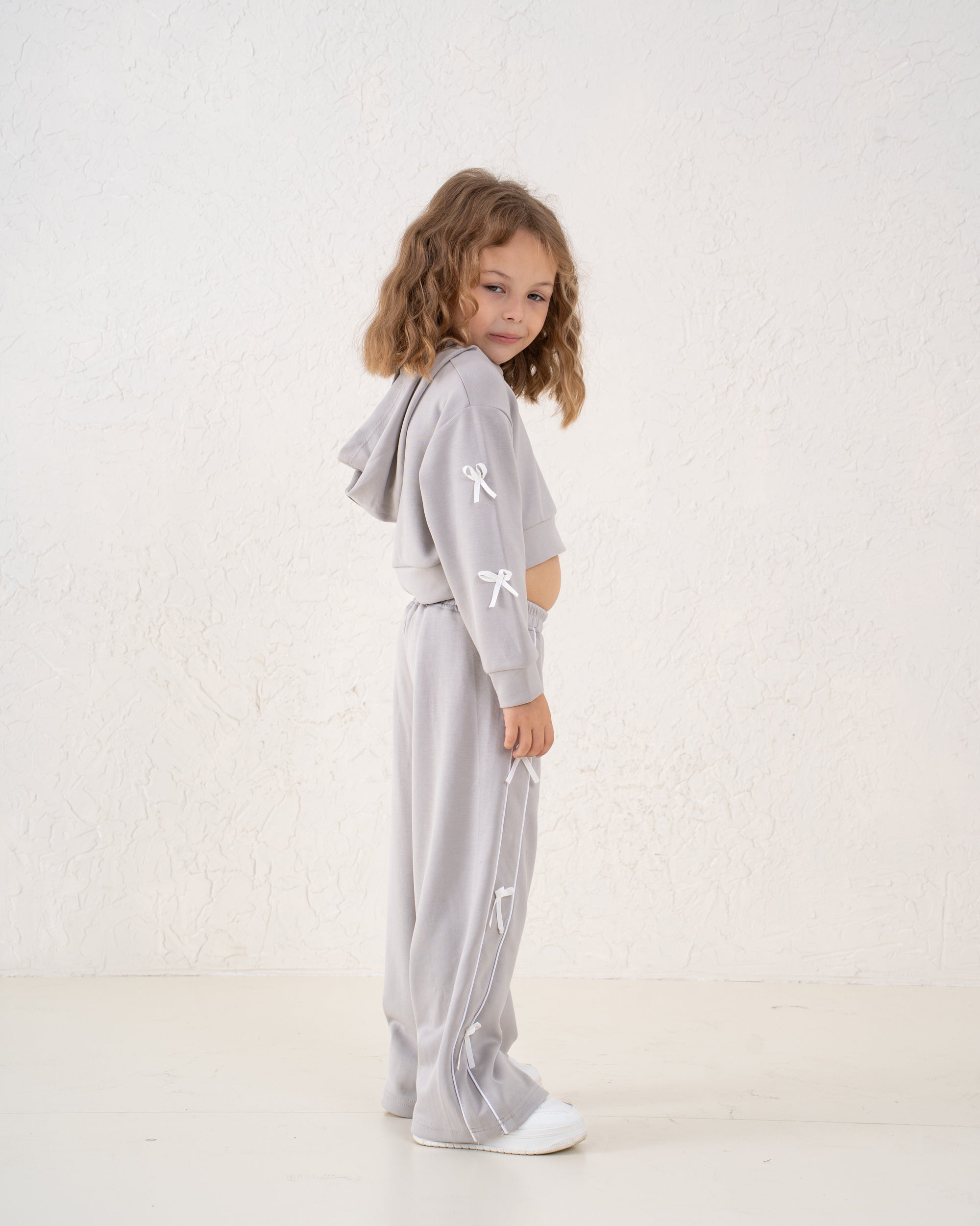 A soft jersey hoodie designed with delicate bow trims along the sleeves for a feminine, playful touch. Lightweight and comfortable with a relaxed silhouette, perfect for matching moments.