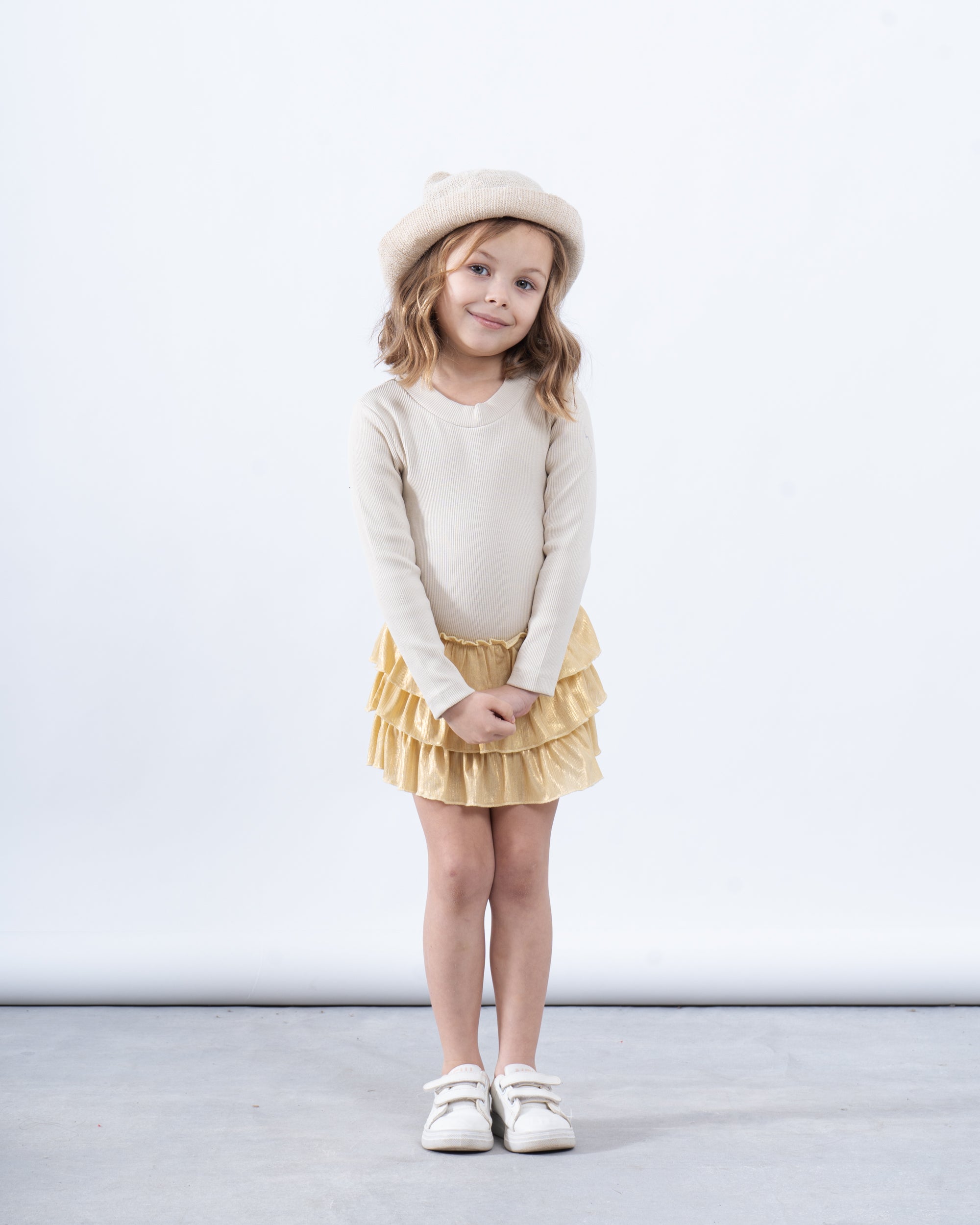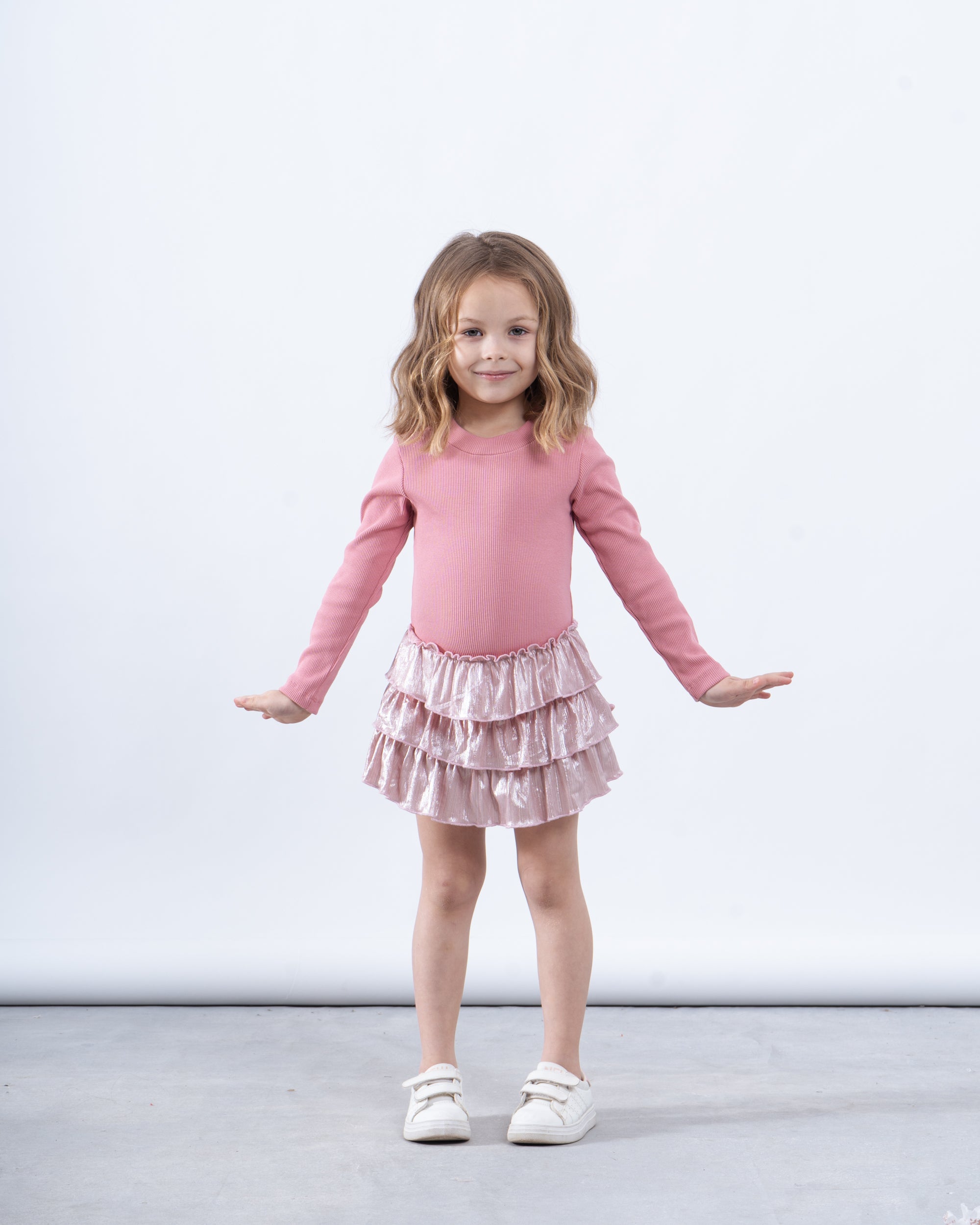 A playful ribbed bodysuit paired with a metallic tiered skirt, offering a sweet yet stylish look for little fashionistas. Designed for comfort and style, the ribbed bodysuit features long sleeves and a snap-button closure, while the layered skirt adds a fun, textured flair.