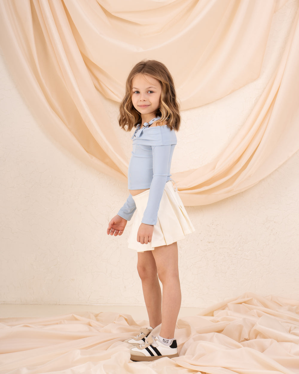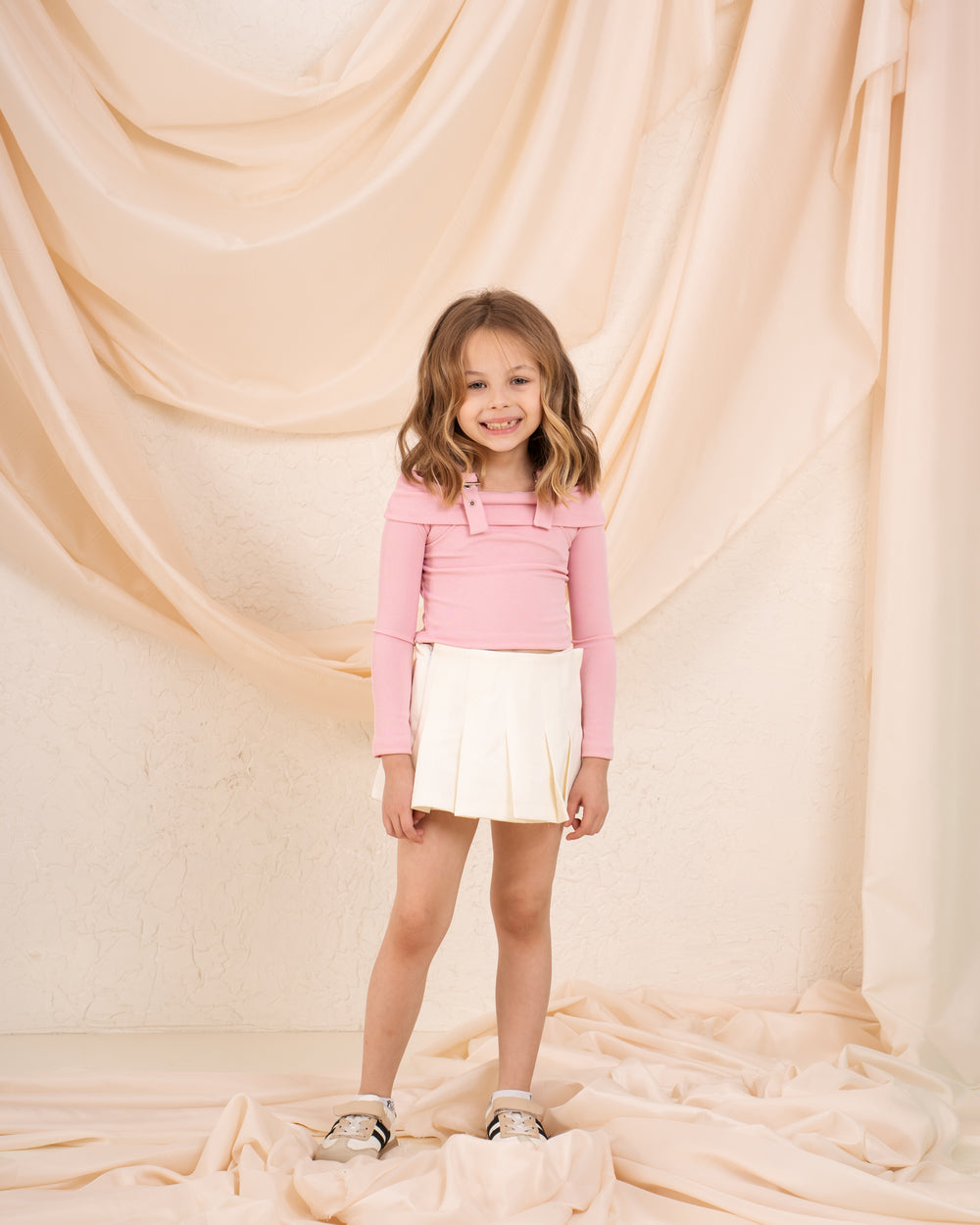 A versatile girl's ribbed knit top with an off-the-shoulder neckline and unique strap details, designed to create multiple stylish outfits.