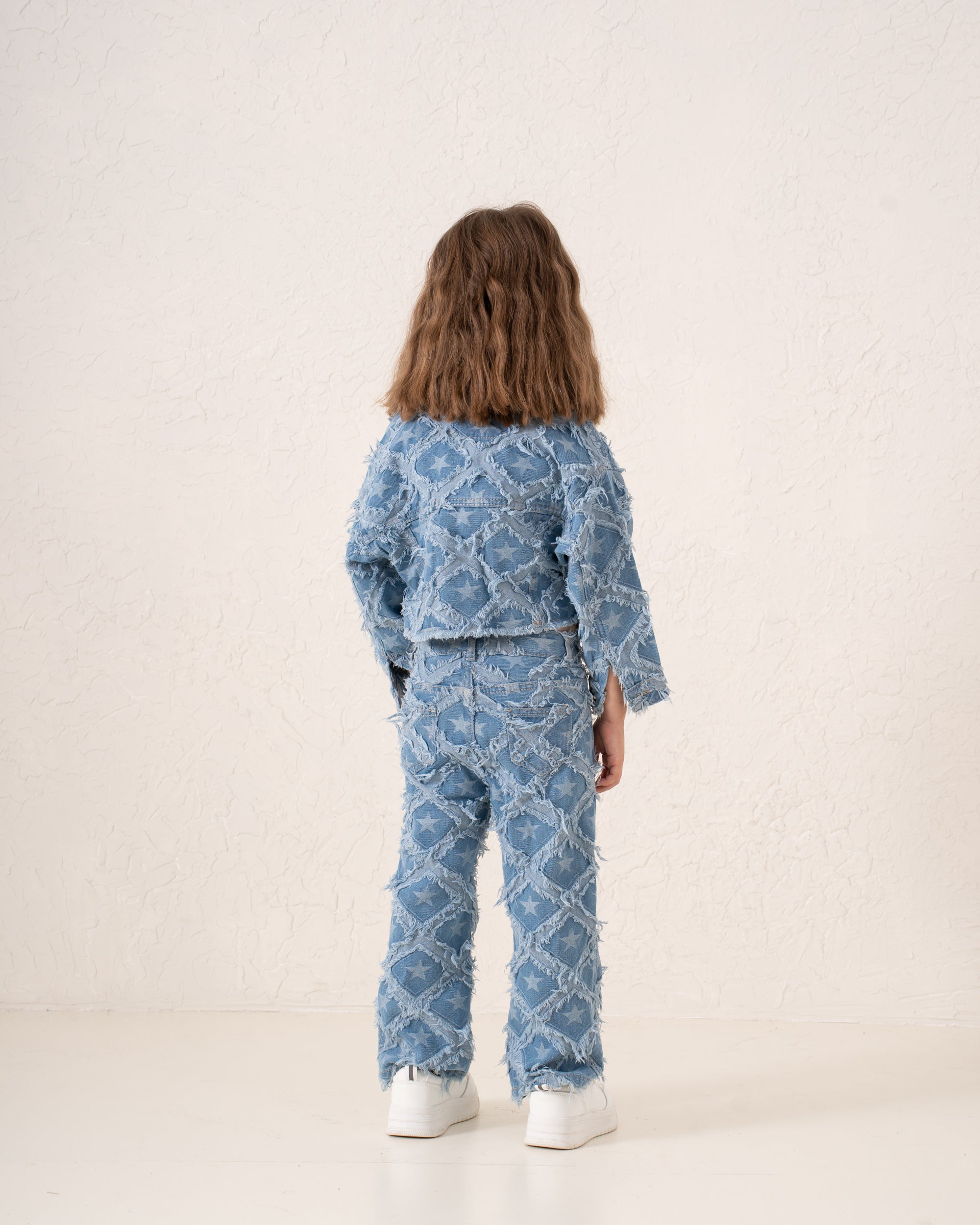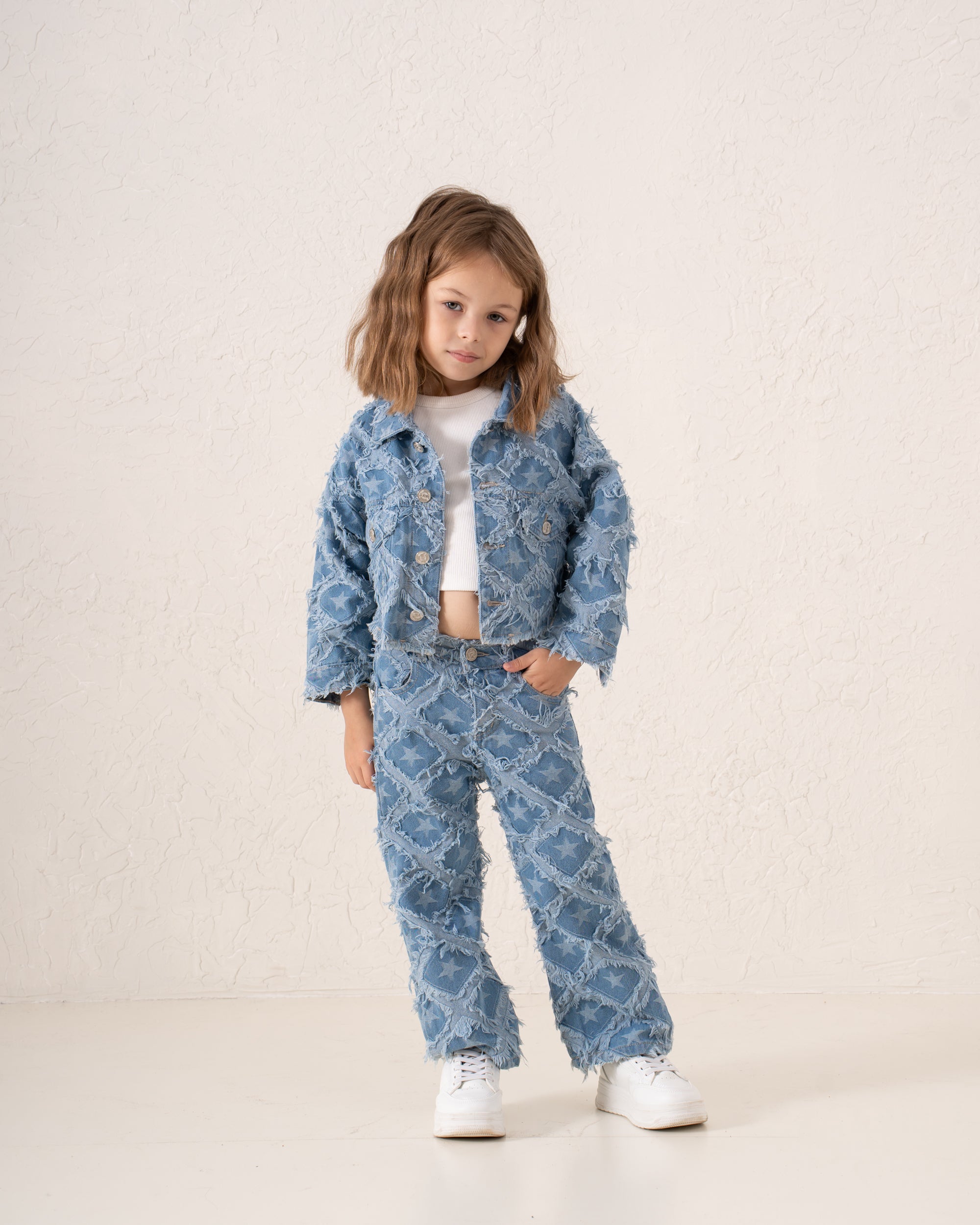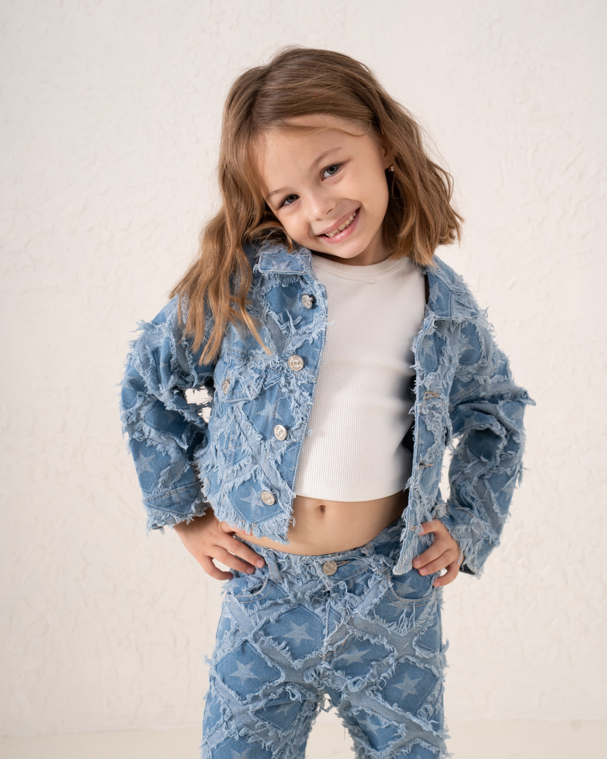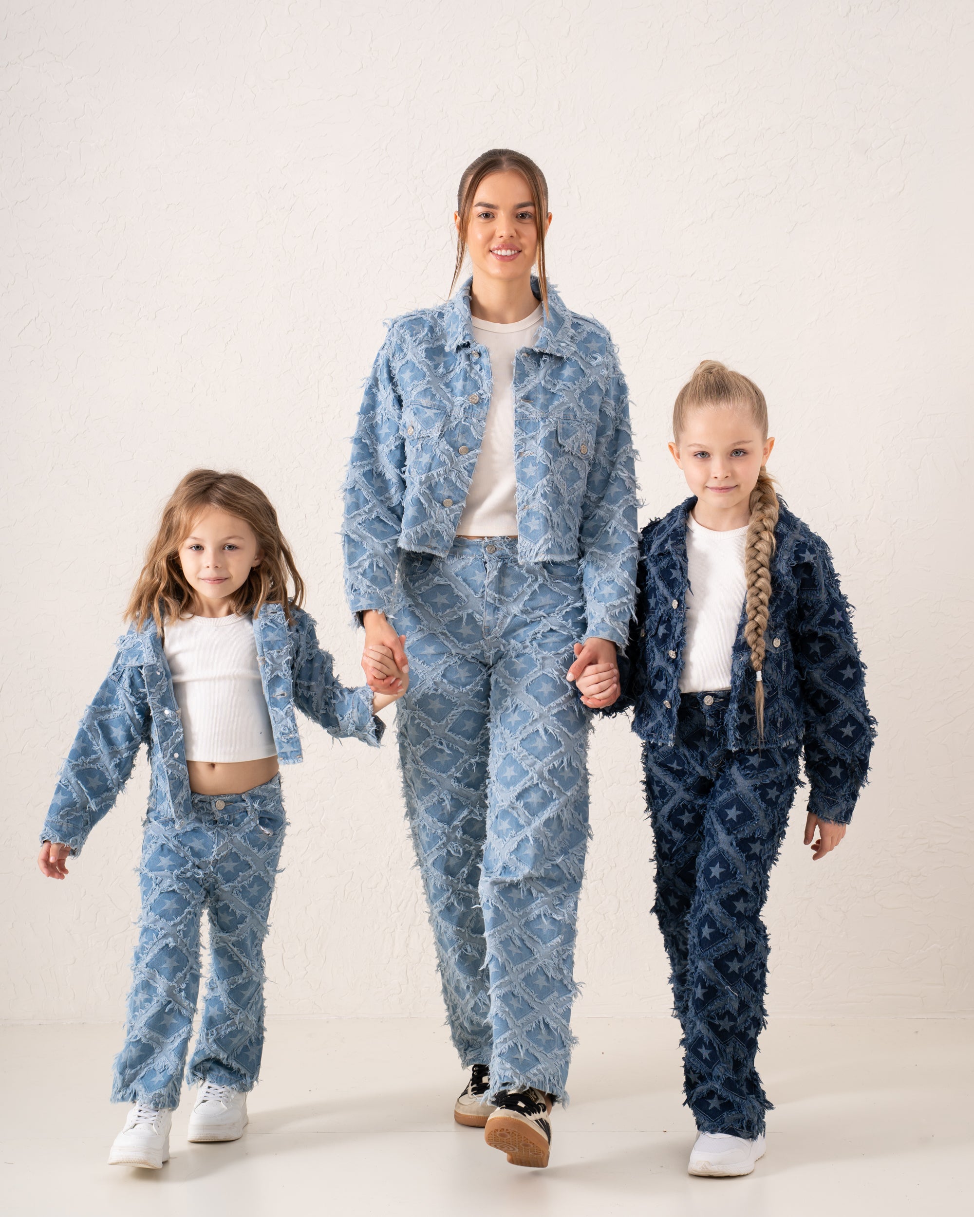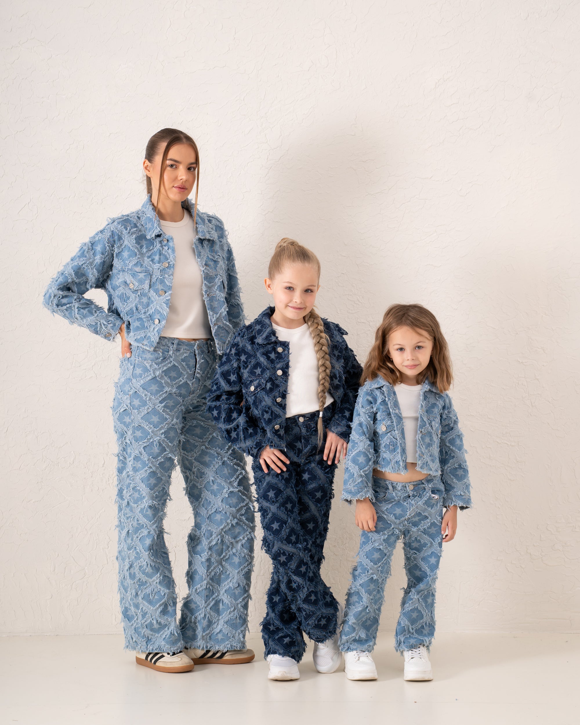 This statement jacket features textured frayed denim with a cool, playful finish. Designed for layering, it adds edge to any outfit — perfect for Mommy & Me matching looks.
