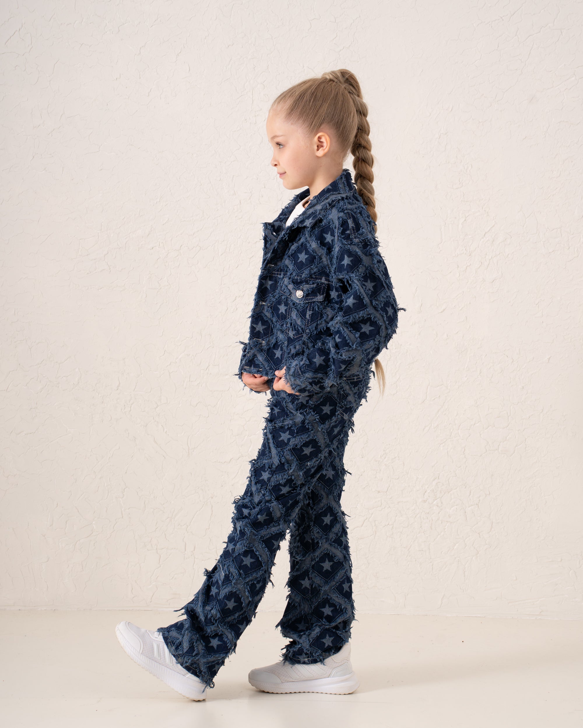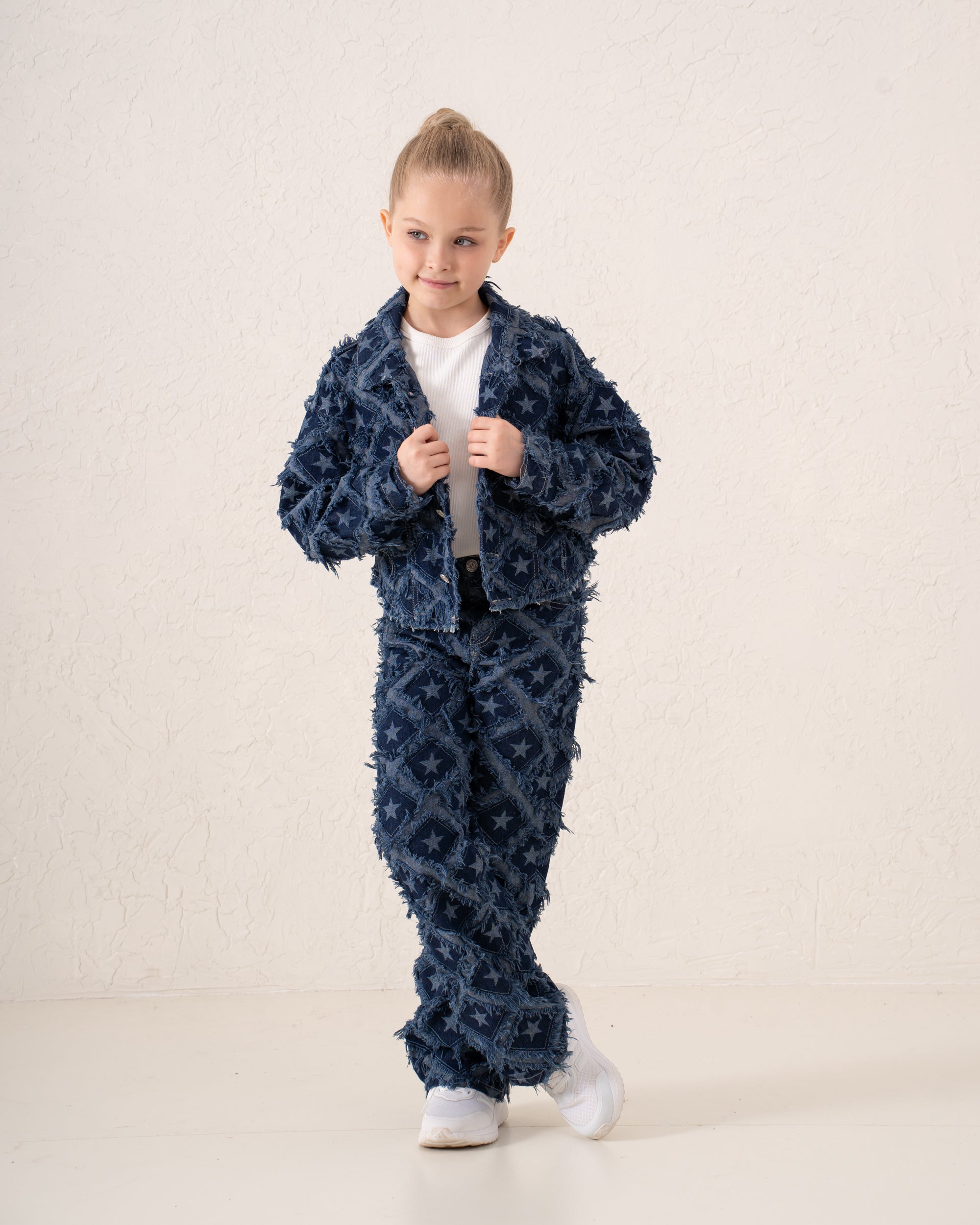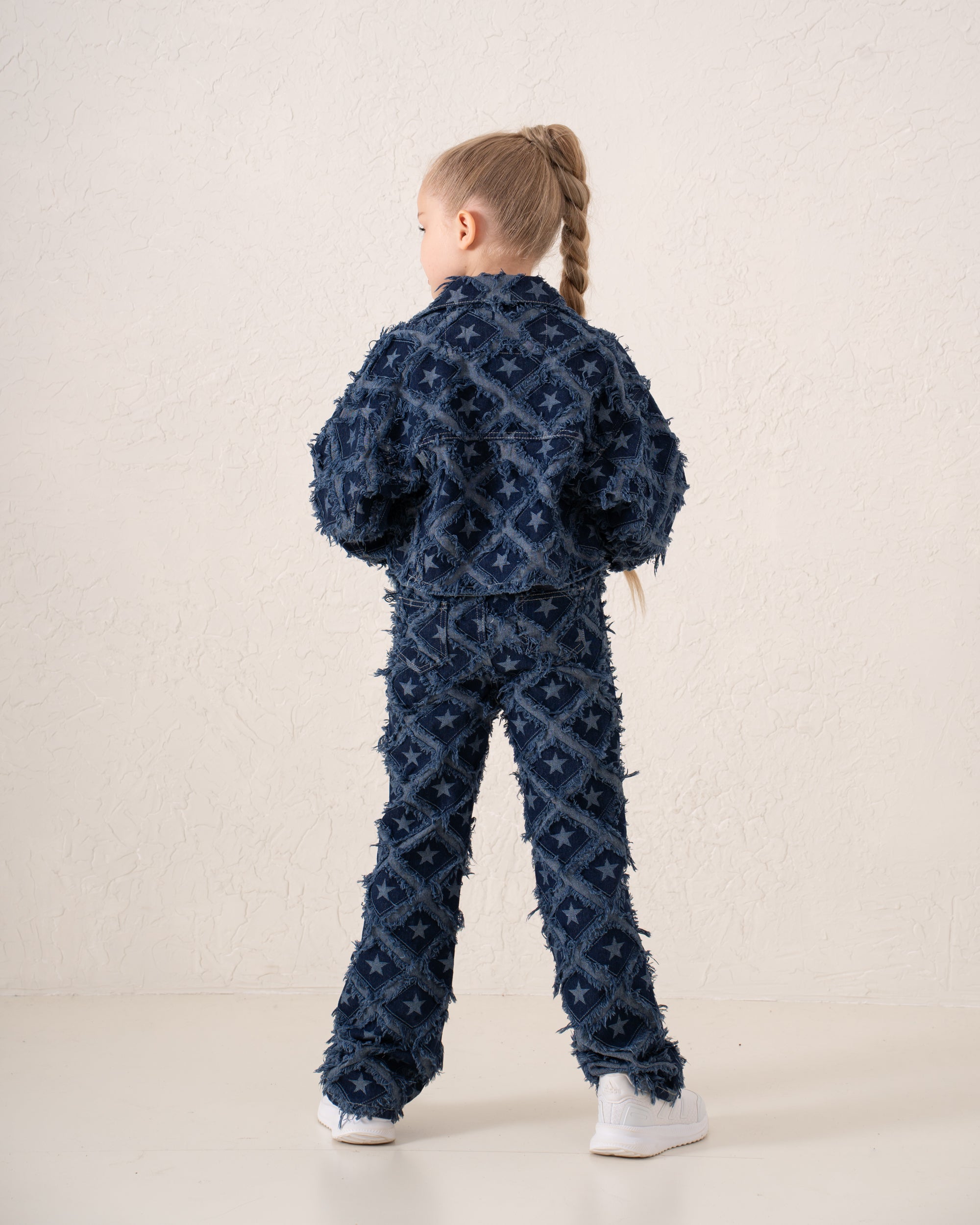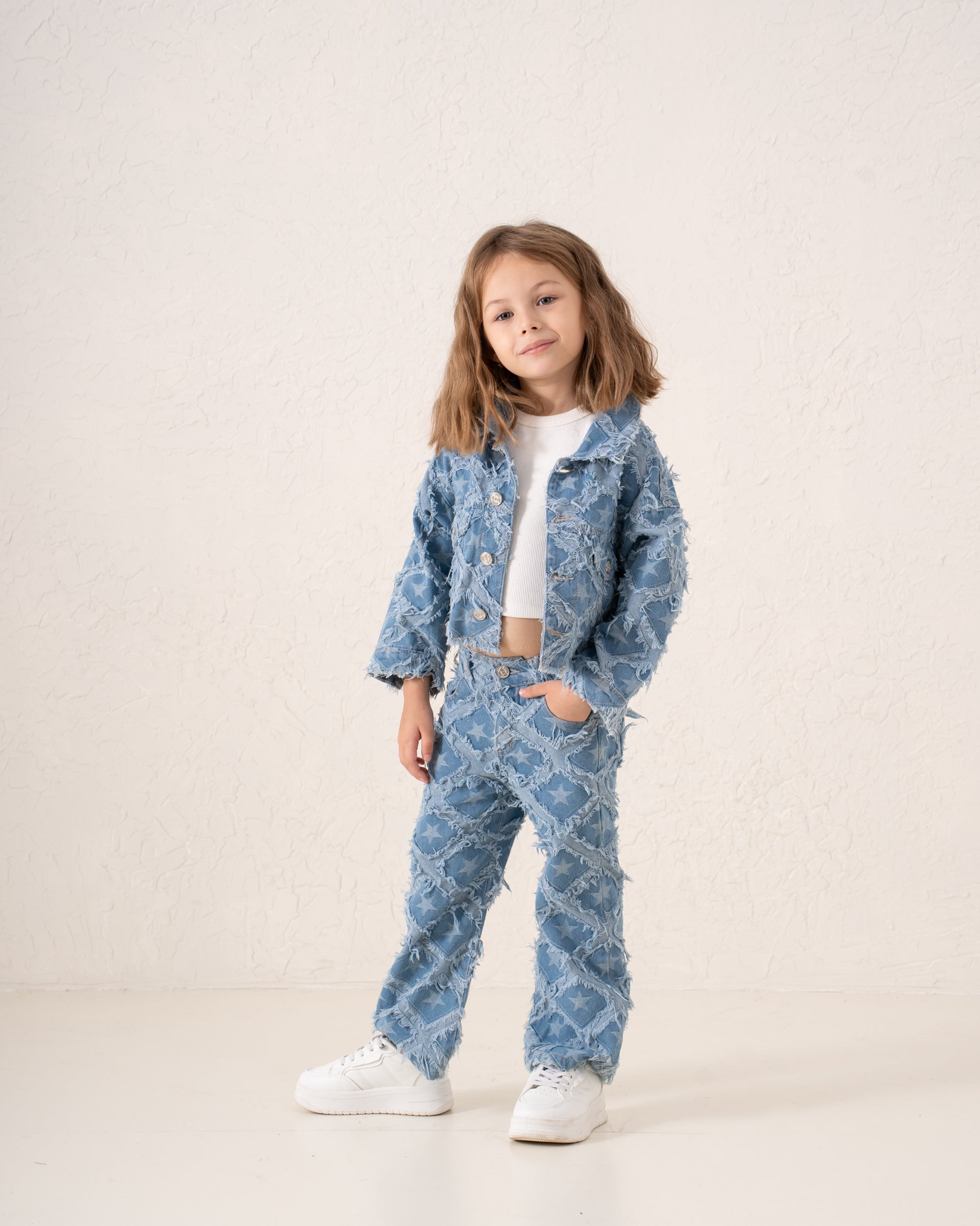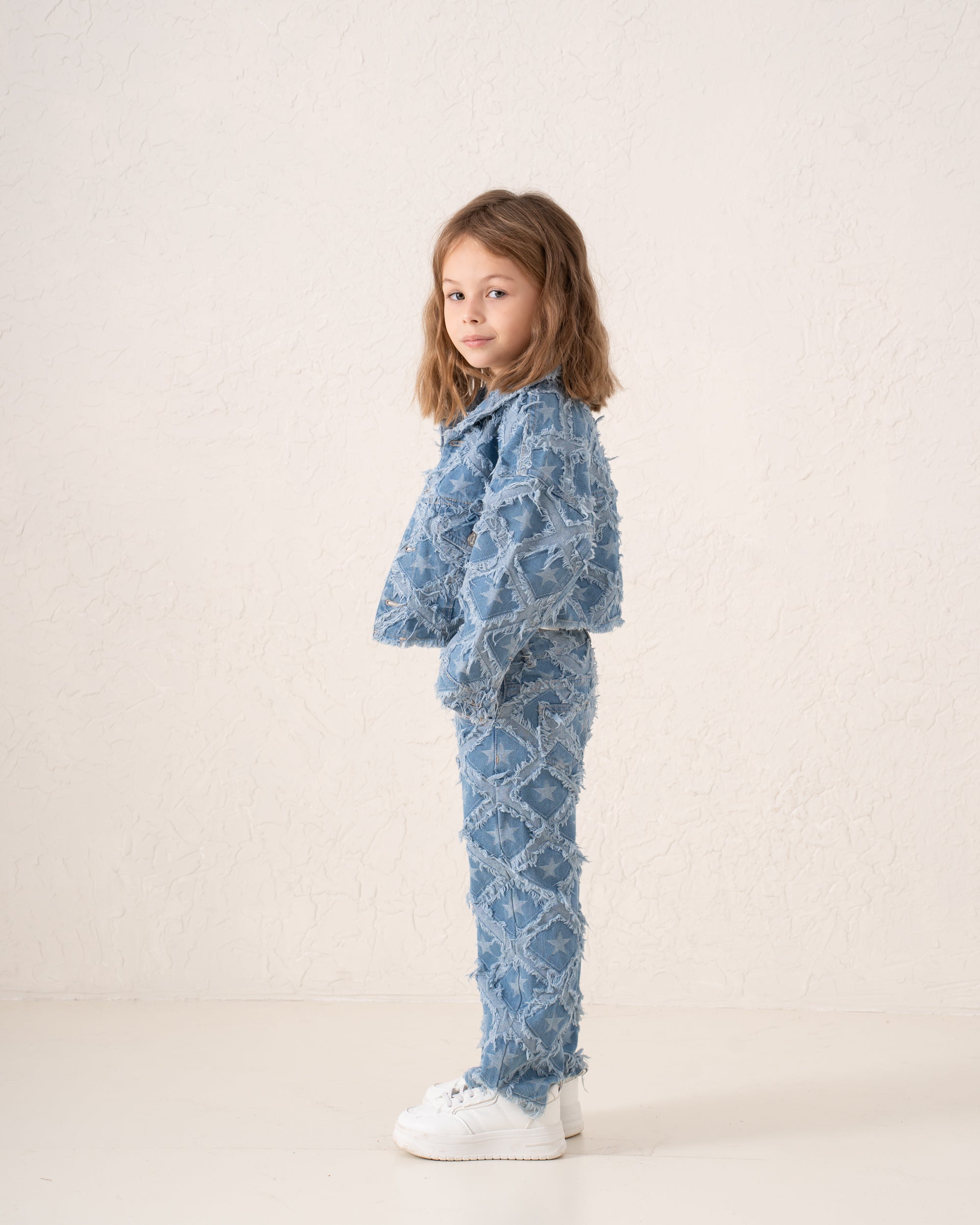 This statement jacket features textured frayed denim with a cool, playful finish. Designed for layering, it adds edge to any outfit — perfect for Mommy & Me matching looks.