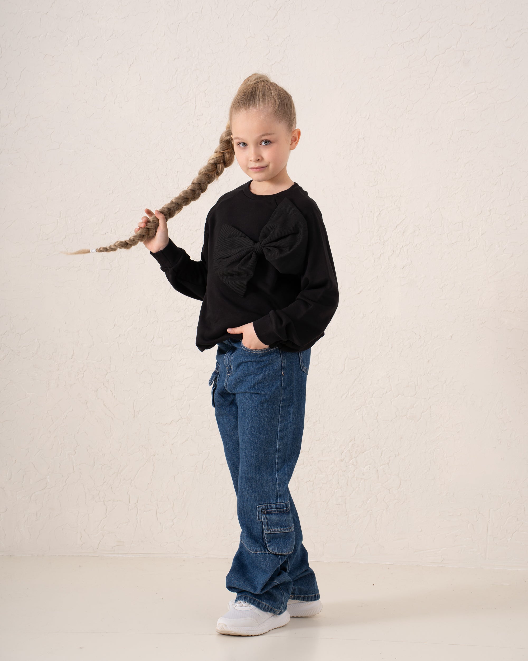 • Details: Large 3D bow detail at the shoulder, crew neckline, ribbed cuffs and hem