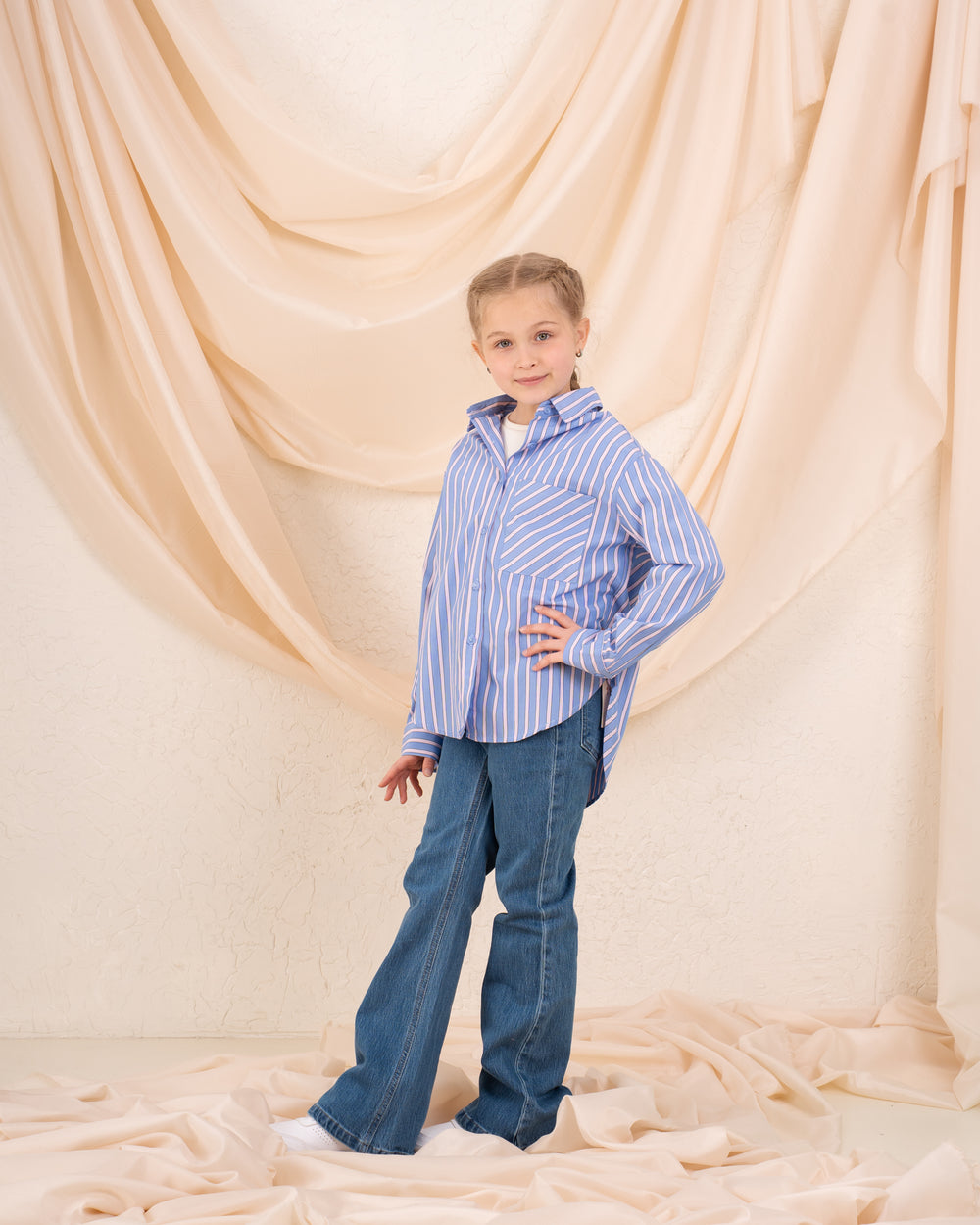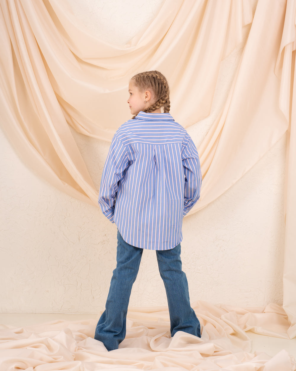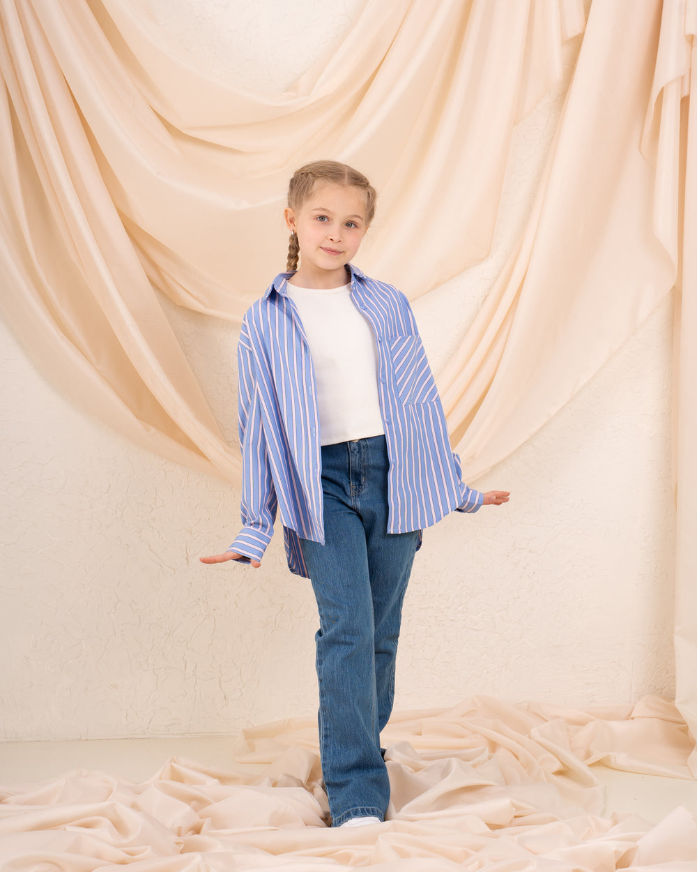 A versatile, integrated two-piece set for girls, combining an oversized pinstripe shirt and a delicate rosette tank top.