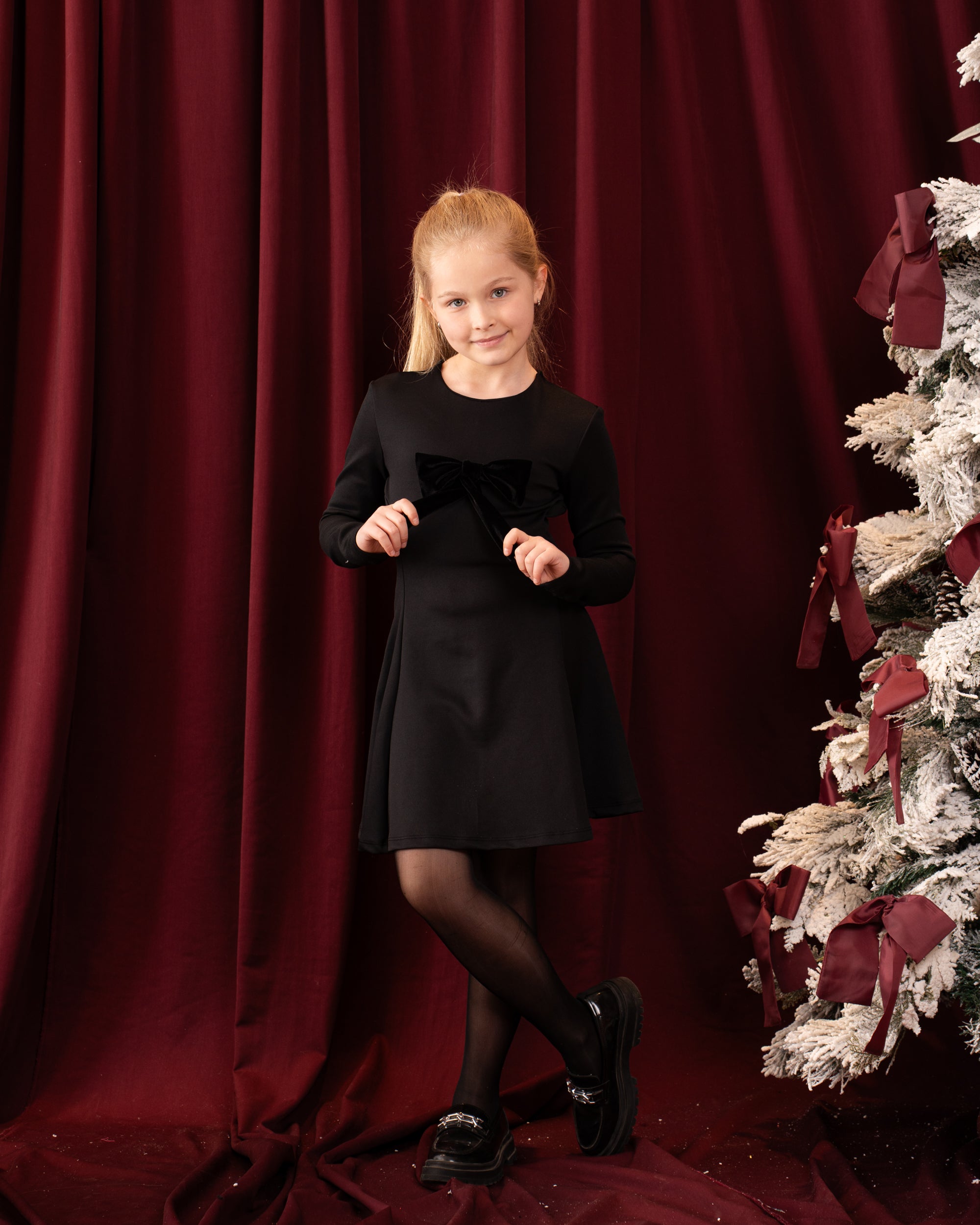 A refined dress designed with a statement velvet bow detail for an elegant festive look. Soft to the touch with a structured silhouette, perfect for holiday moments and special occasions.