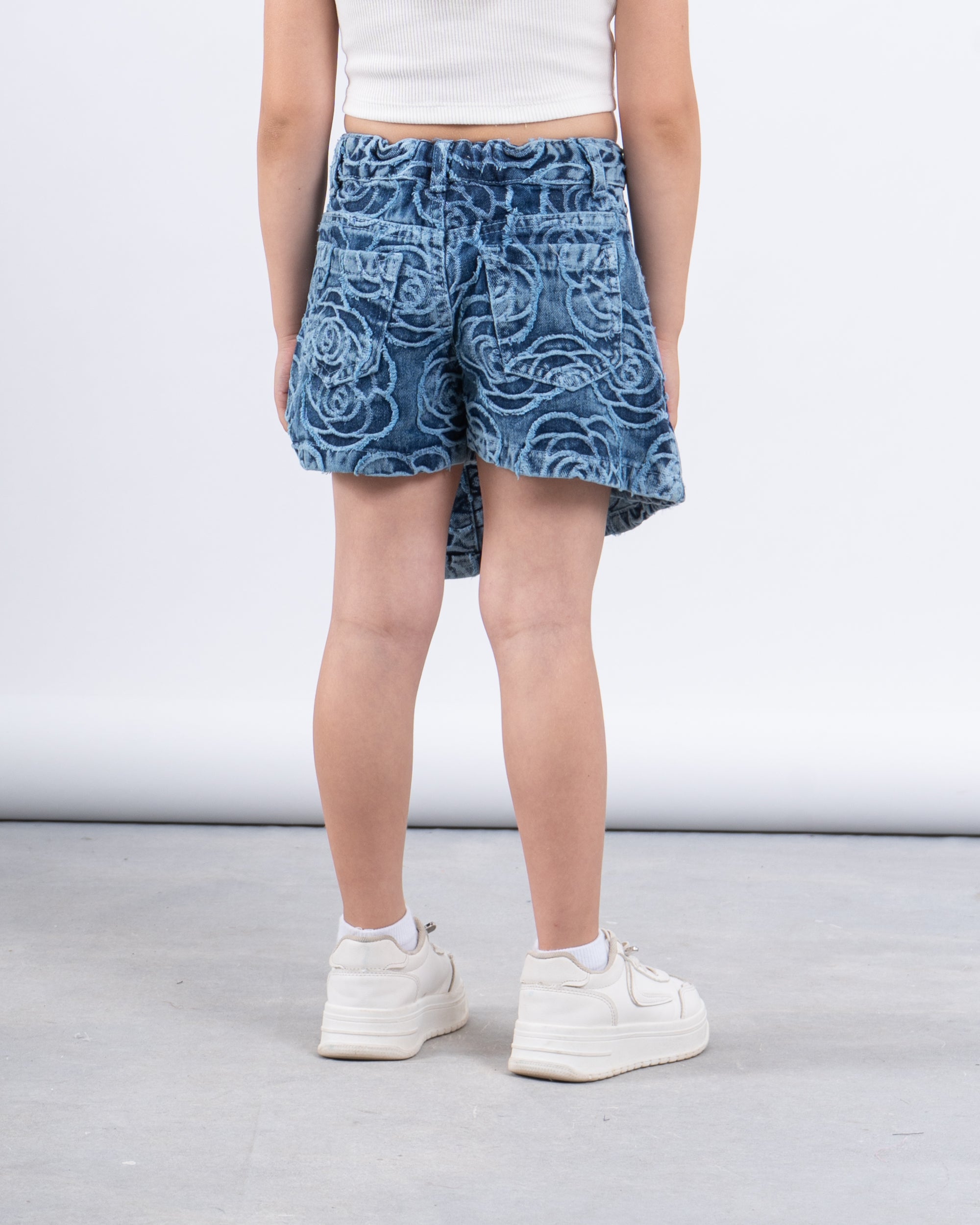A standout denim skort featuring a 3D rose-embroidered texture that adds a soft yet edgy twist to...