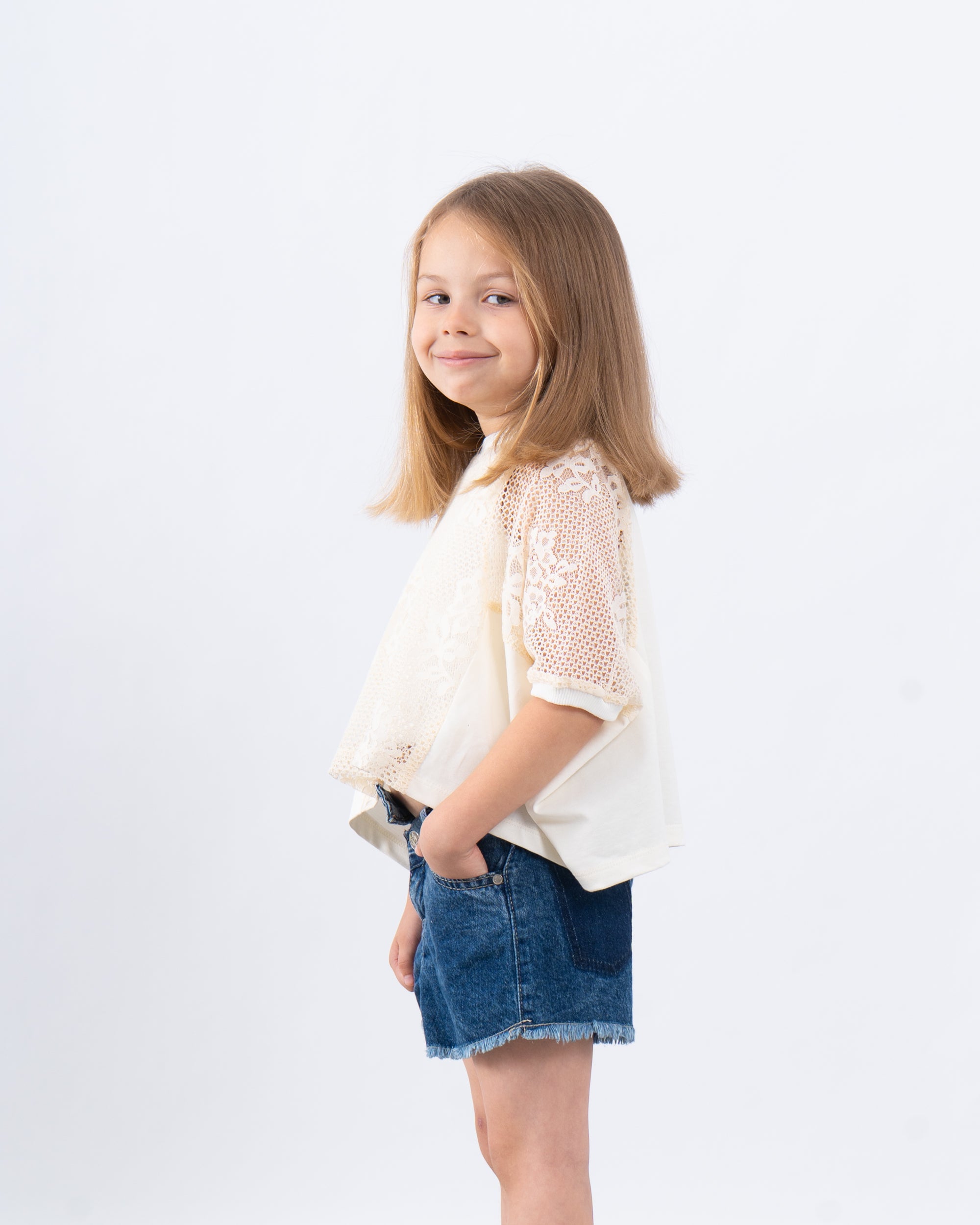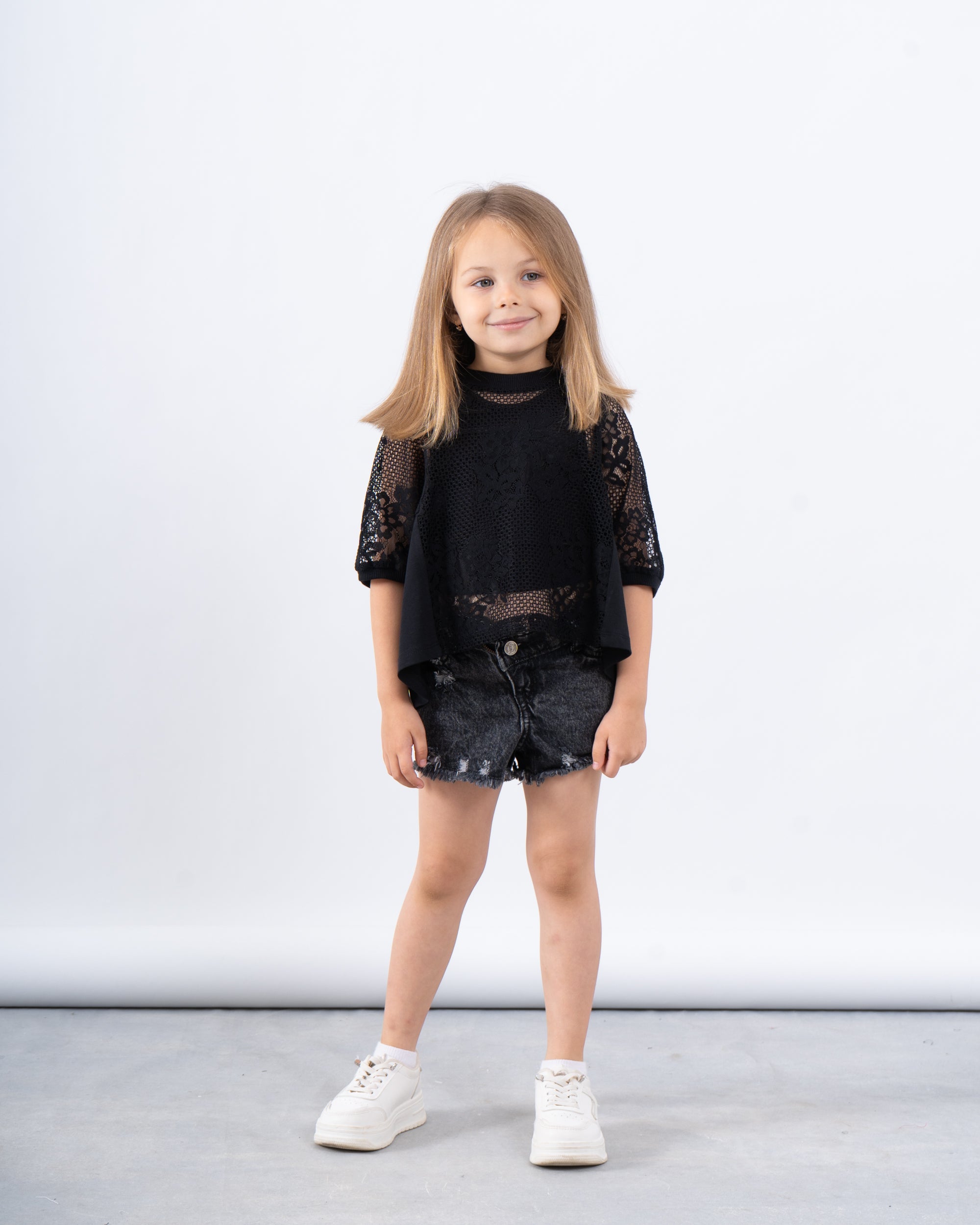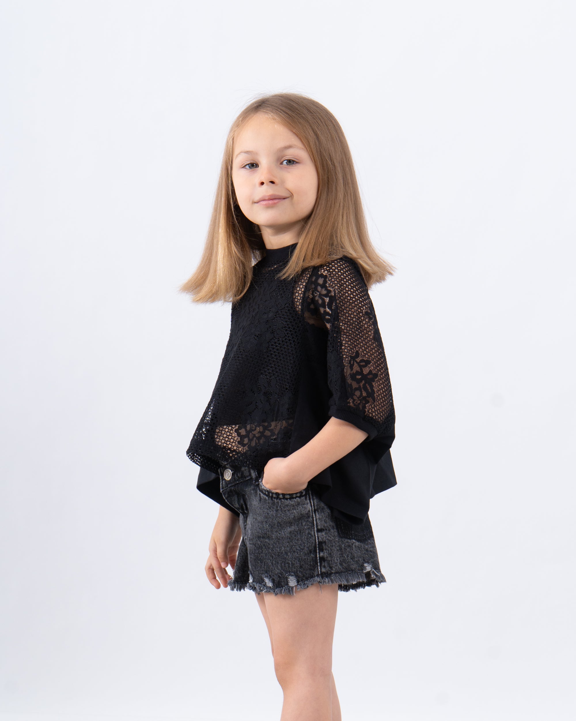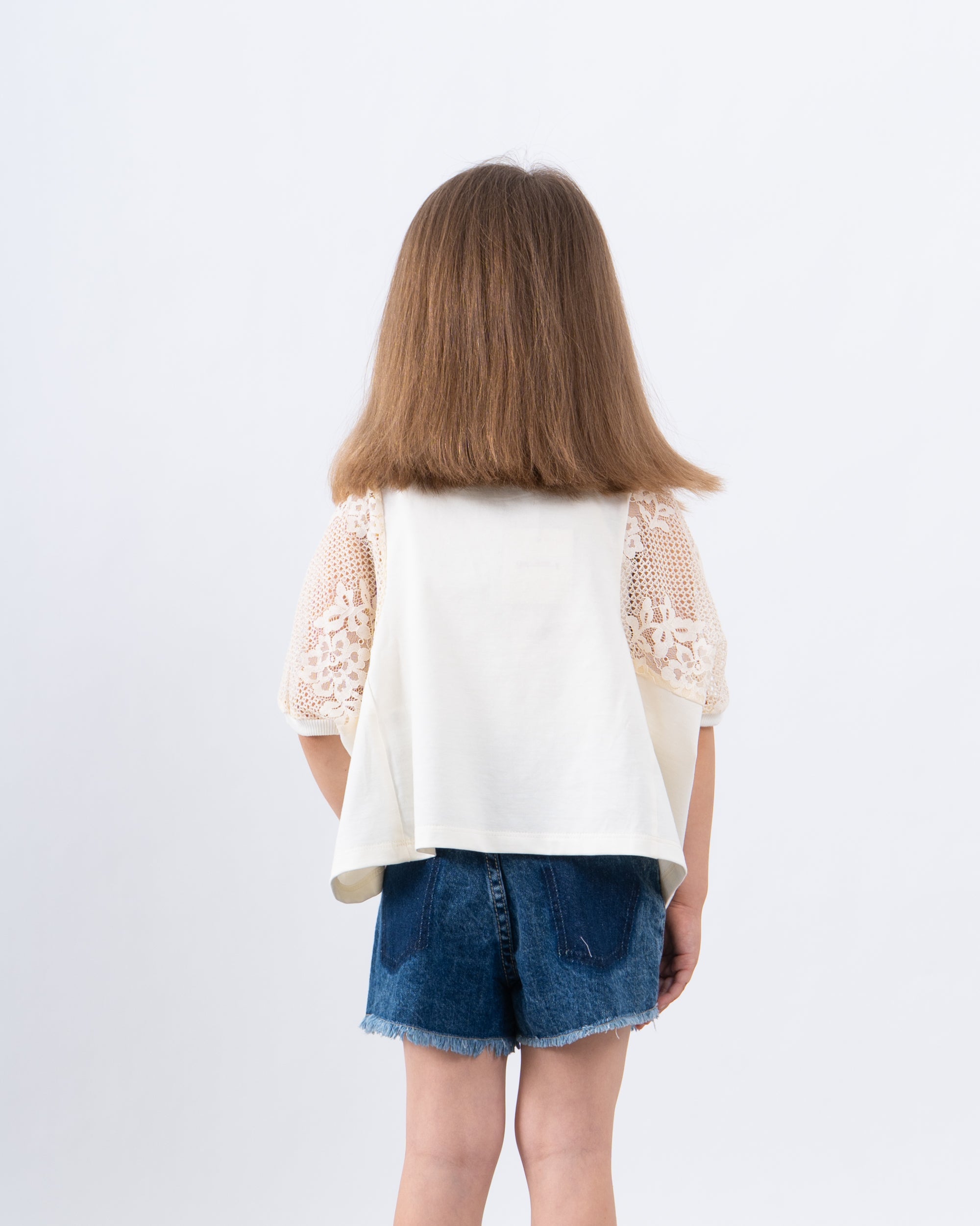 An airy and stylish boxy top featuring a full lace front and lace sleeves, finished with a solid back for comfort. A perfect mix of playful and chic for summer outings.