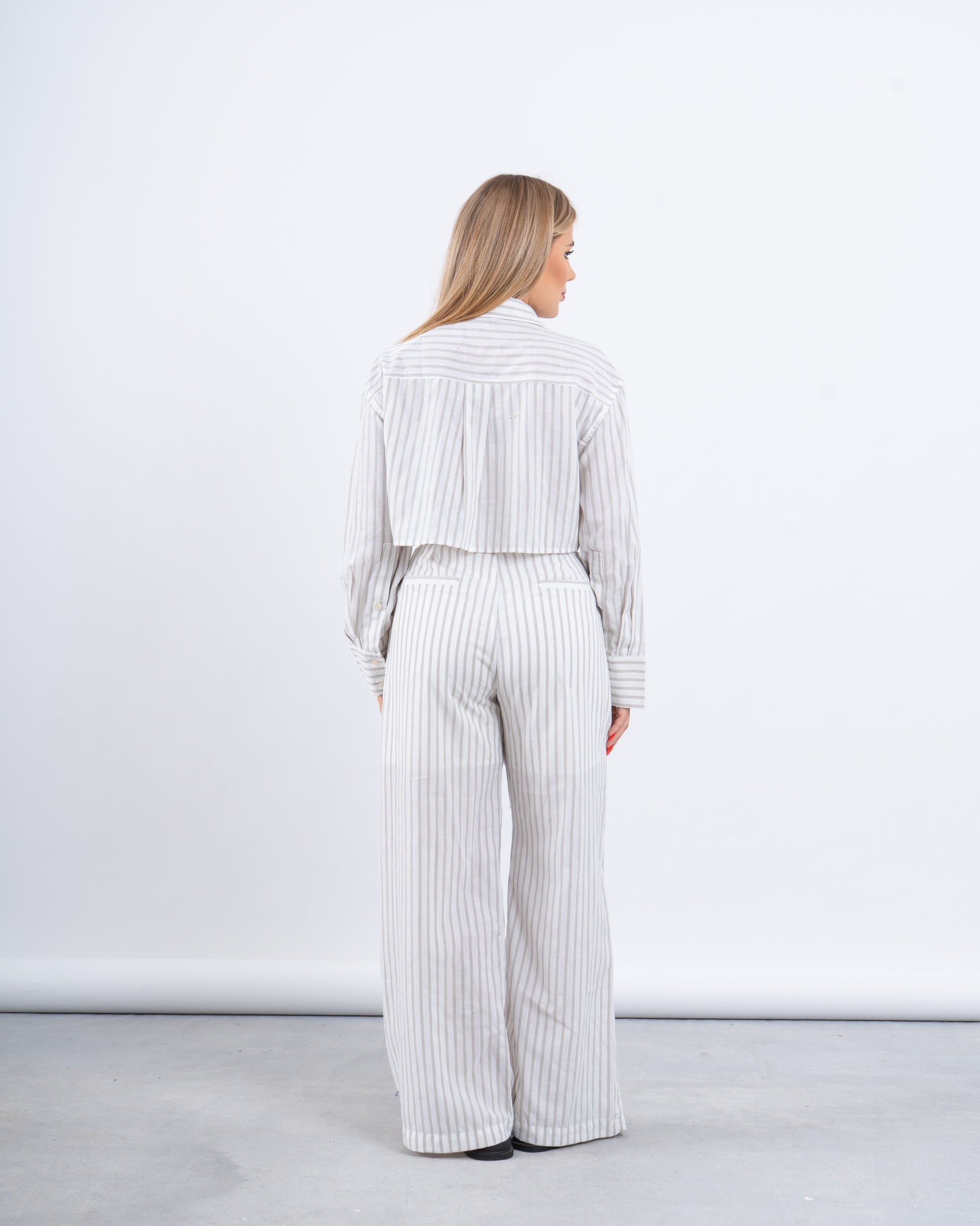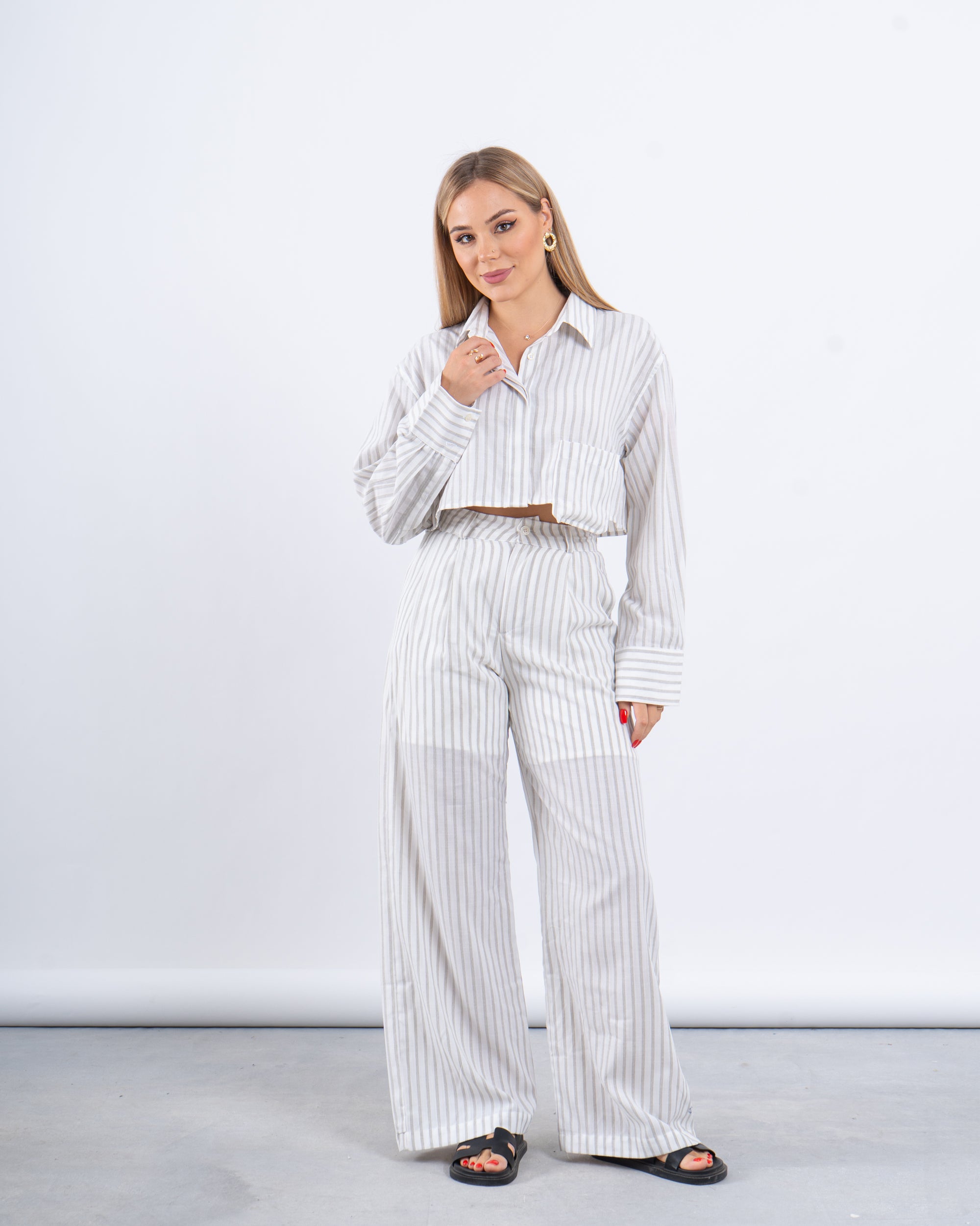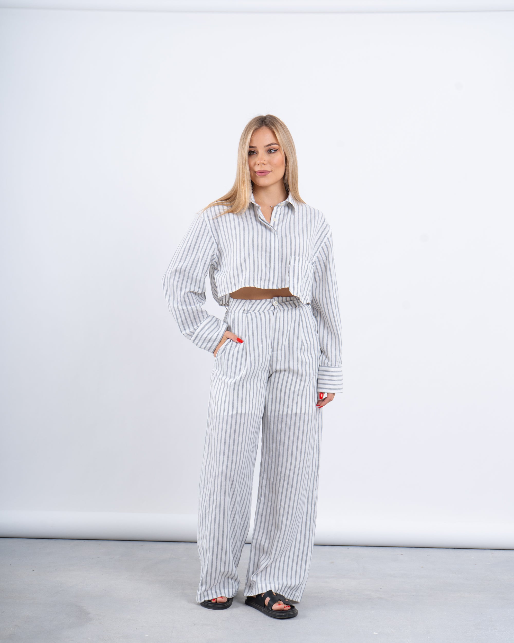 The ultimate blend of comfort and edge. This two-piece set features a cropped button-down shirt and flowy high-rise pants with an airy striped linen texture that’s made for hot summer days.