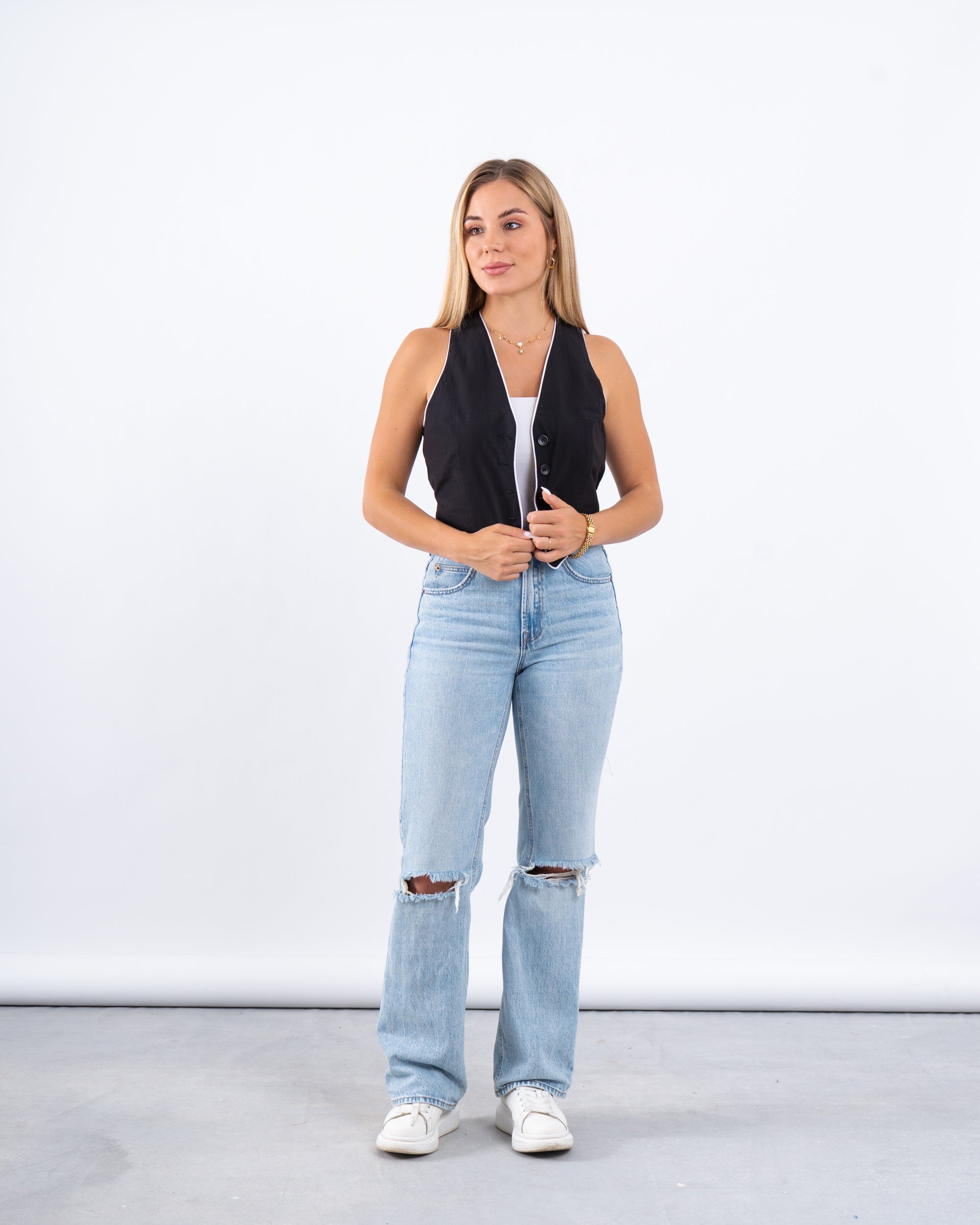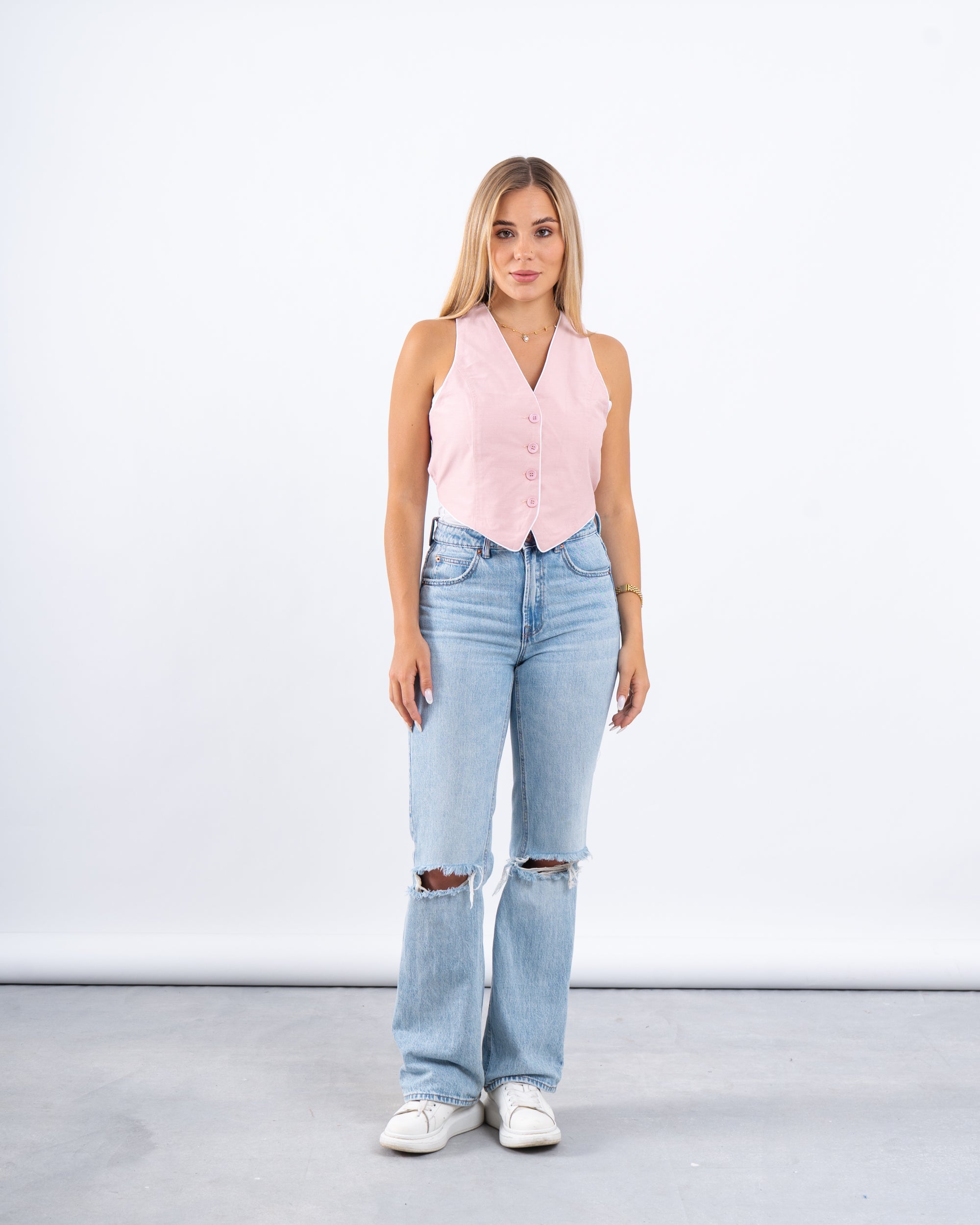 A refined and versatile buttoned vest featuring a classic notched collar and a sleek, tailored silhouette. Designed with a wrap-around tie detail at the back for a customized fit. Perfect for adding a structured touch to any outfit.