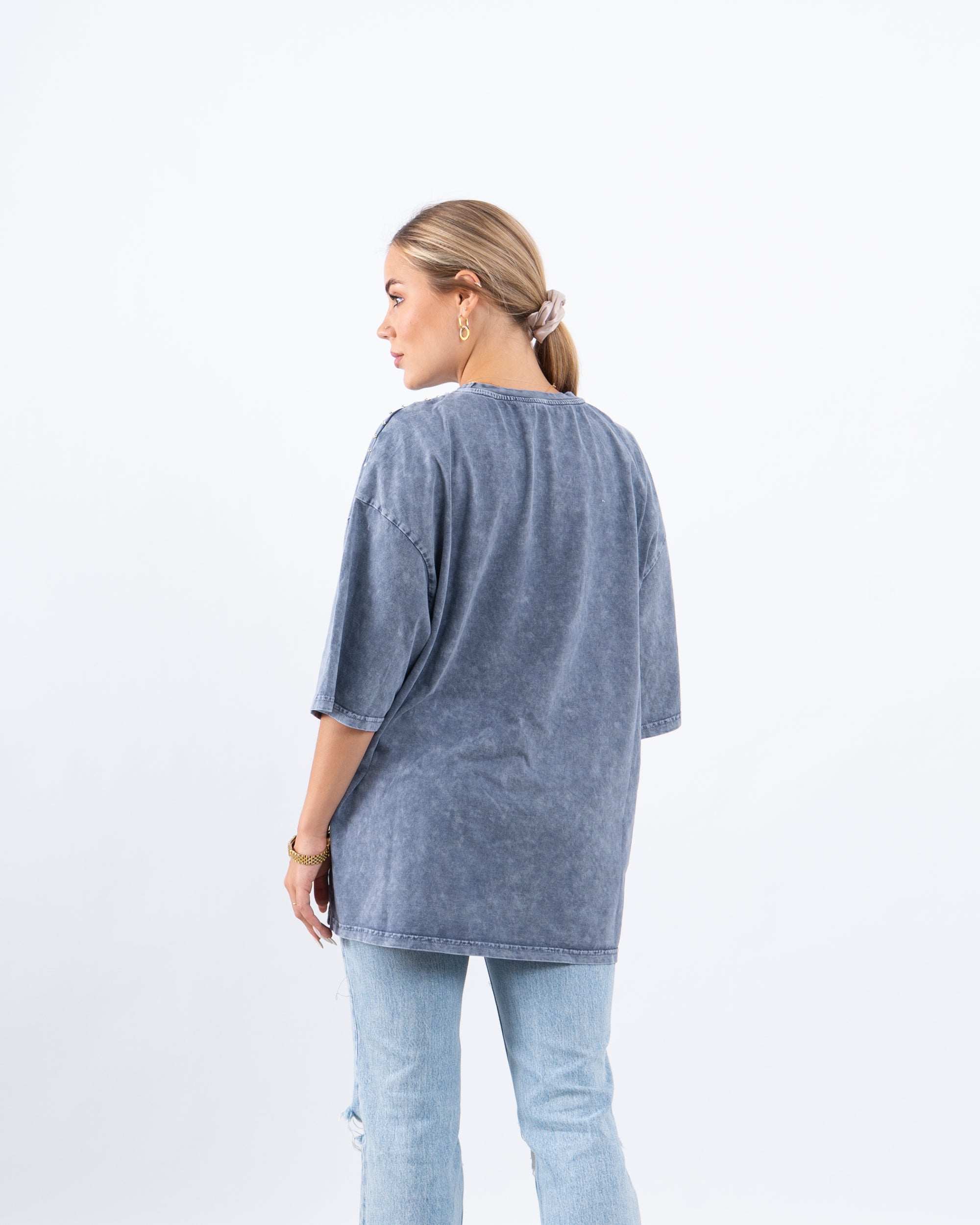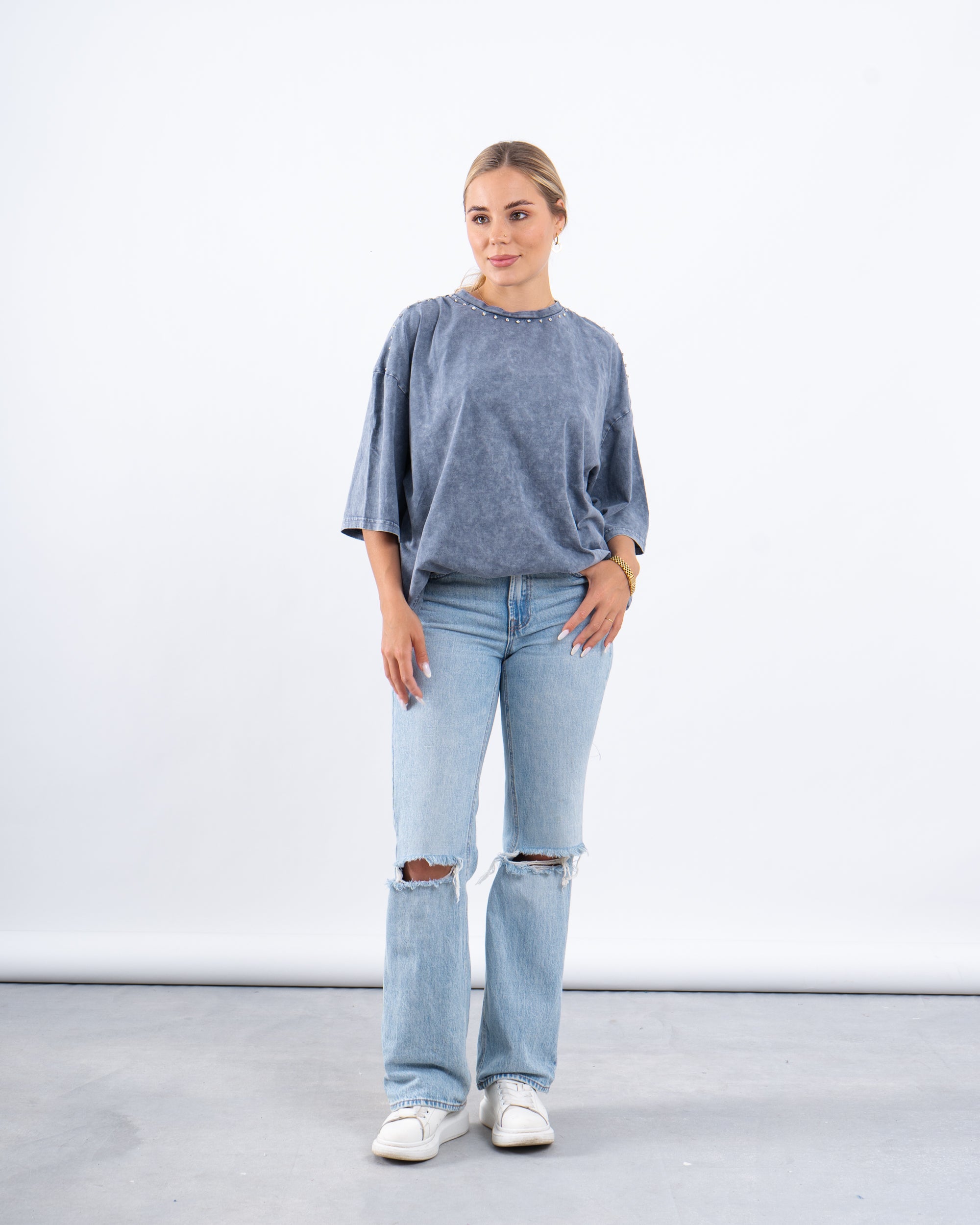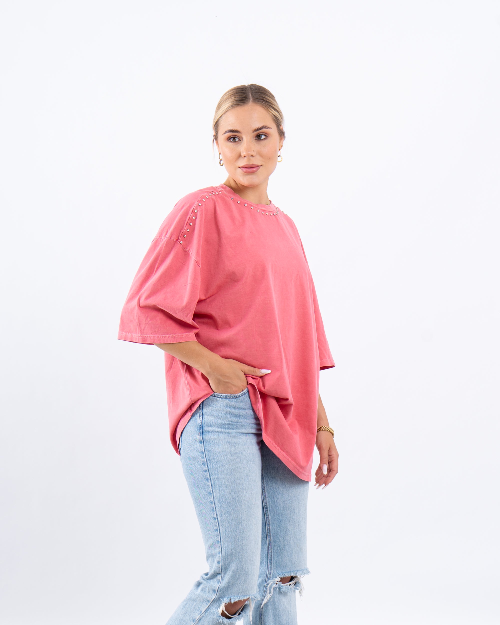 A trendy oversized T-shirt featuring studded details along the neckline and shoulders. Designed for a relaxed and effortless look, perfect for casual wear or adding a touch of edge to your outfit.