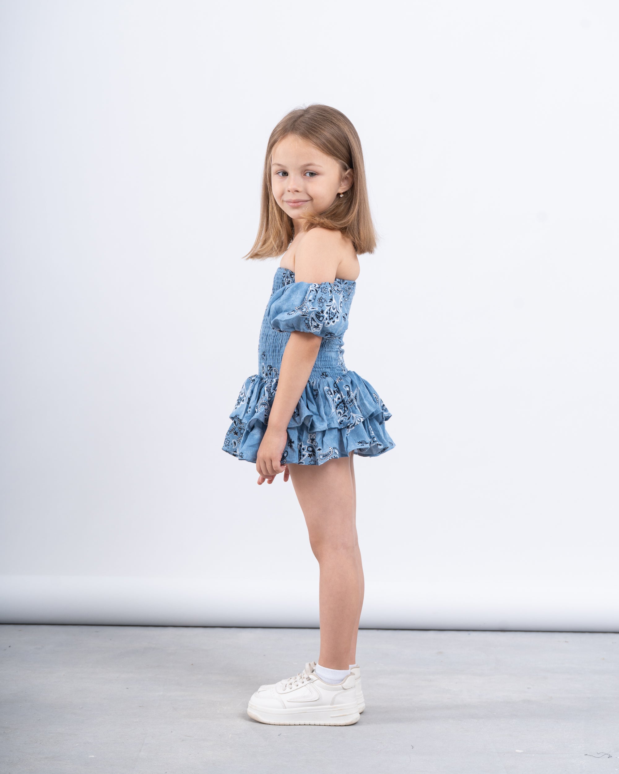A playful summer dress with boho charm. This off-shoulder piece features a smocked bodice and tiered ruffle skirt, finished with puffed sleeves for extra flair.