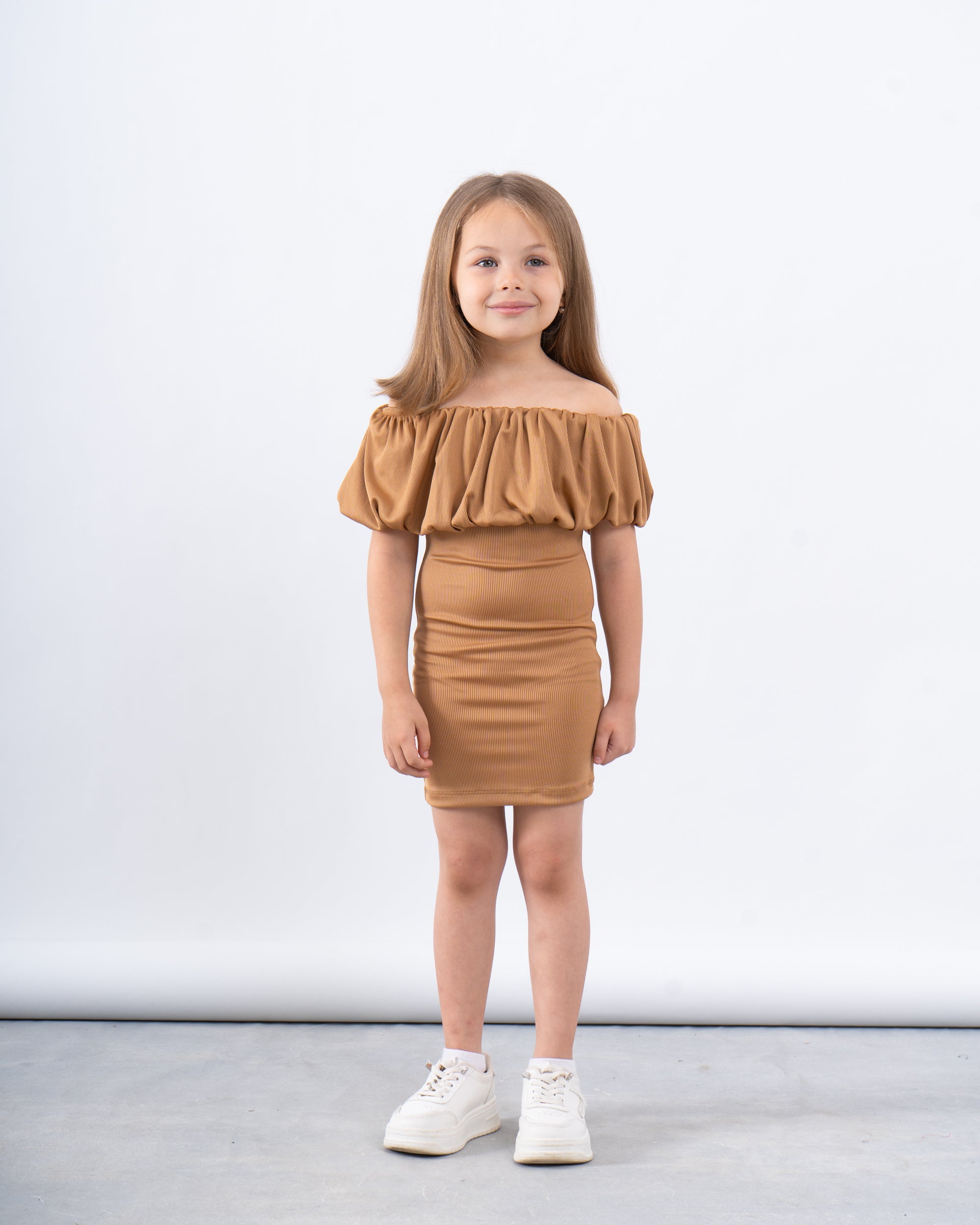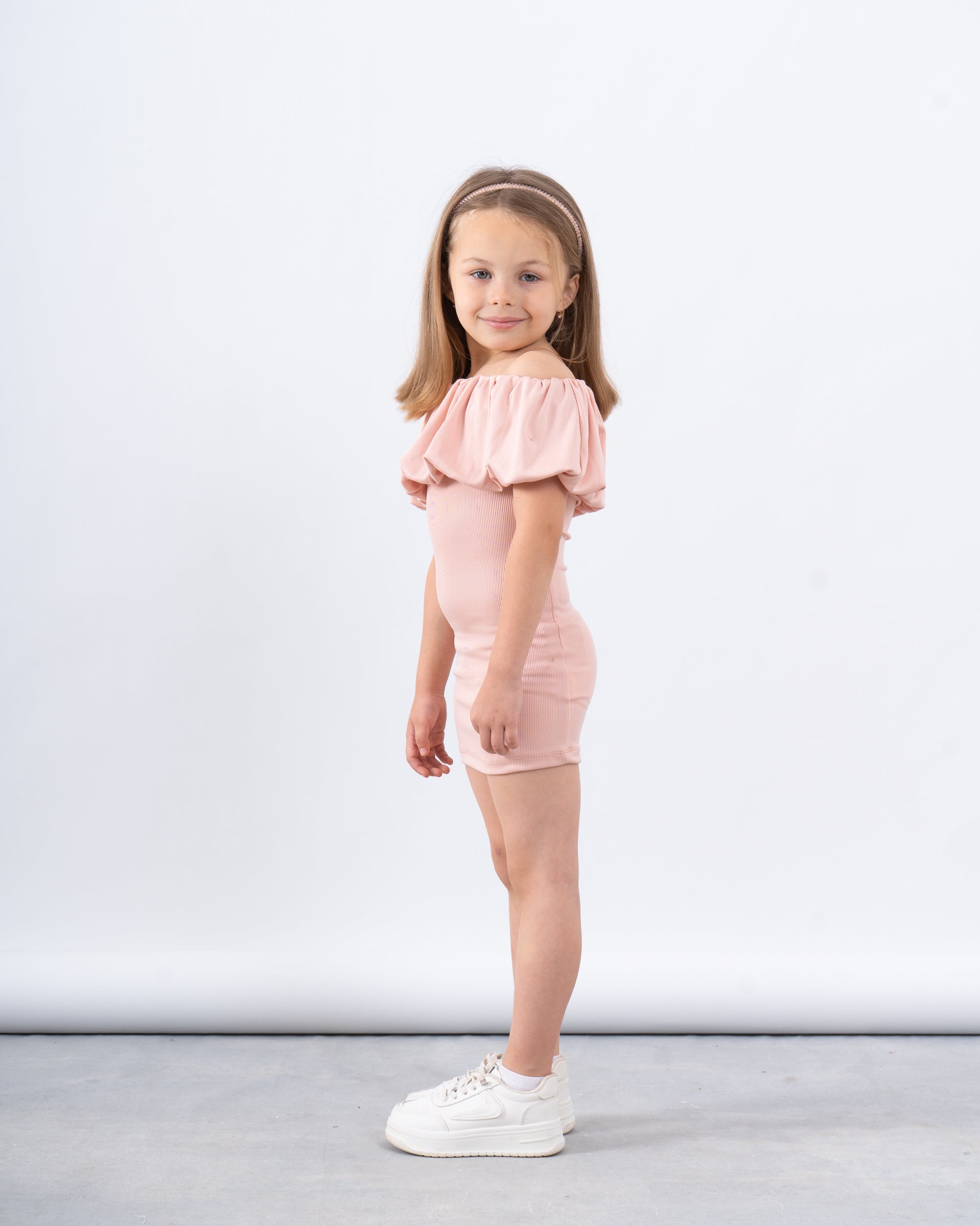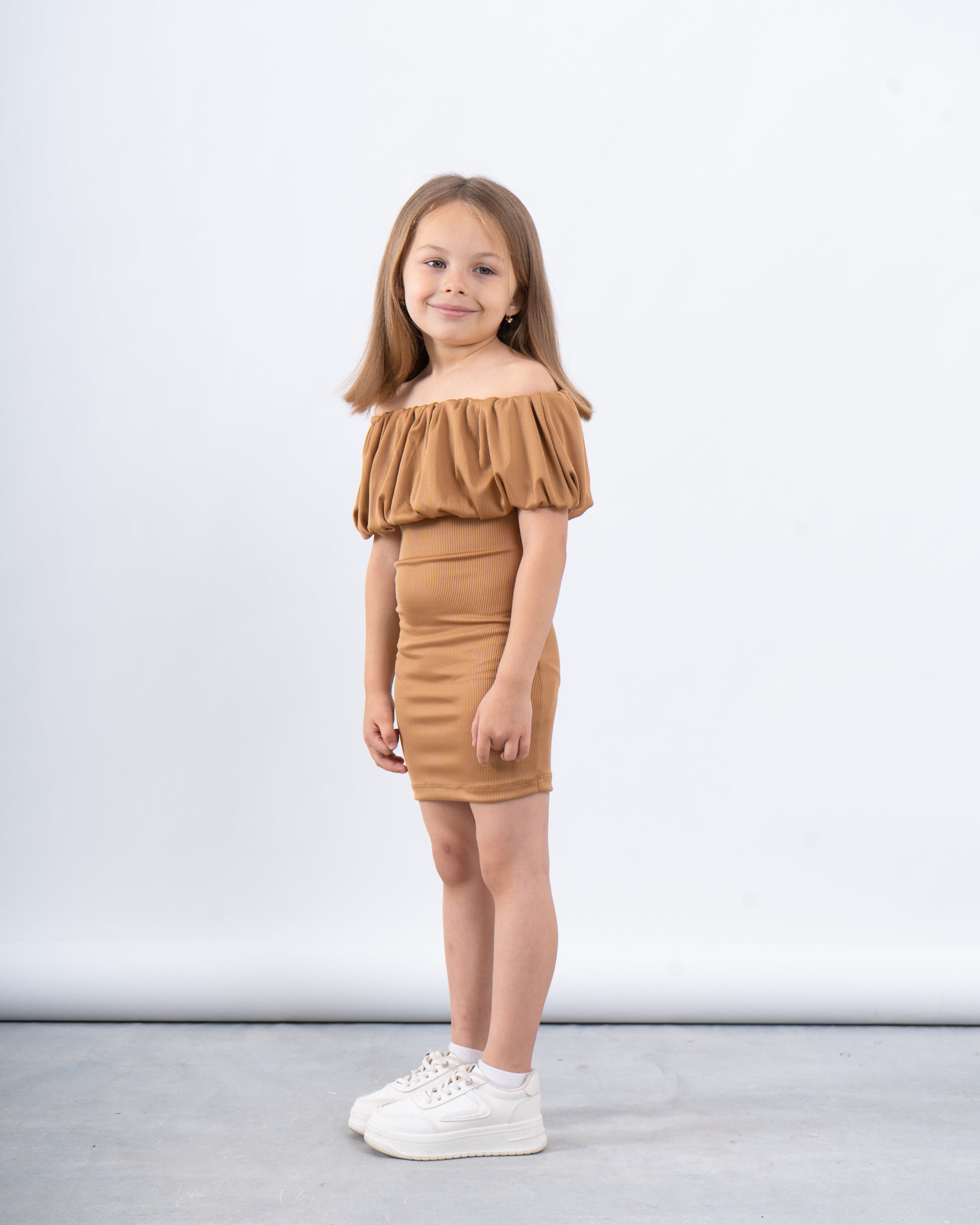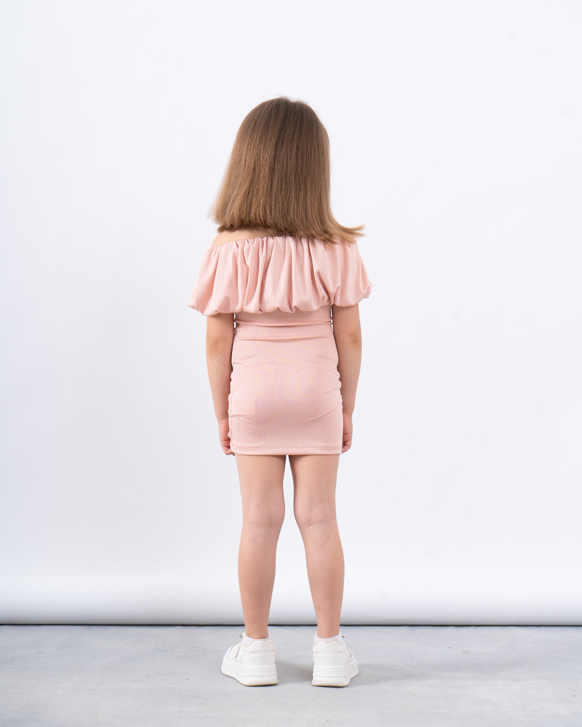A playful and stylish off-shoulder dress crafted from soft ribbed fabric. Designed with a ruffled neckline for an extra cute and girly touch, perfect for special occasions or fun outings.