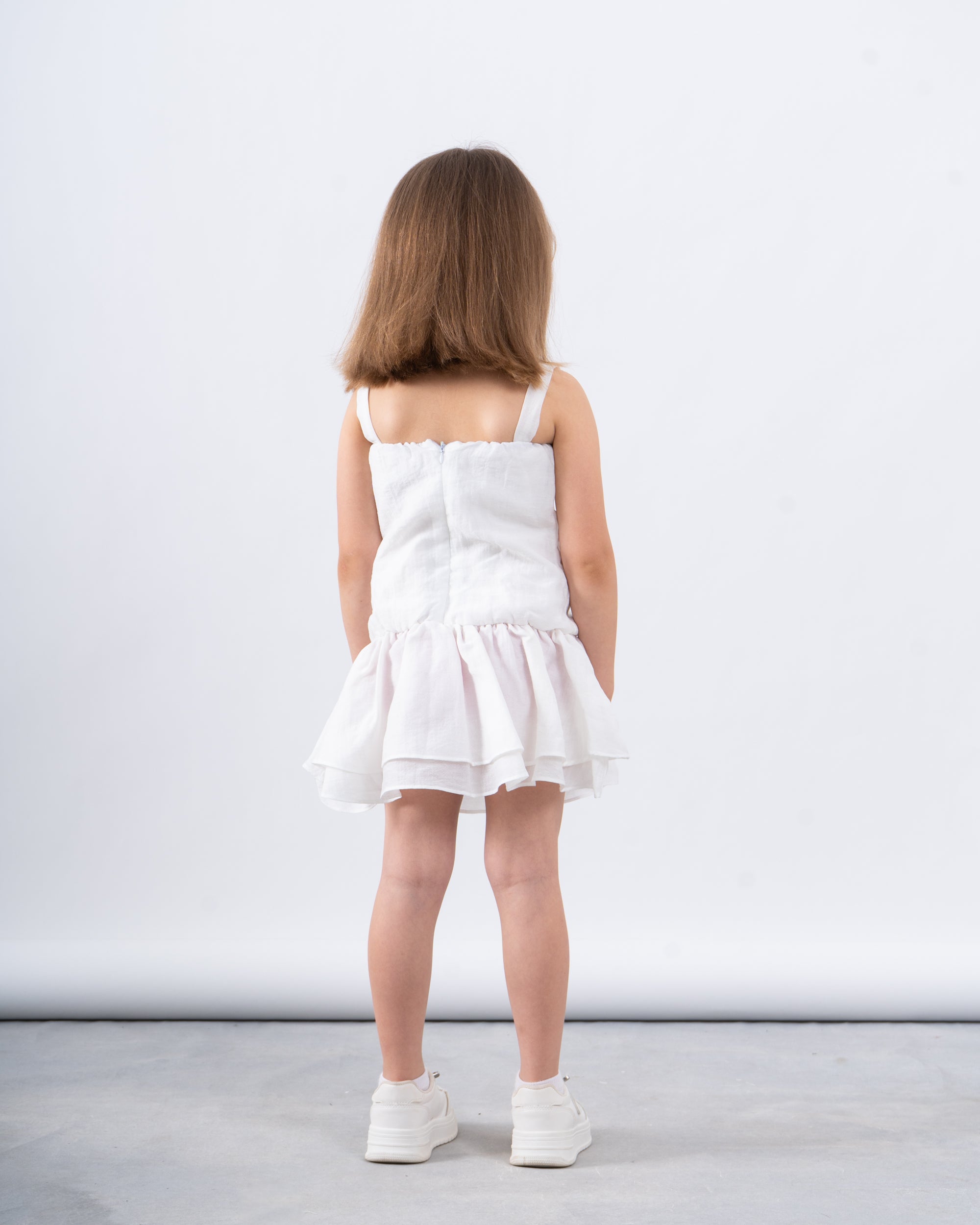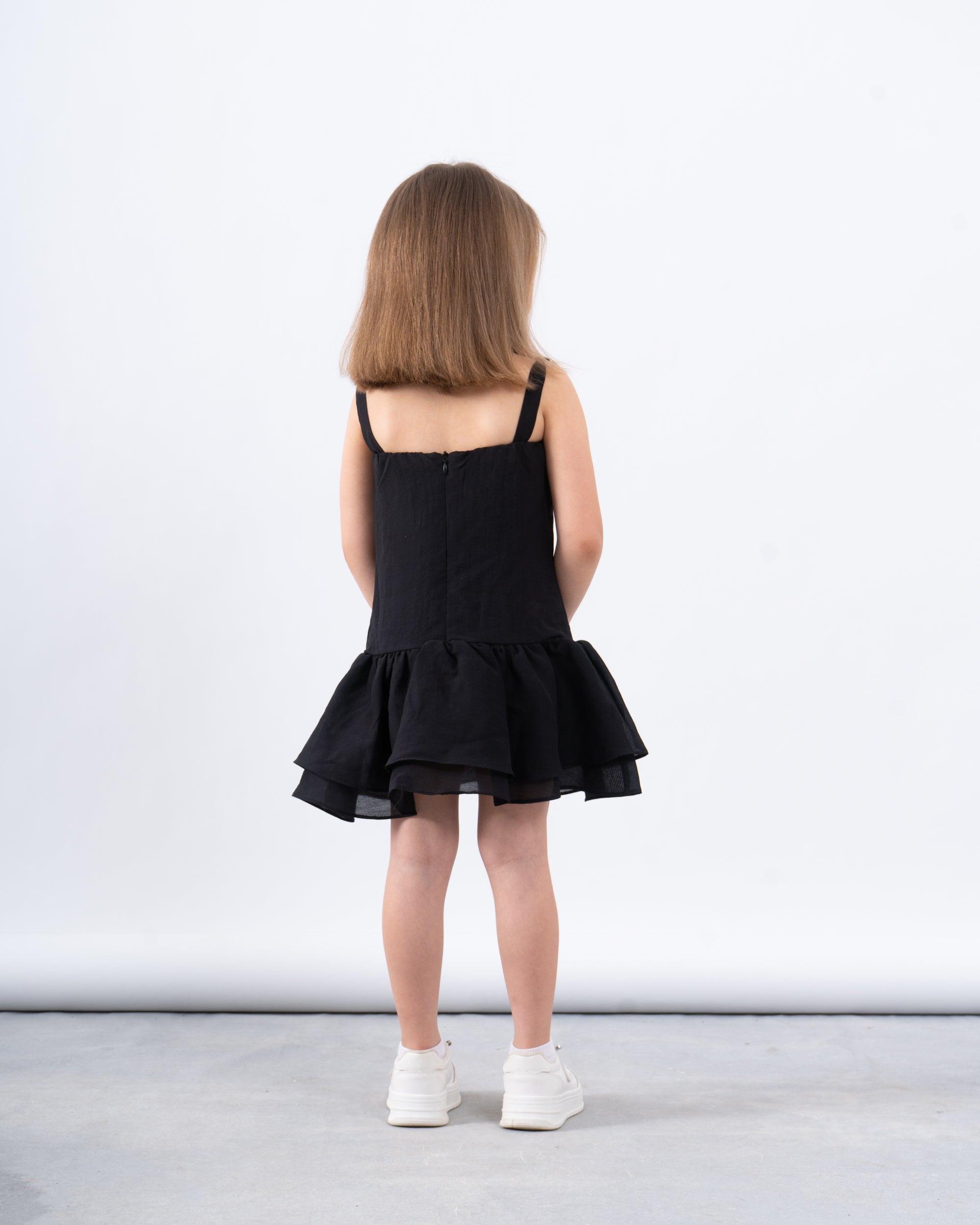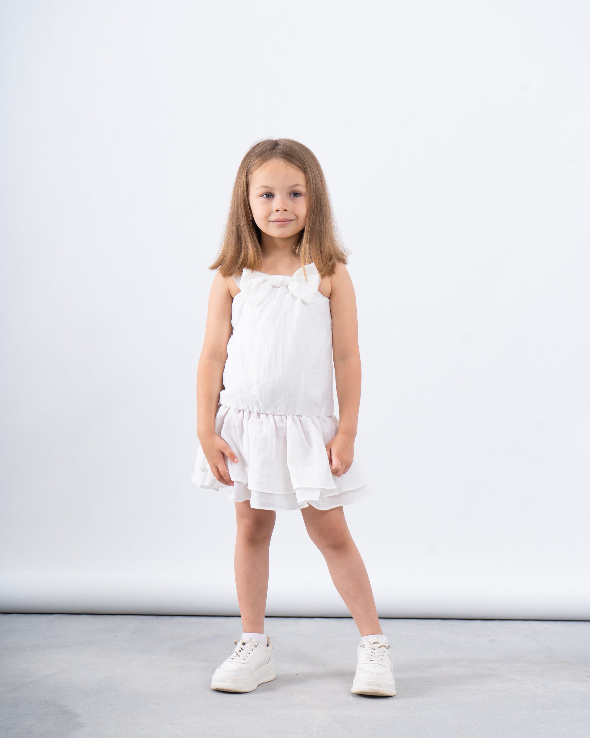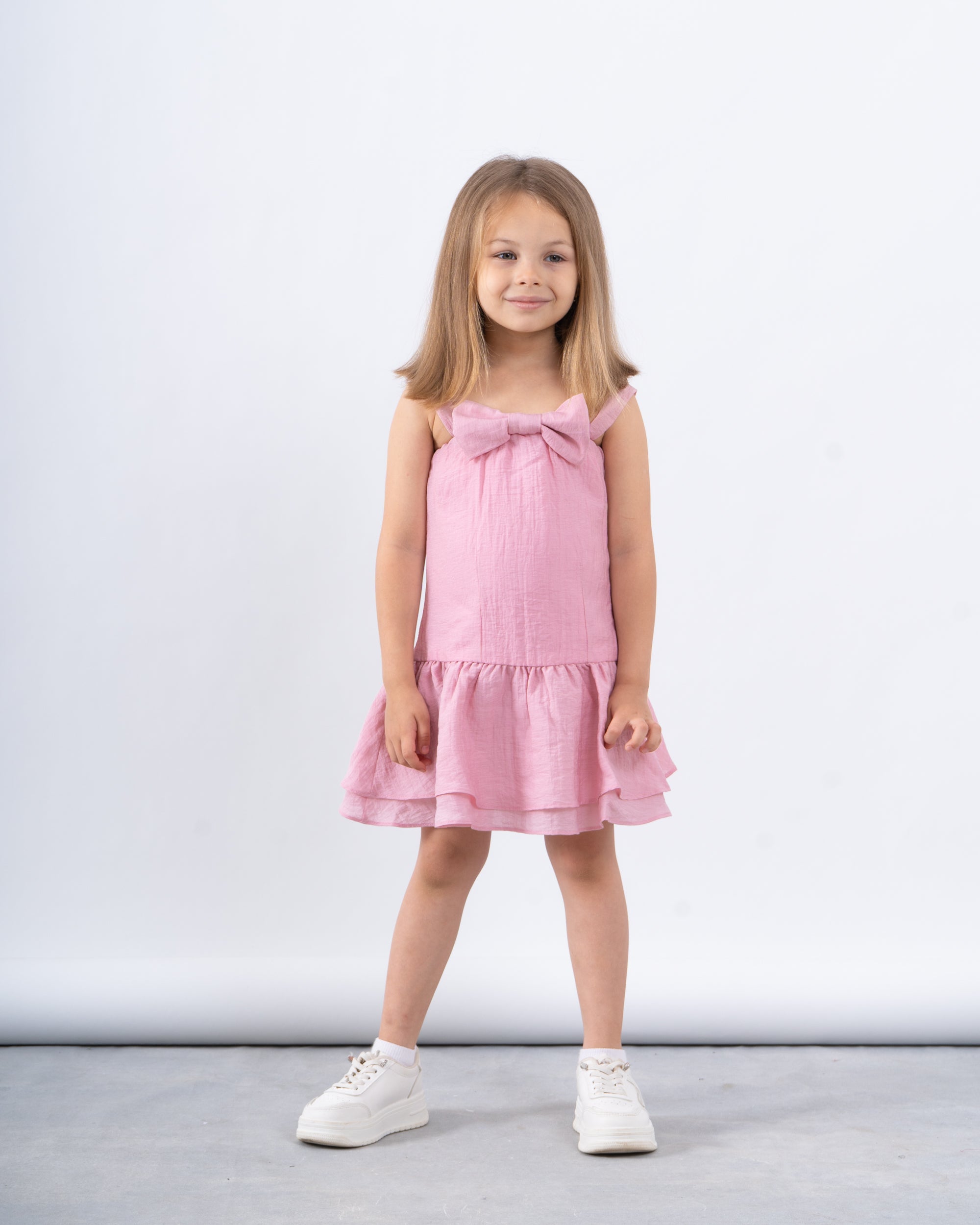 A charming and playful dress featuring a large bow detail on the front. This sleeveless design has delicate straps and a tiered ruffle hem for a touch of flair. Ideal for special occasions, outings, or casual days.