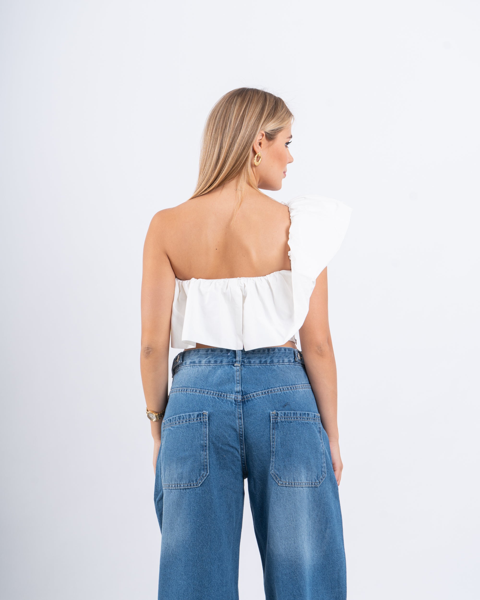 Make a playful statement with this asymmetrical crop top. Featuring a dramatic ruffle detail and a flattering one-shoulder cut, it adds a flirty twist to any summer look.
