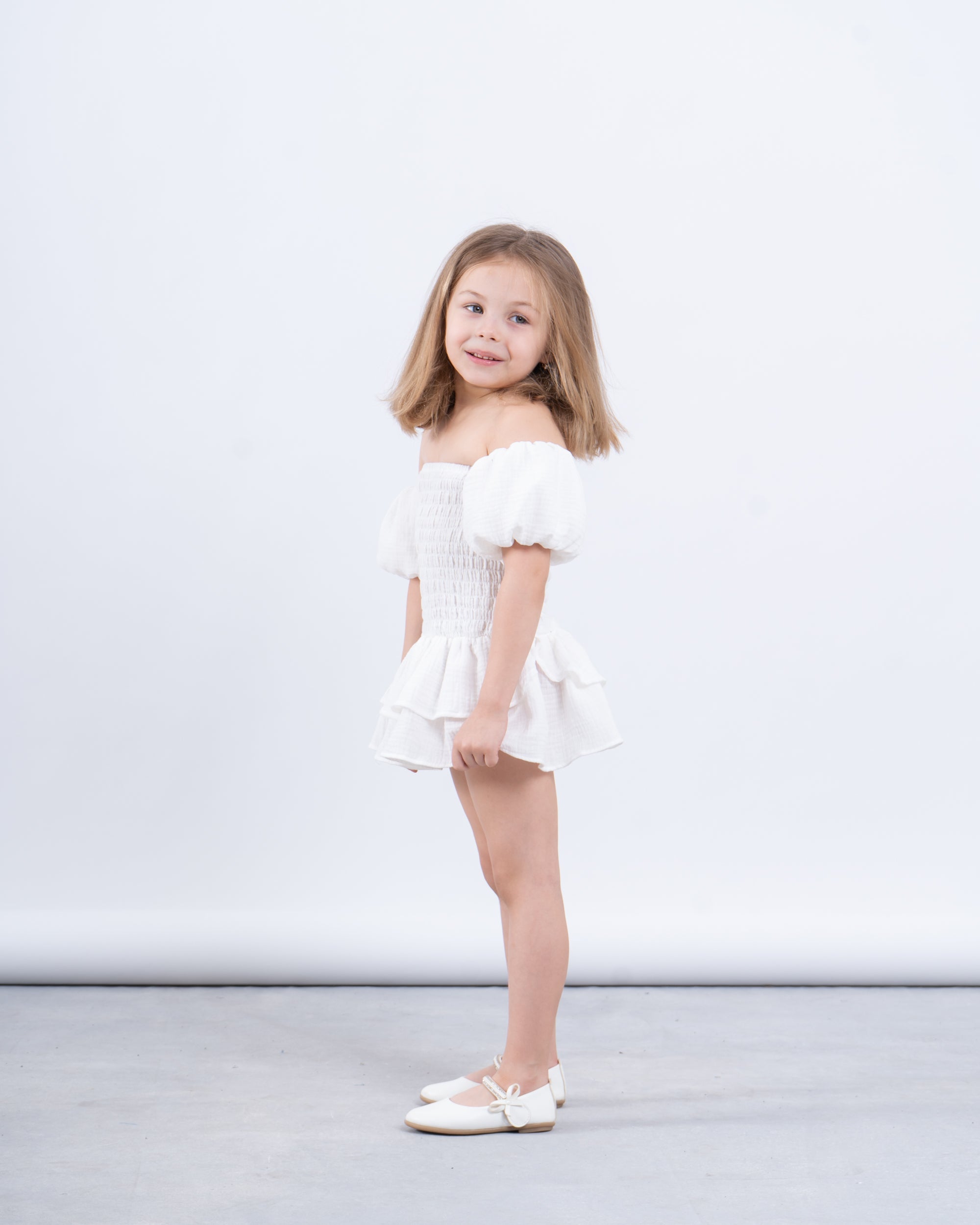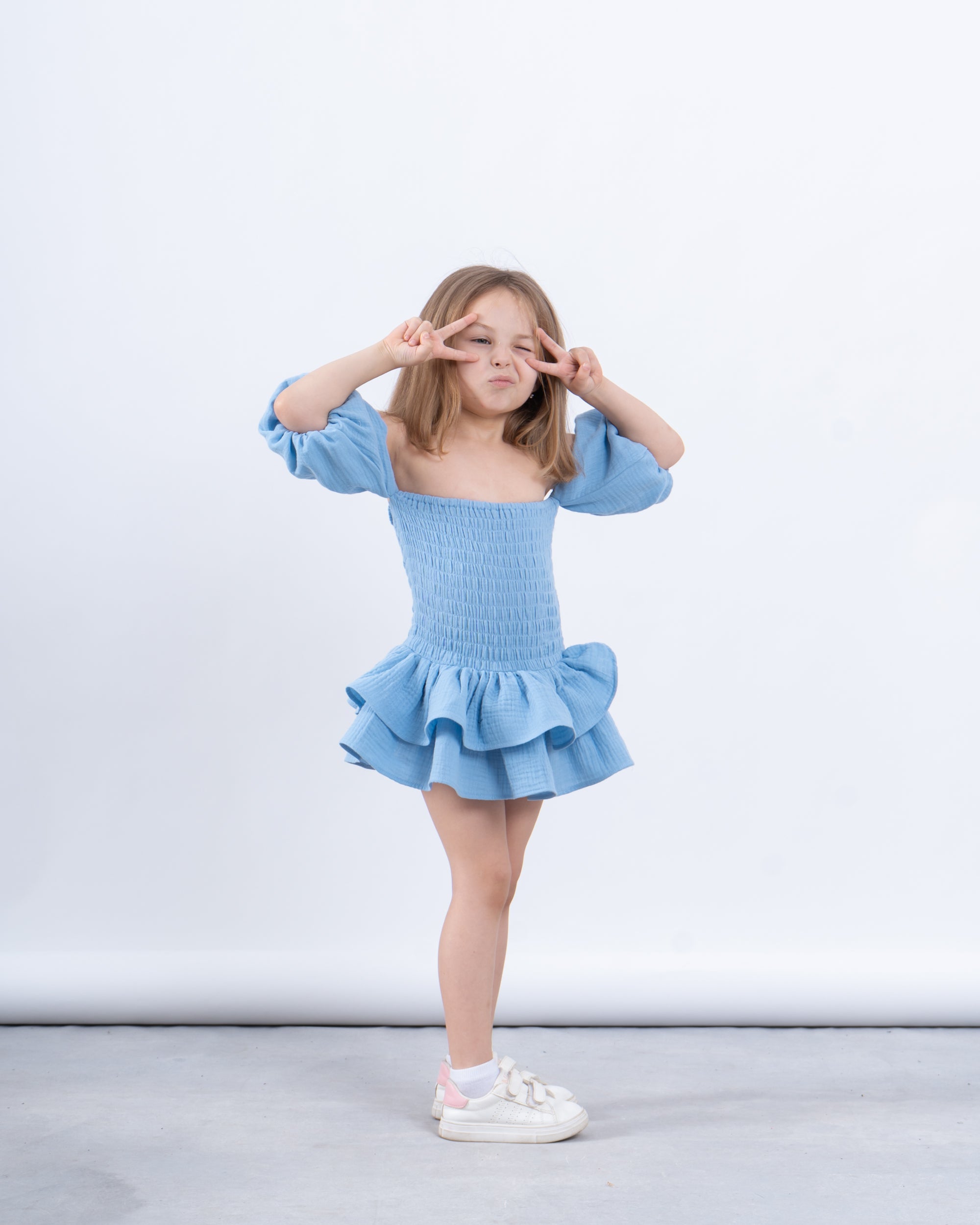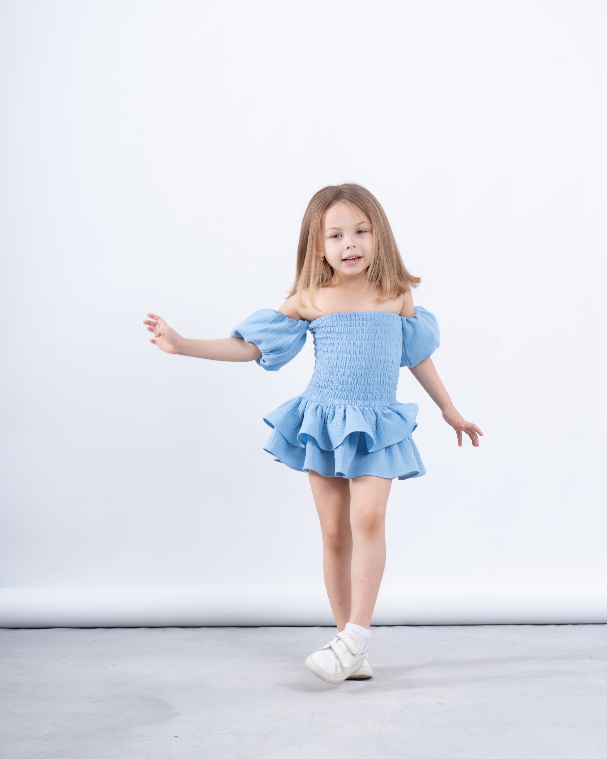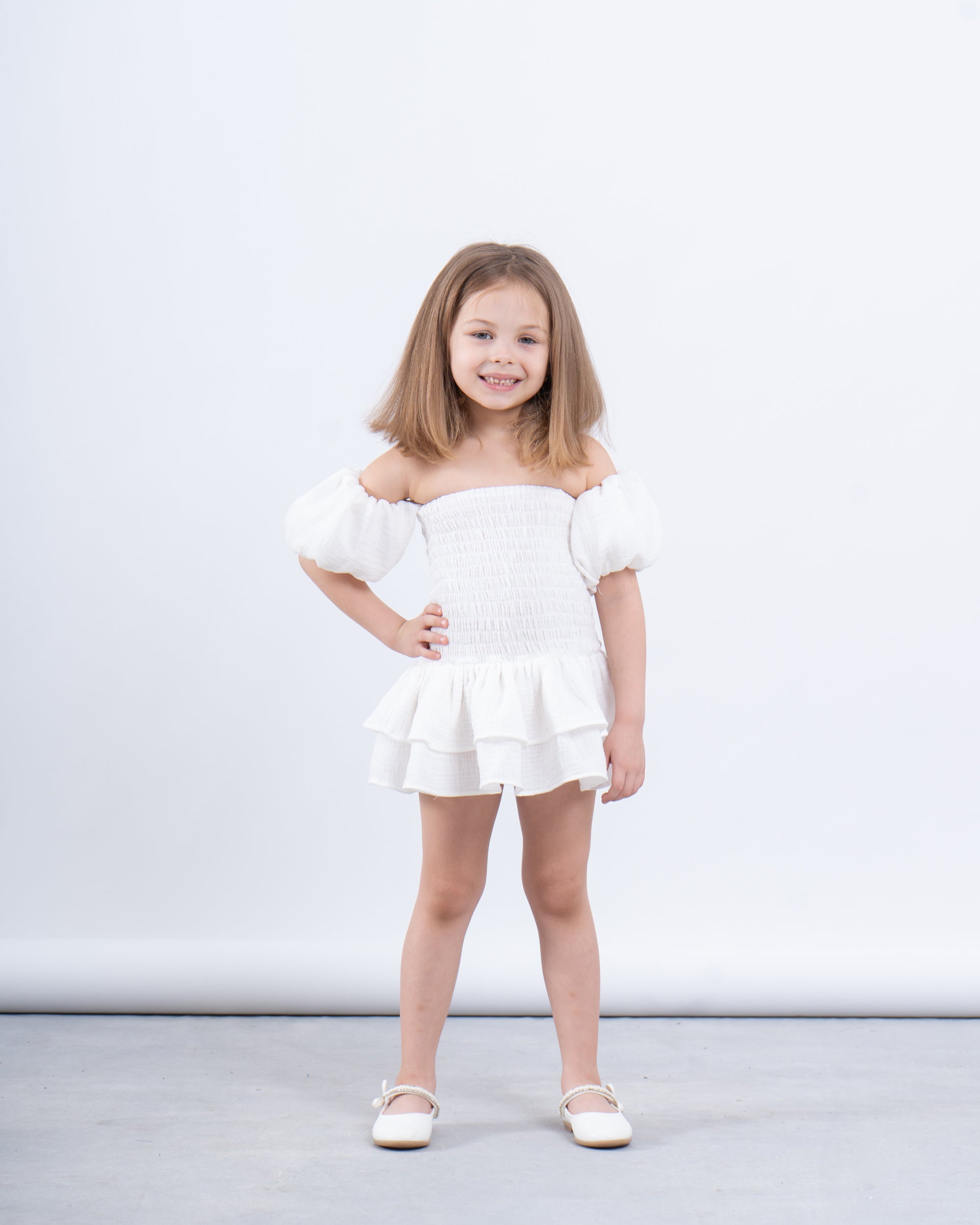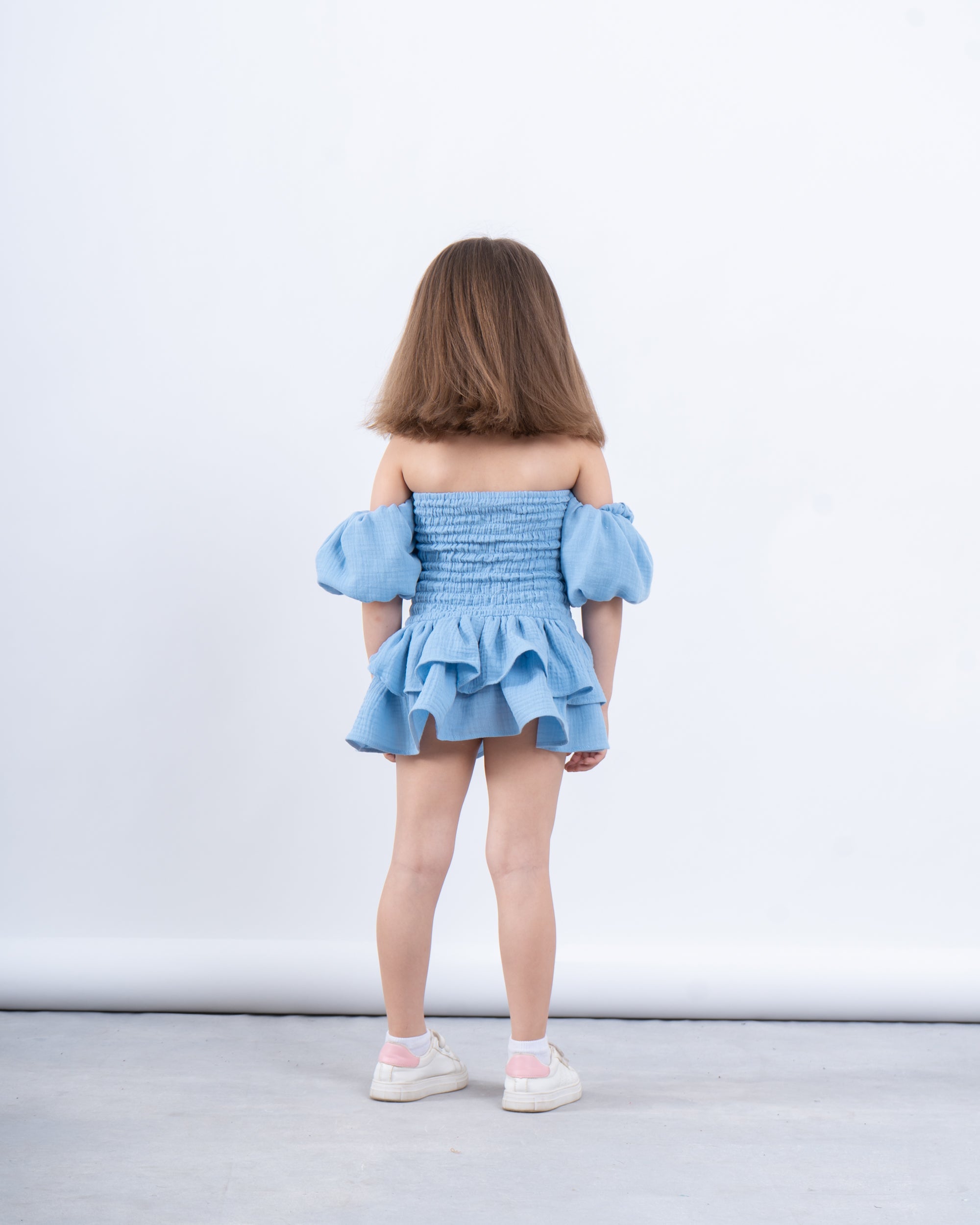A chic and playful dress designed for special moments. With its off-shoulder puffed sleeves, smocked bodice, and layered ruffle hem, it’s the perfect blend of elegance and fun. Ideal for Eid celebrations and summer outings.
