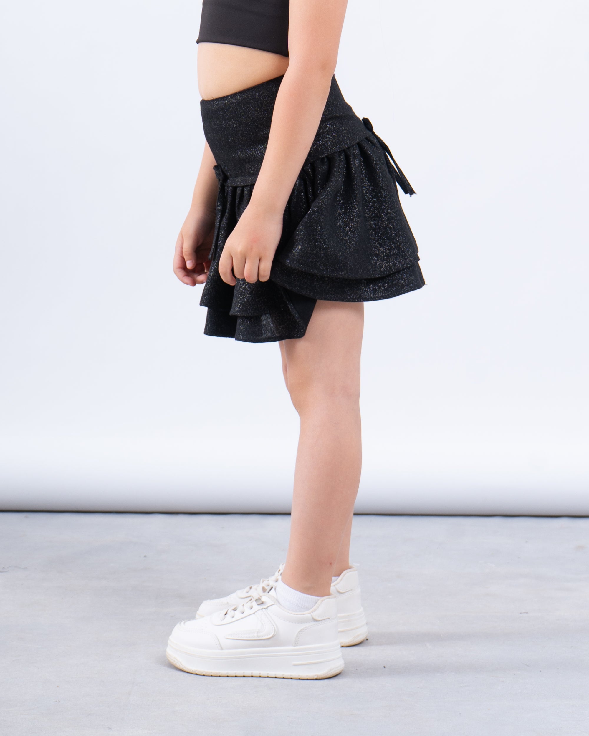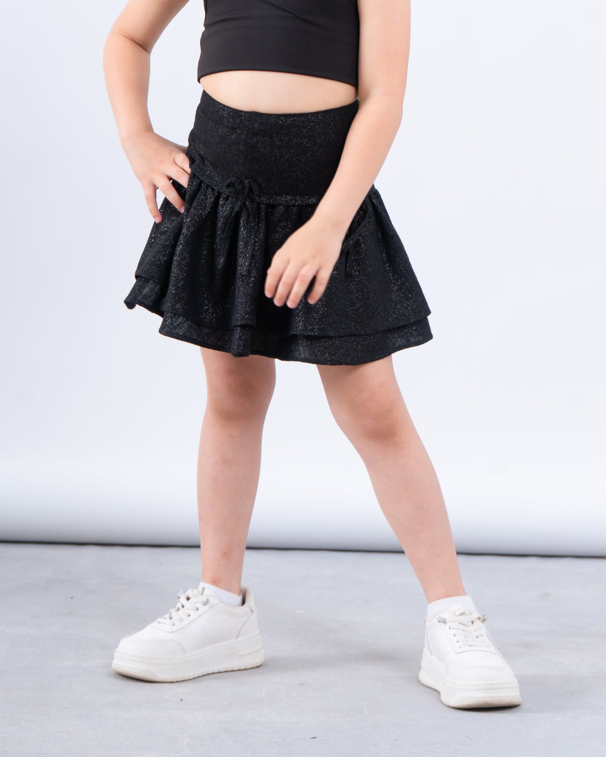Shimmering flared skirt with a layered ruffle hem and a soft elastic waistband. Designed in sparkly fabric for a standout party look. Finished with dainty side bows that add a playful twist.