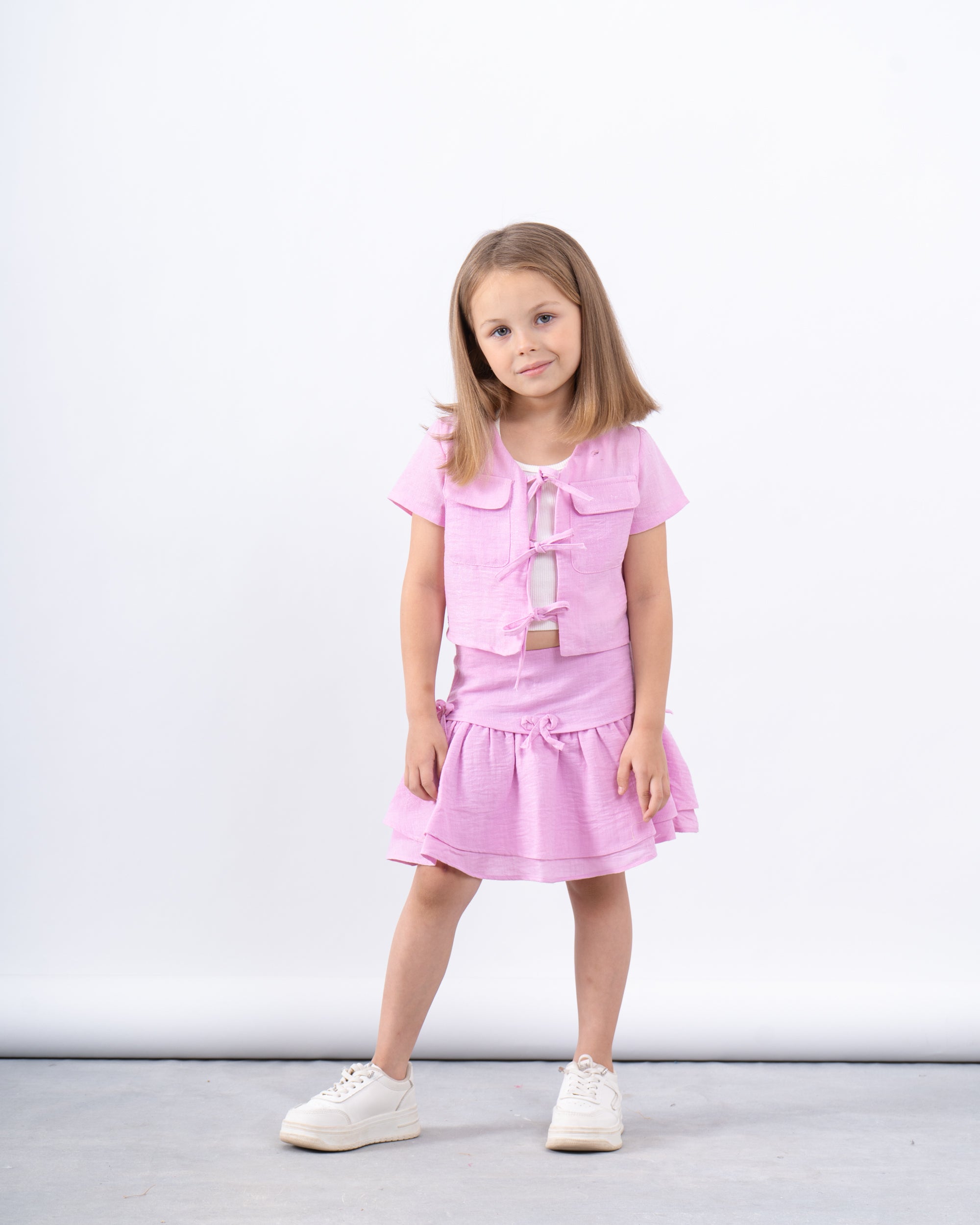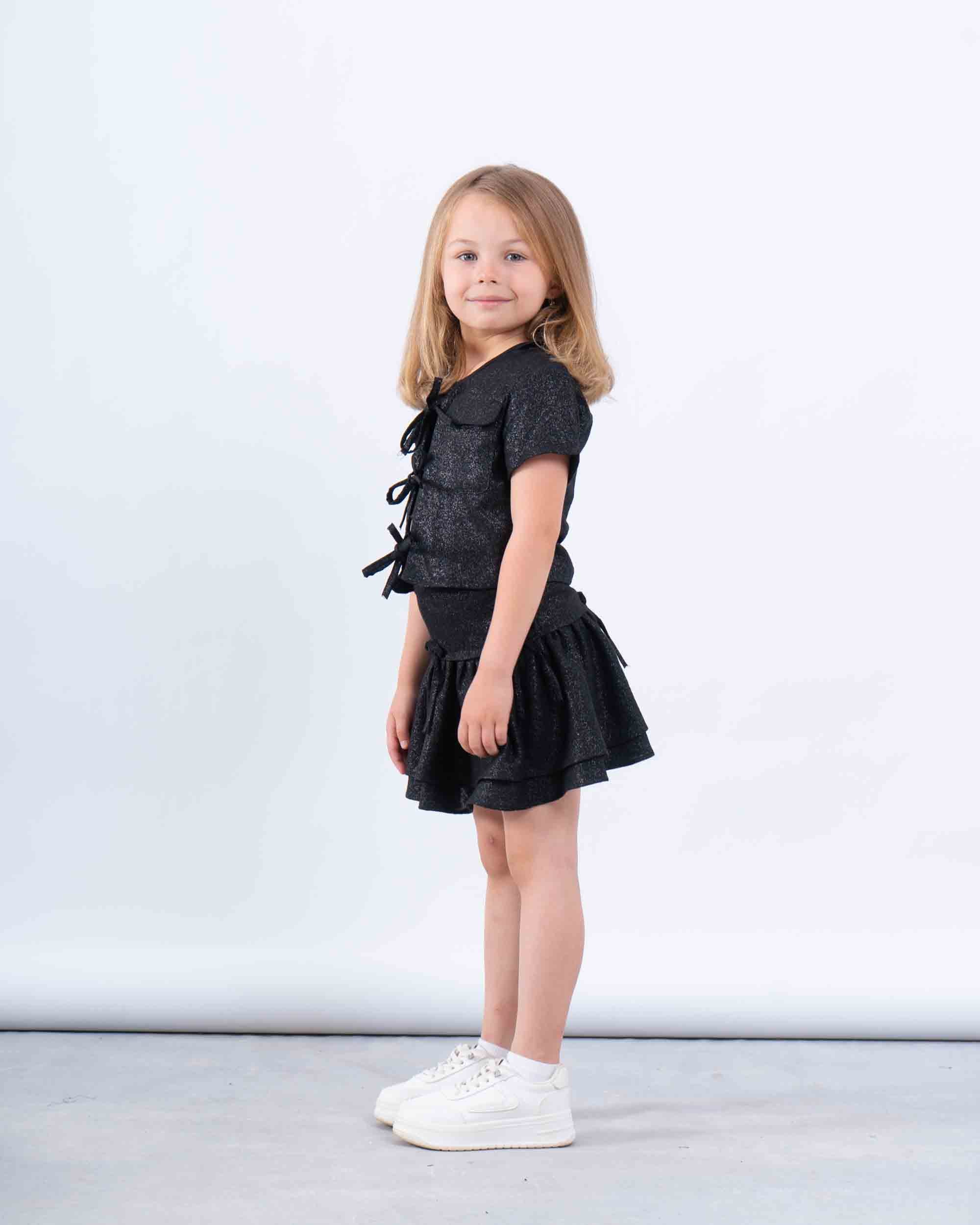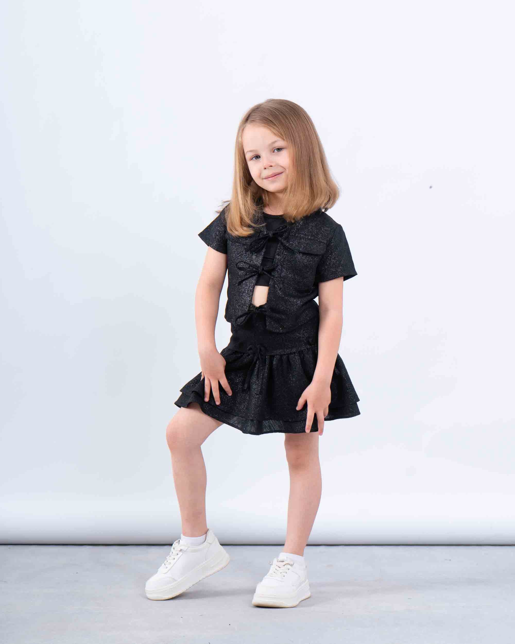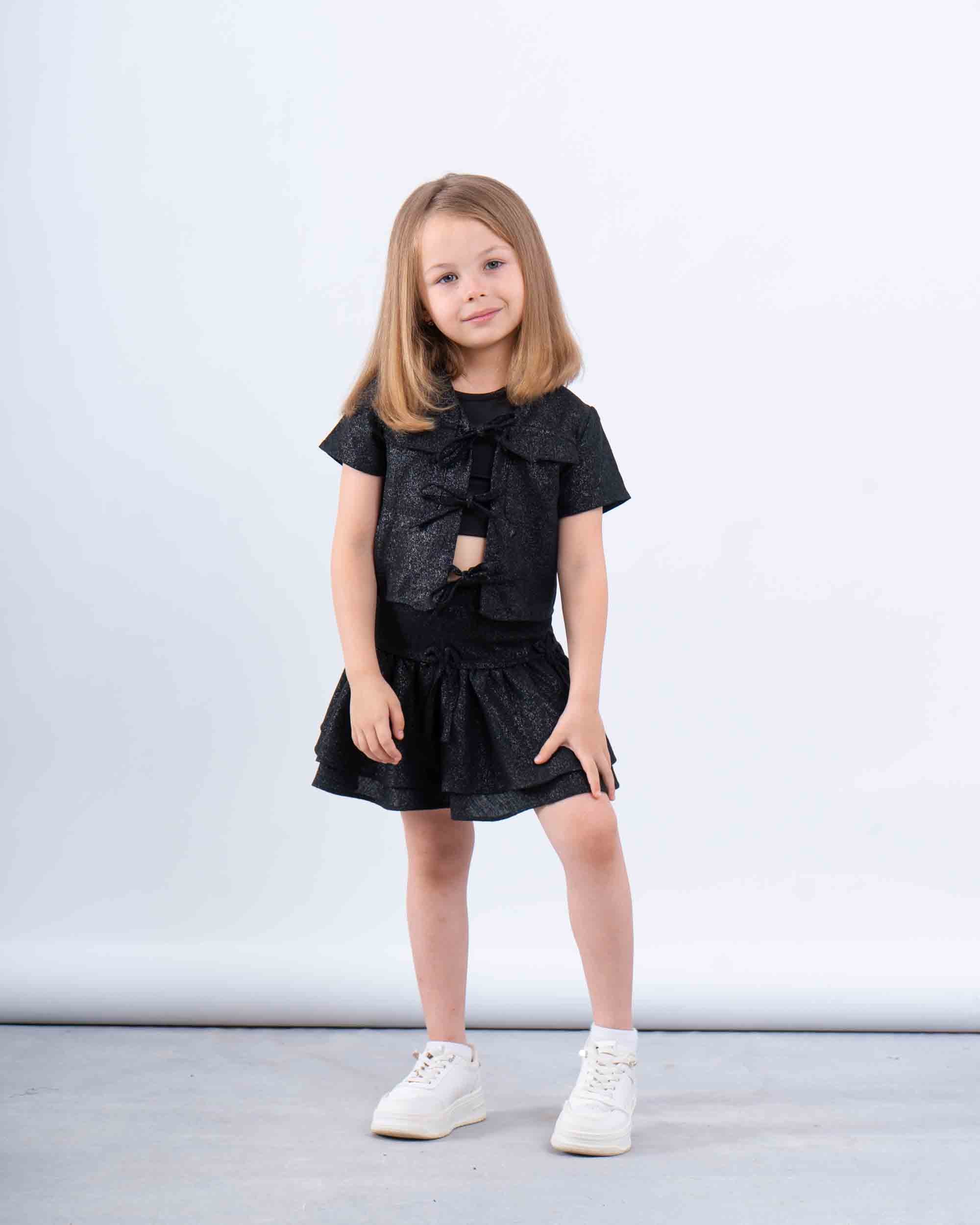 Shine bright with this glittery cropped jacket featuring three dainty front bows and a statement collar. Whether layered or worn alone, this piece adds playful glam to any outfit—especially when paired with the matching skirt.