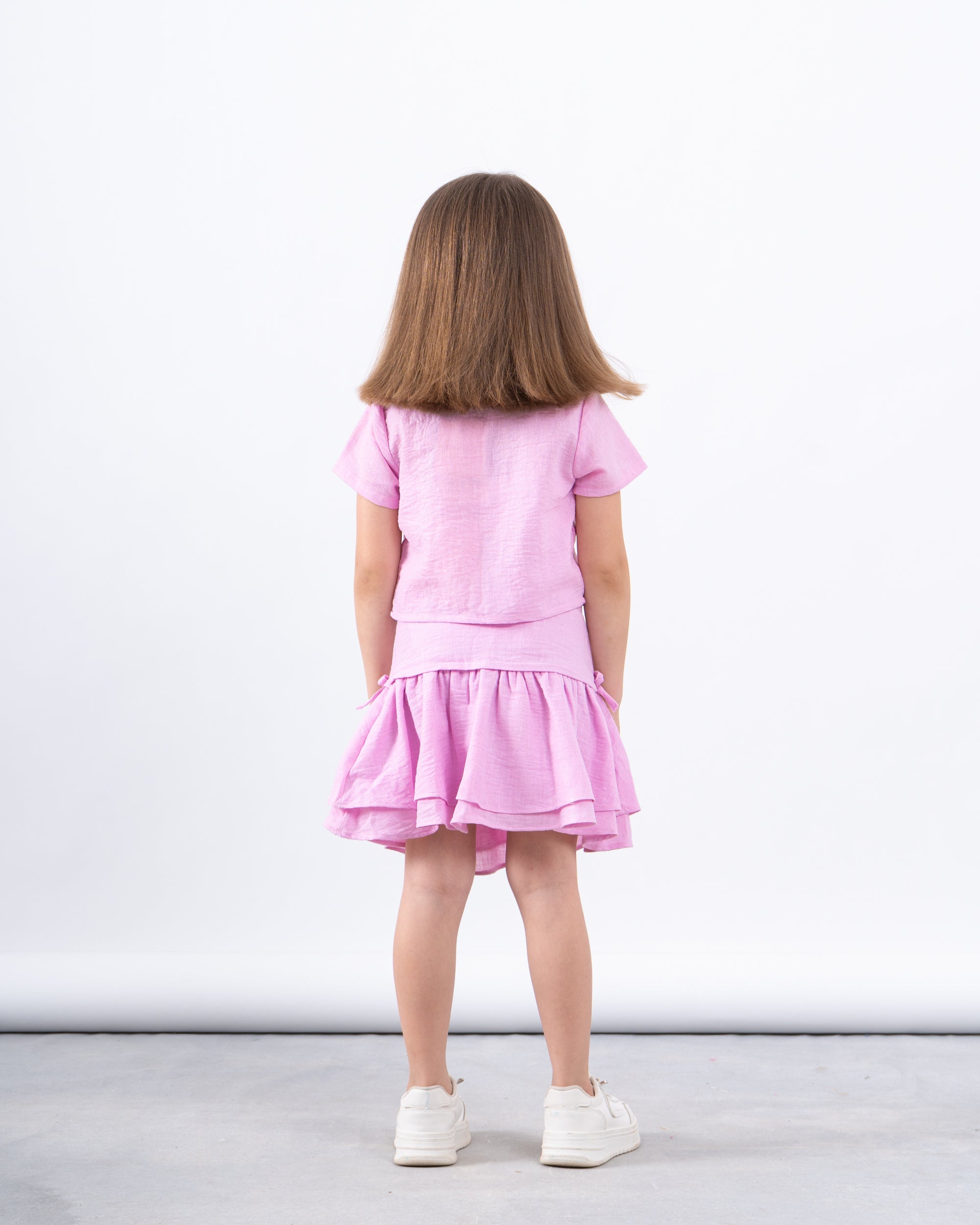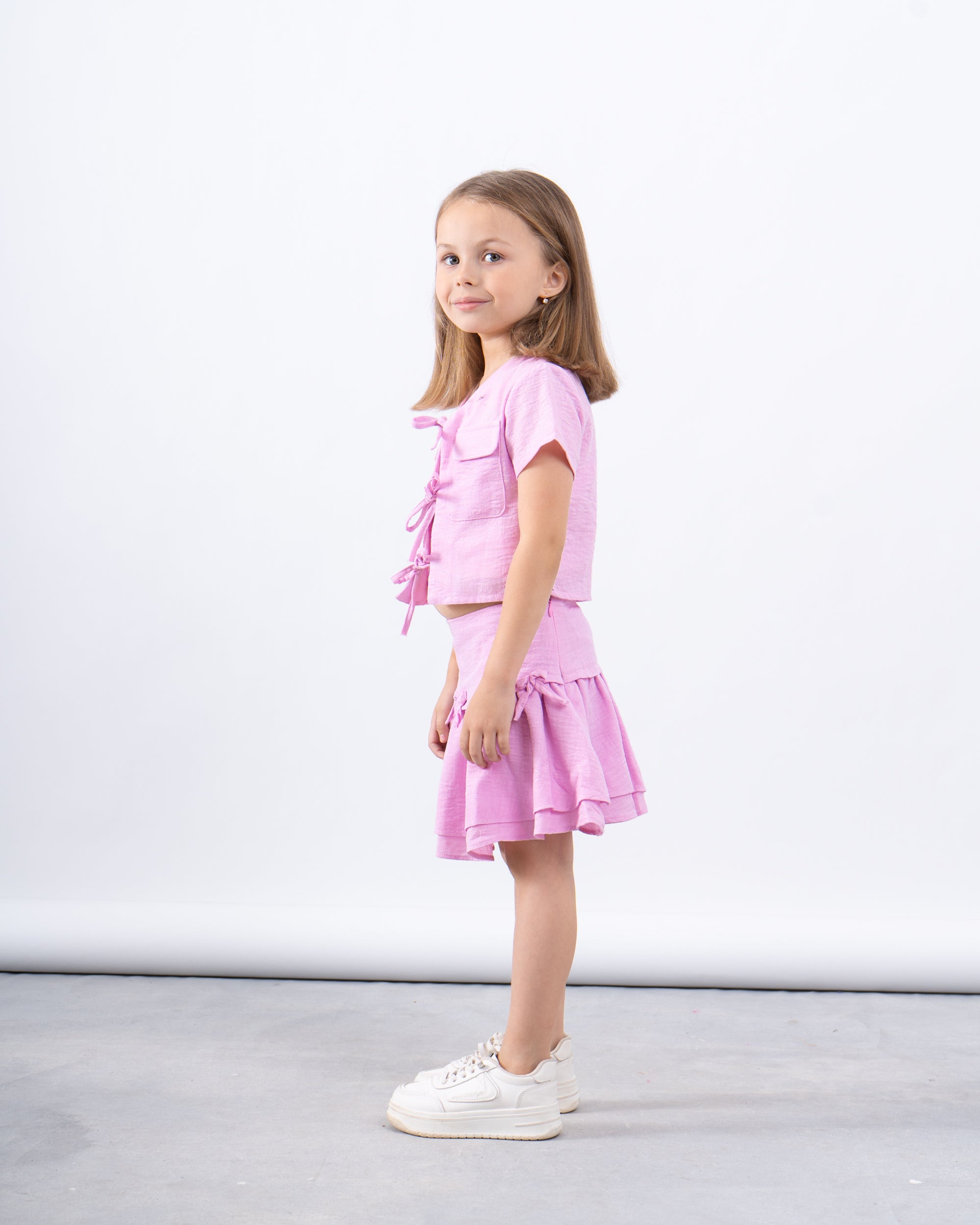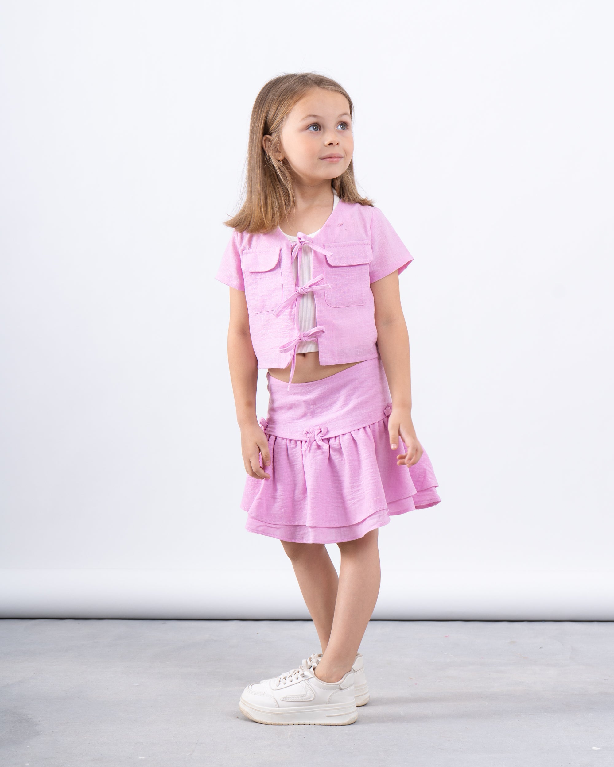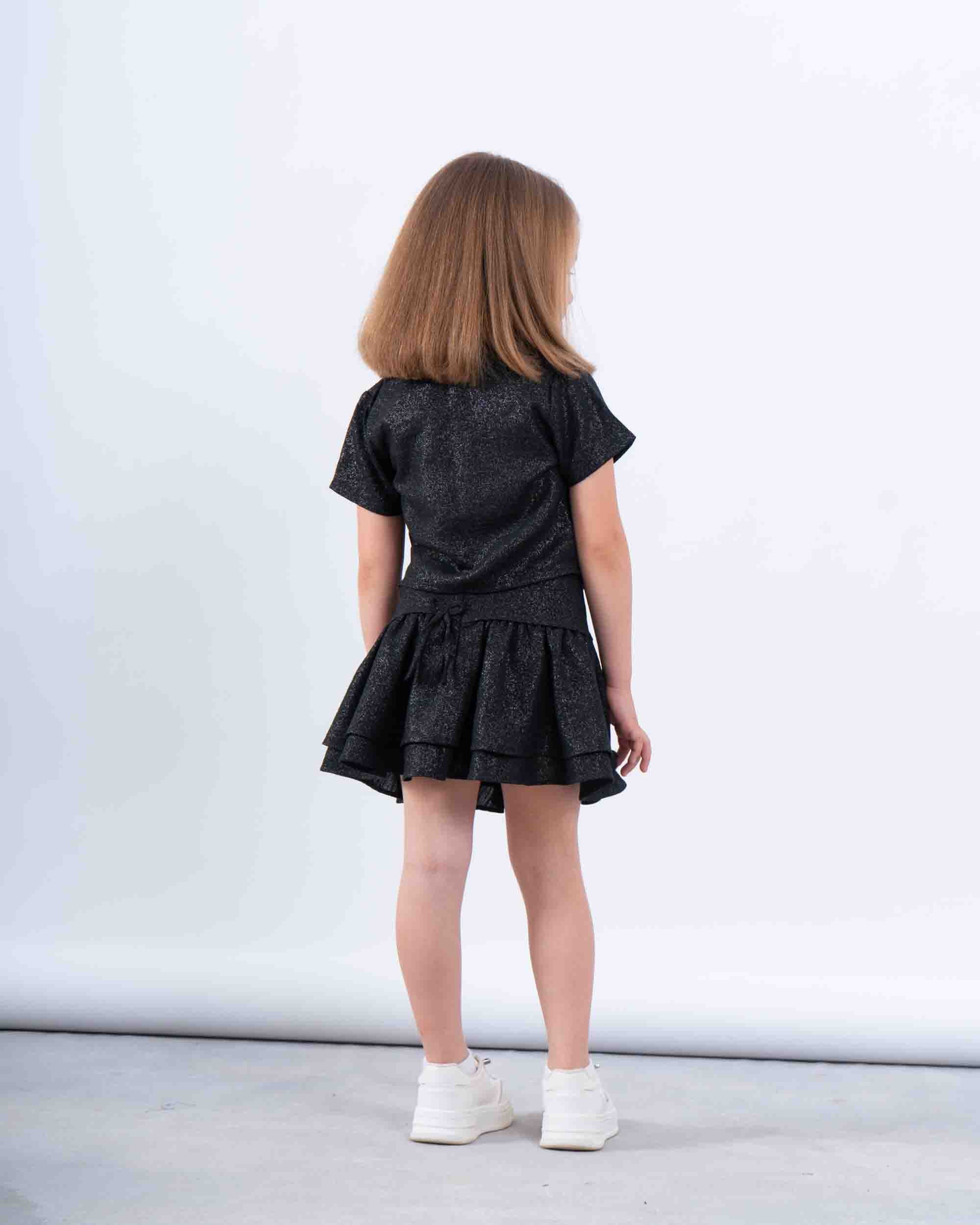 Shine bright with this glittery cropped jacket featuring three dainty front bows and a statement collar. Whether layered or worn alone, this piece adds playful glam to any outfit—especially when paired with the matching skirt.