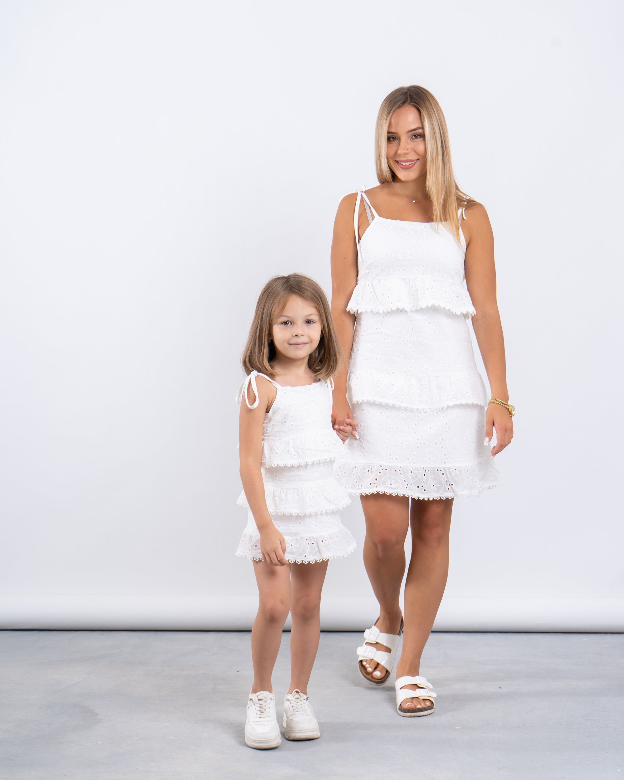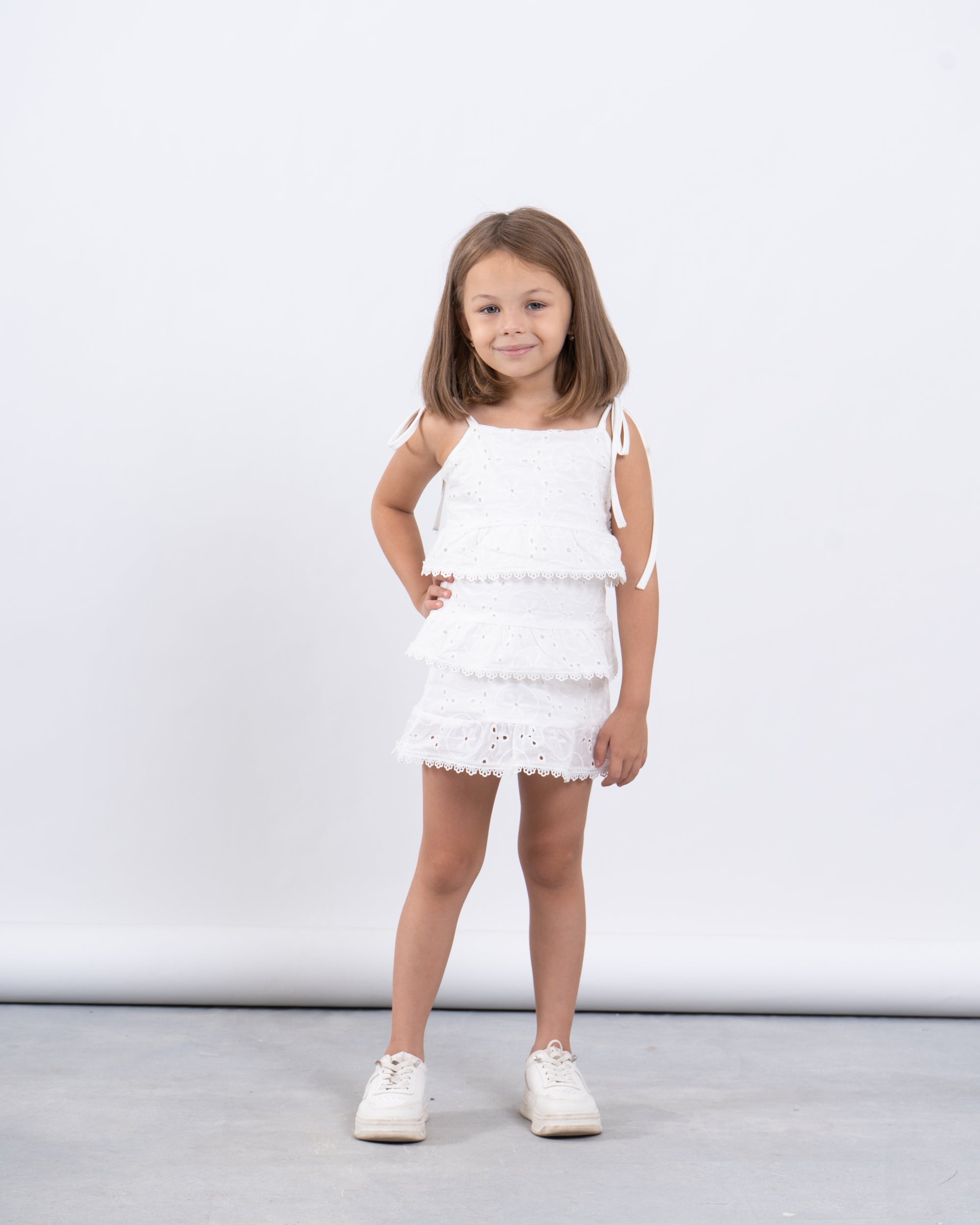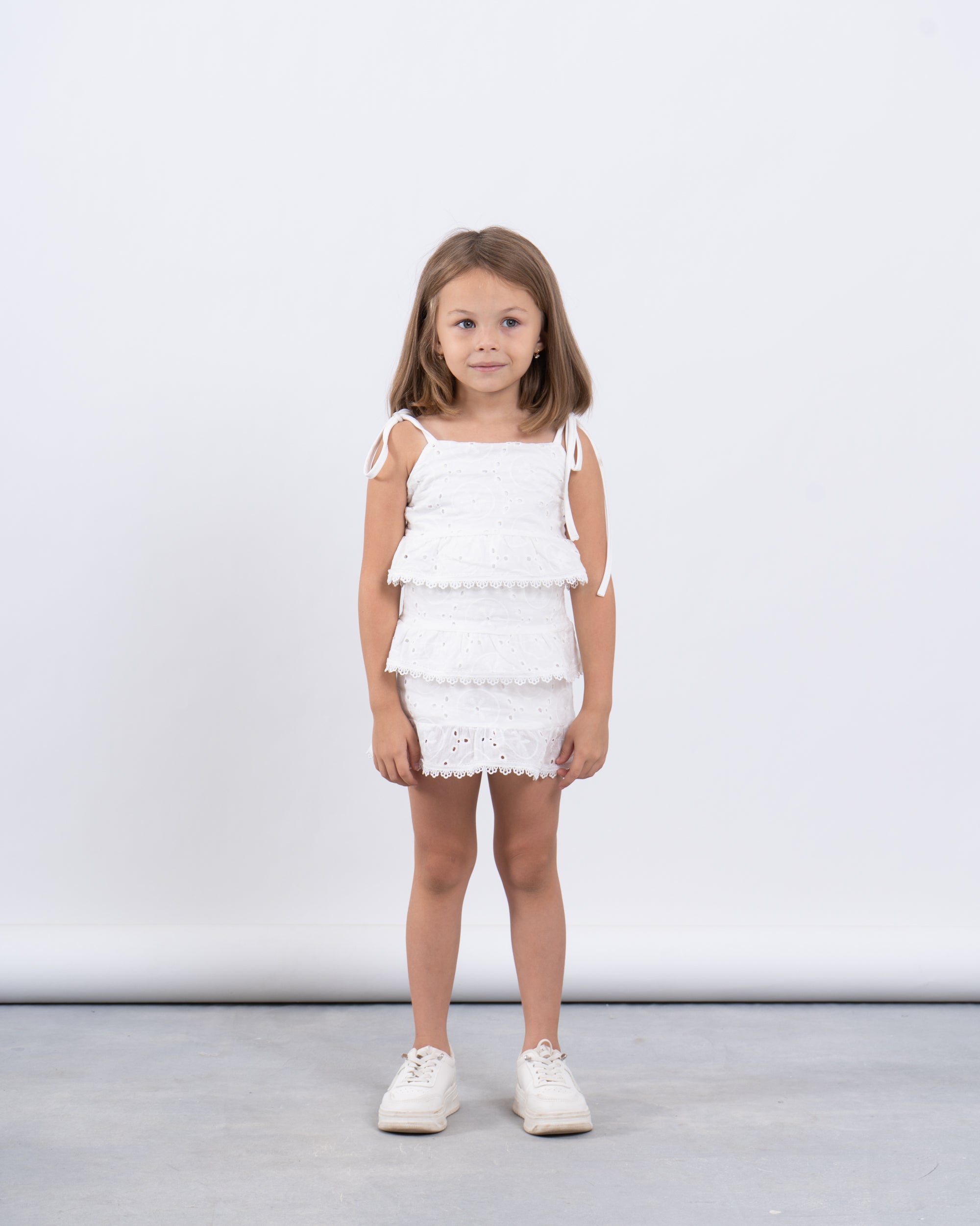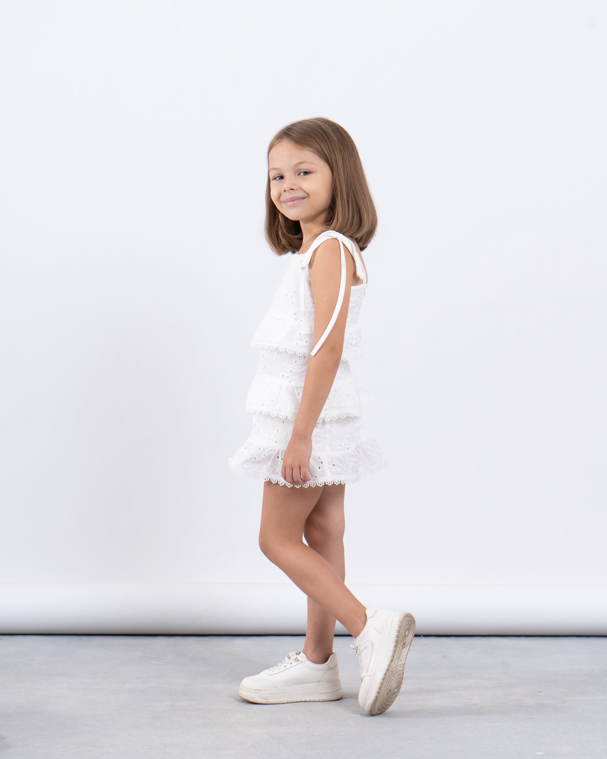 A playful summer statement in crisp white cotton. This sleeveless dress features delicate broderie anglaise embroidery, three-tiered ruffles for added movement, and charming tie-up shoulder straps. A breezy and elegant choice for sunny days and special moments.