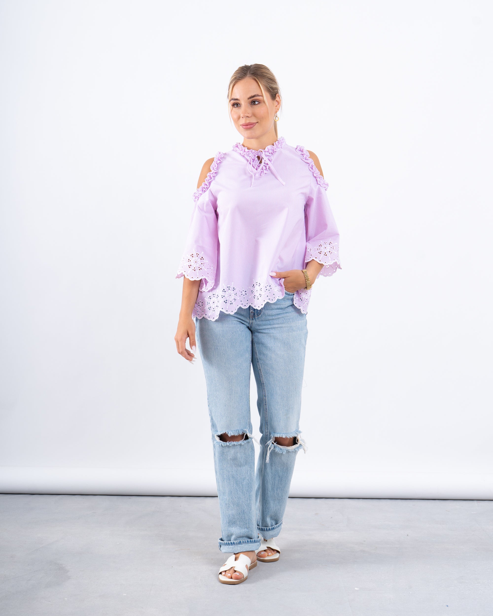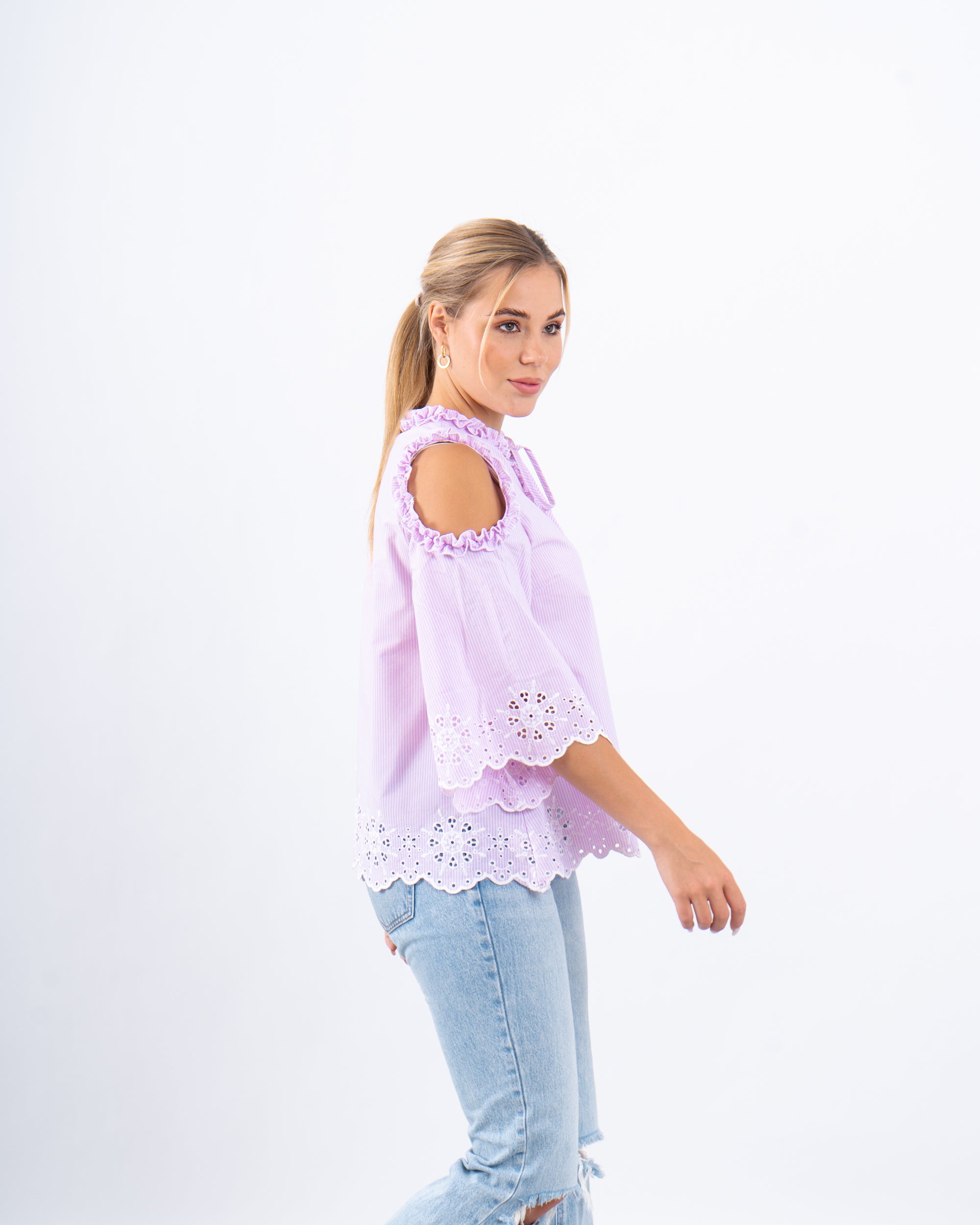 A breezy striped blouse with intricate eyelet lace details, designed to add a touch of elegance to your look. Perfect for sunny days and effortless style.