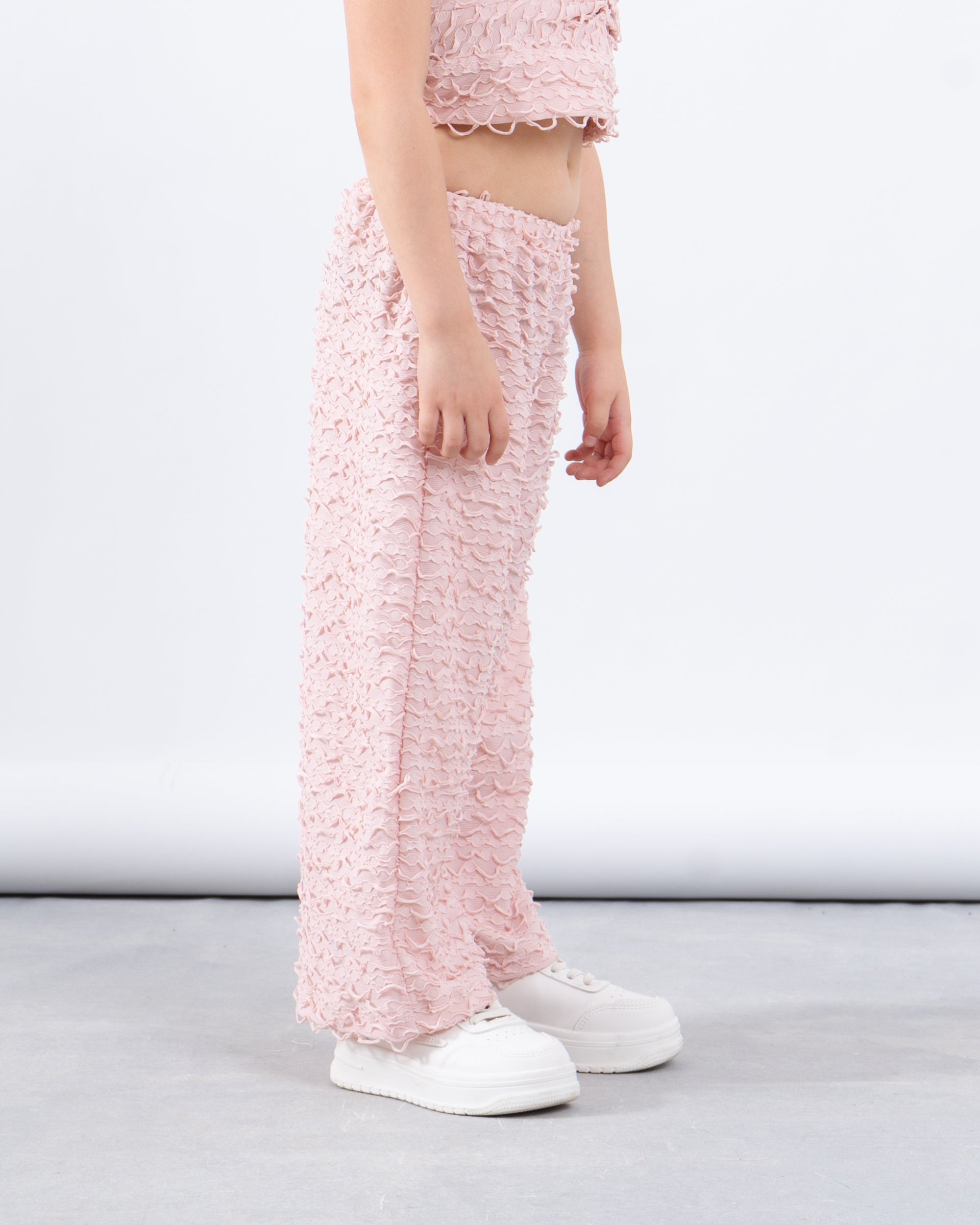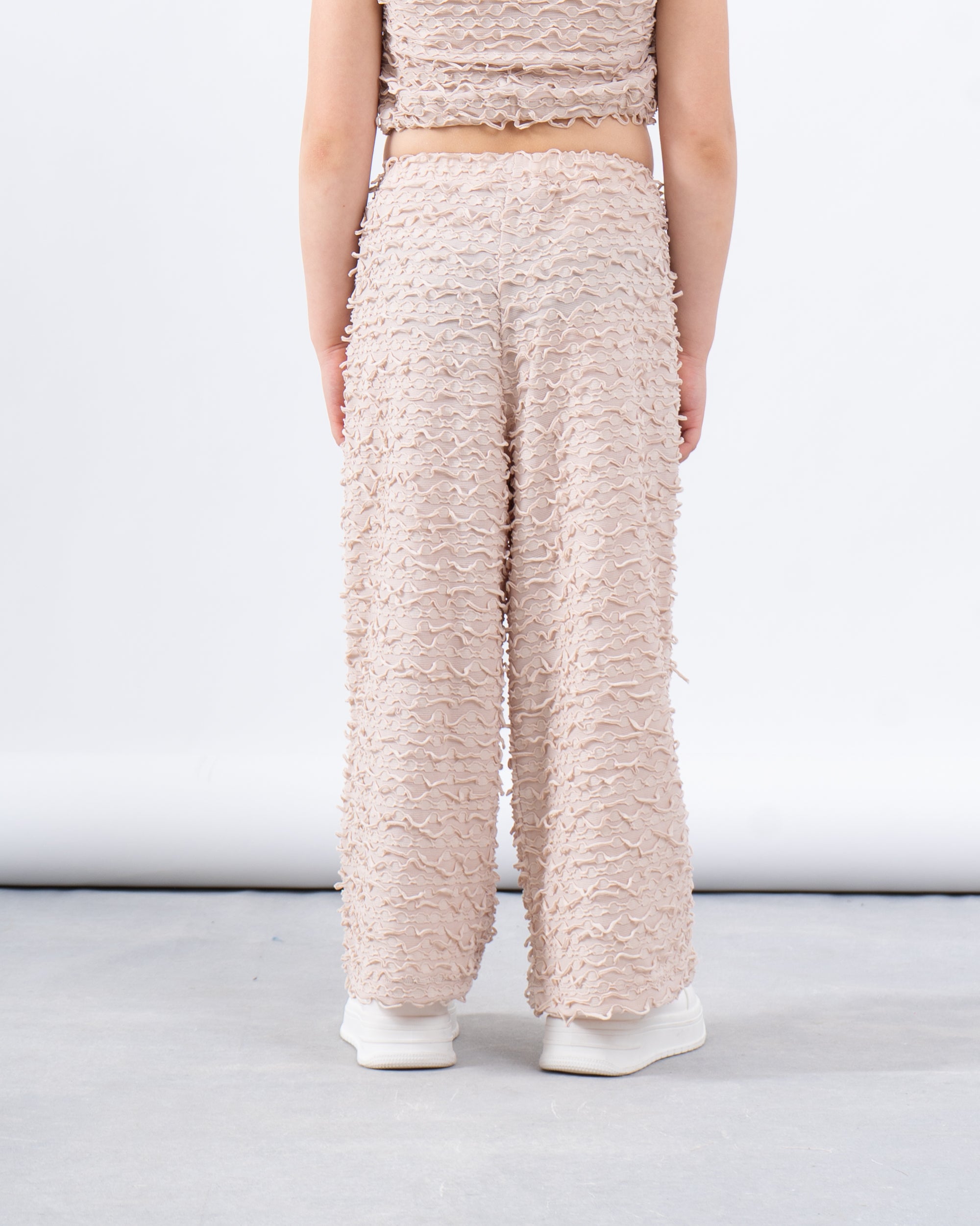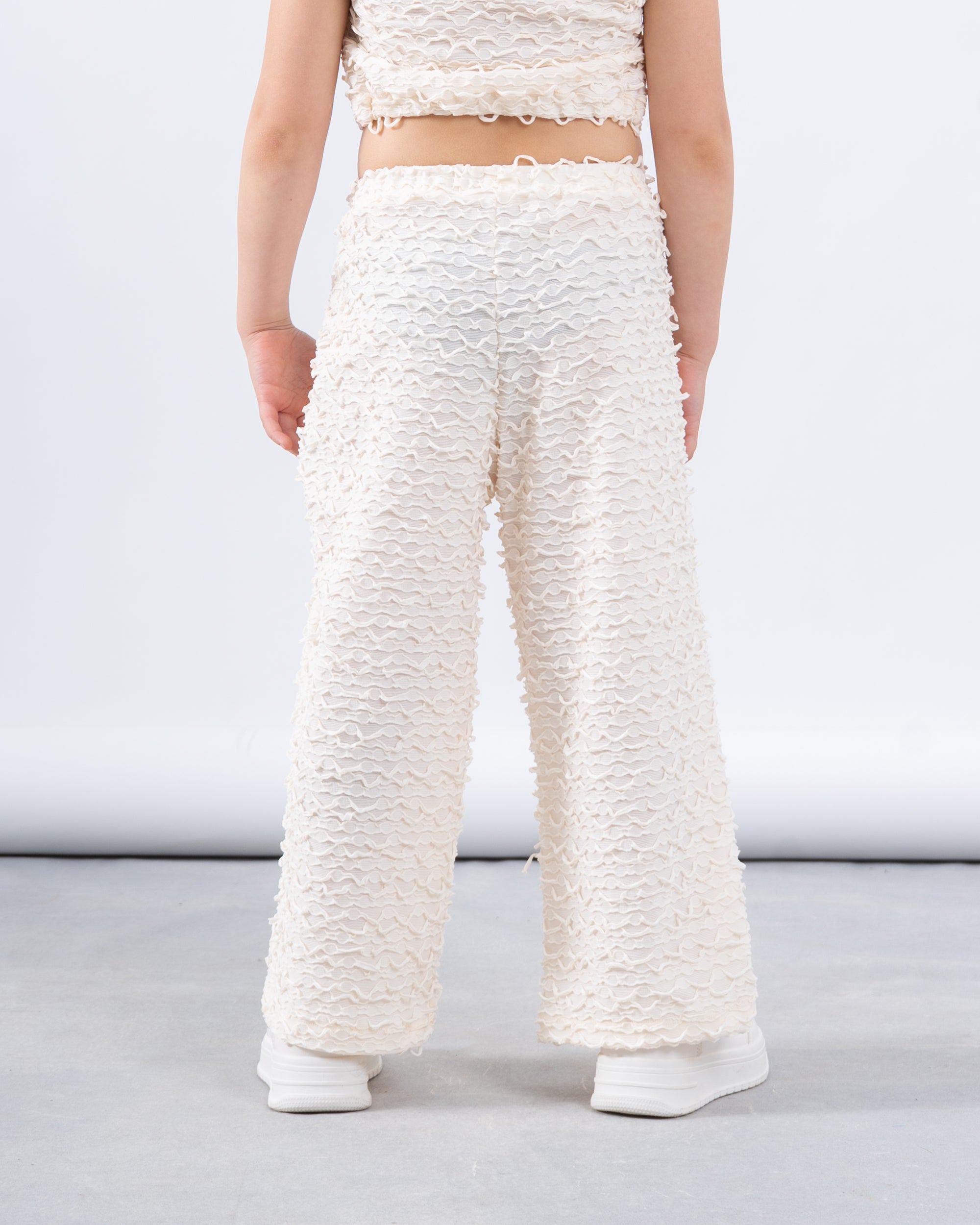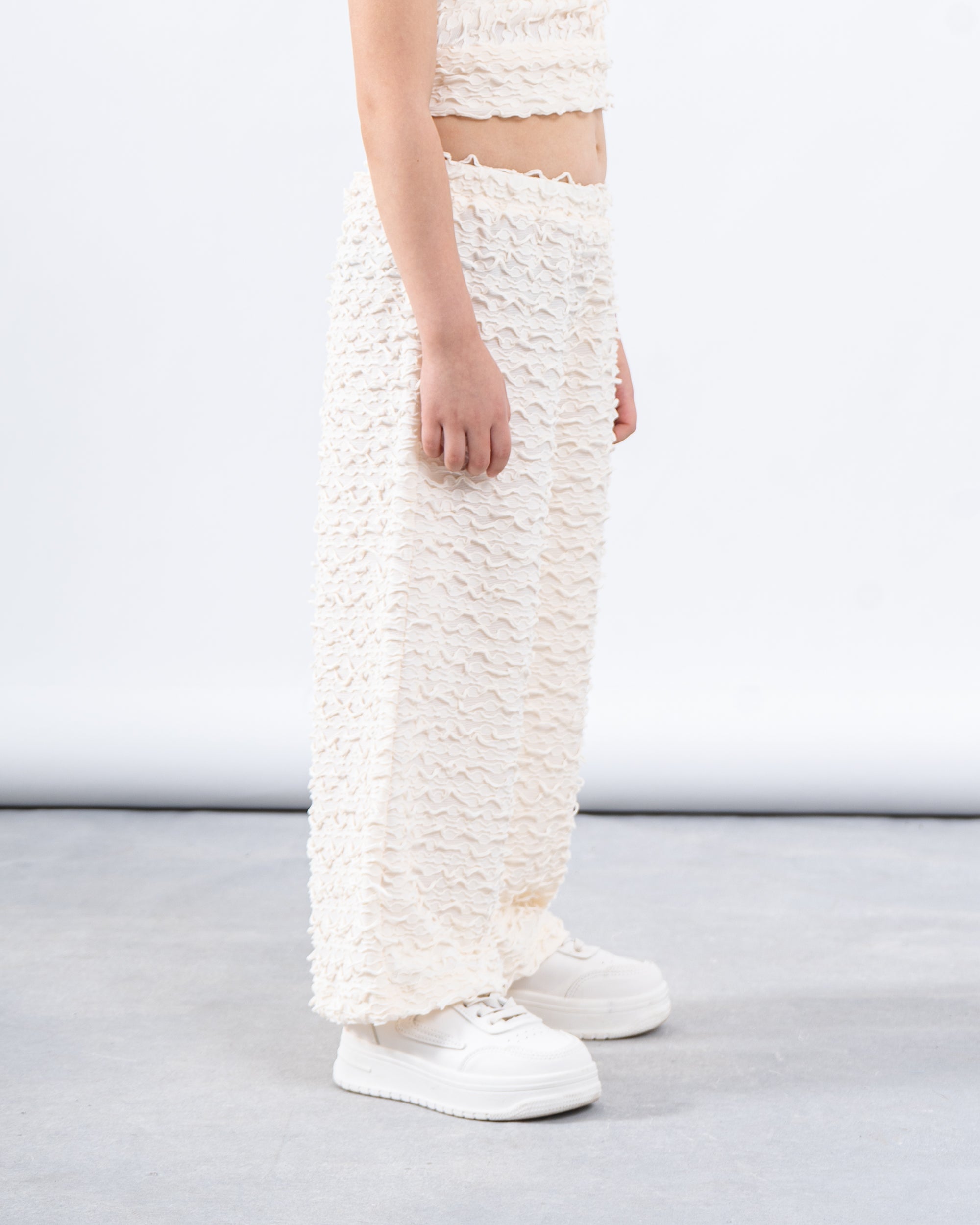 Wide-leg pants made from soft, stretch textured fabric with an all-over 3D wave effect. Designed for easy wear with a relaxed fit and elastic waistband for all-day comfort and movement.