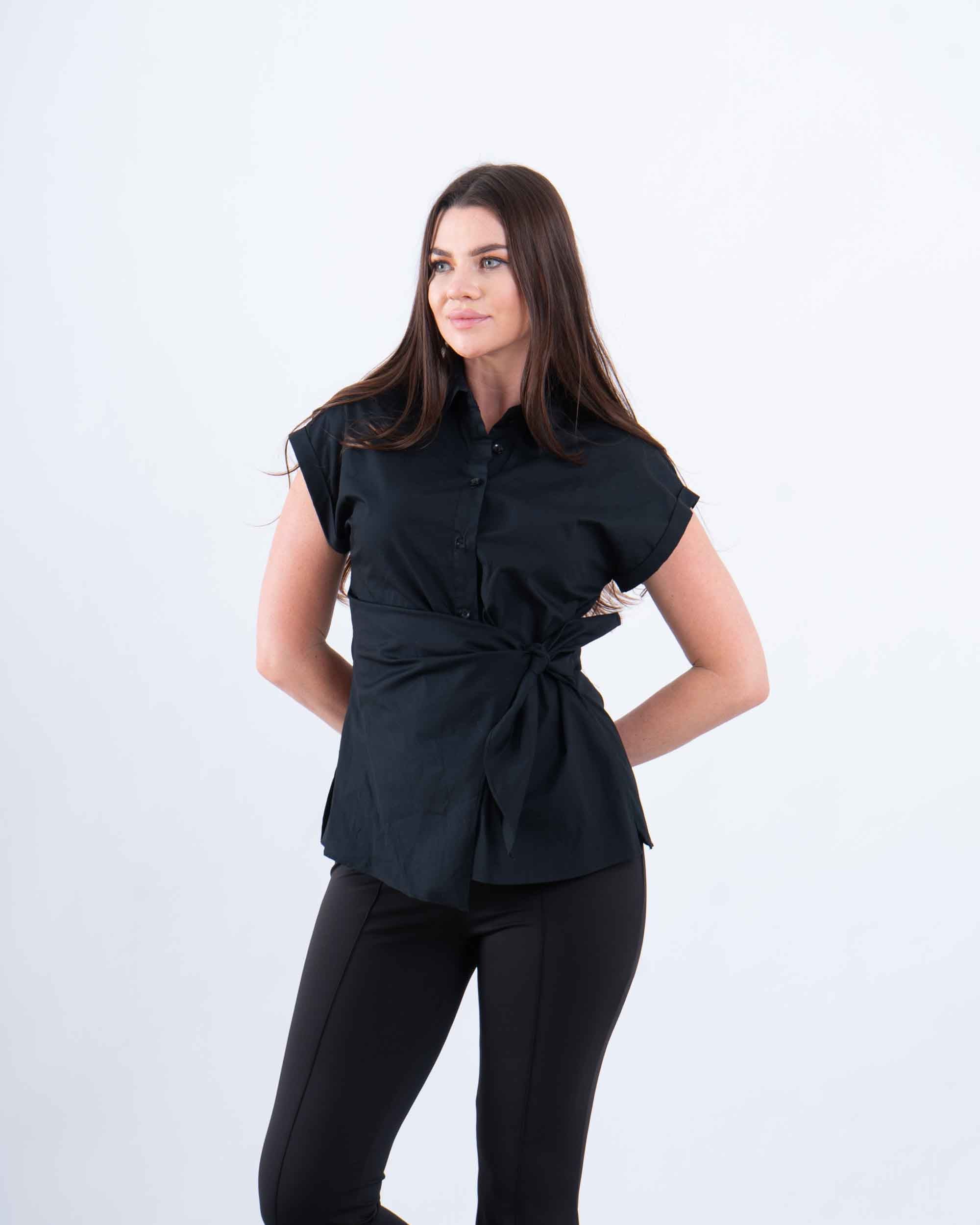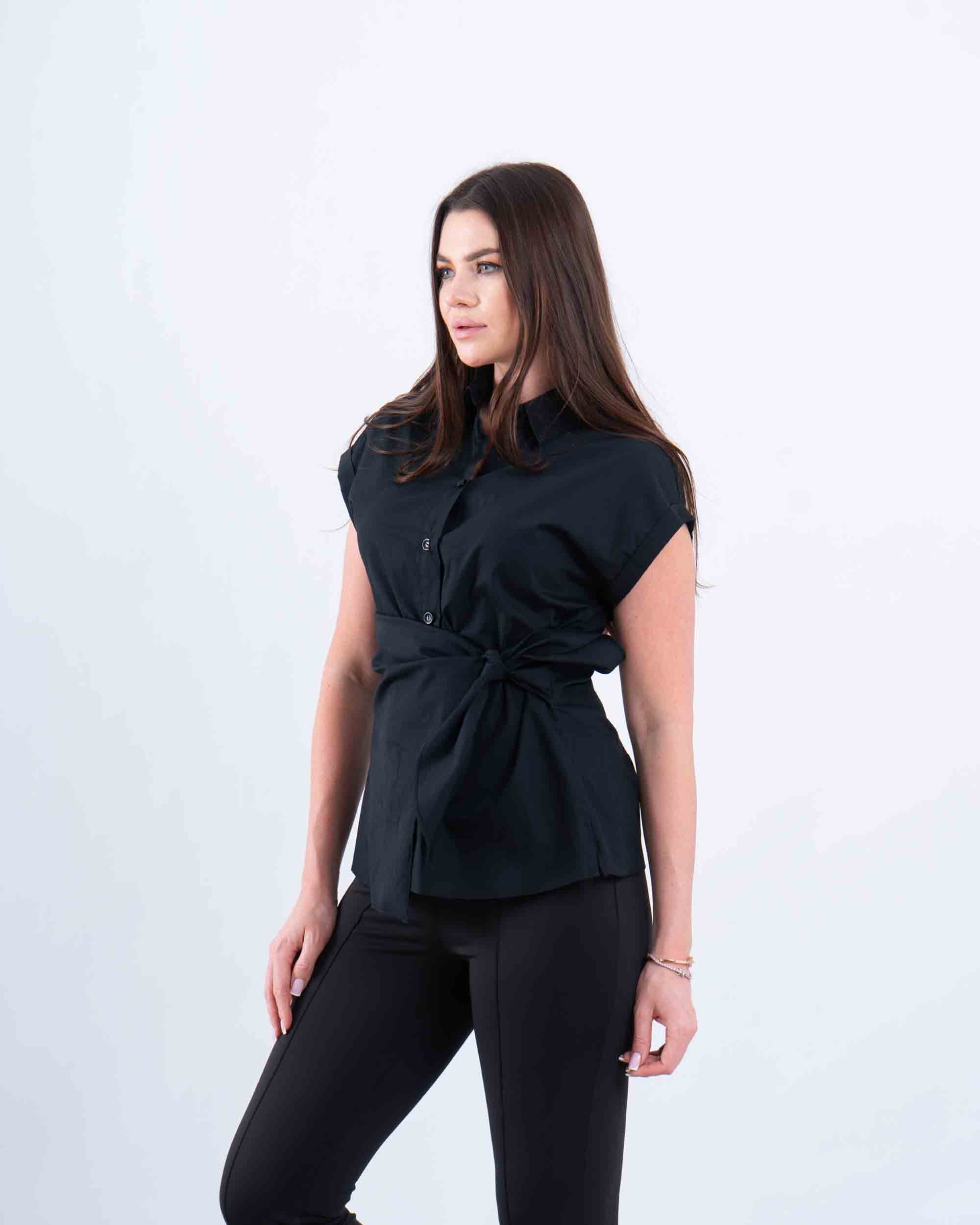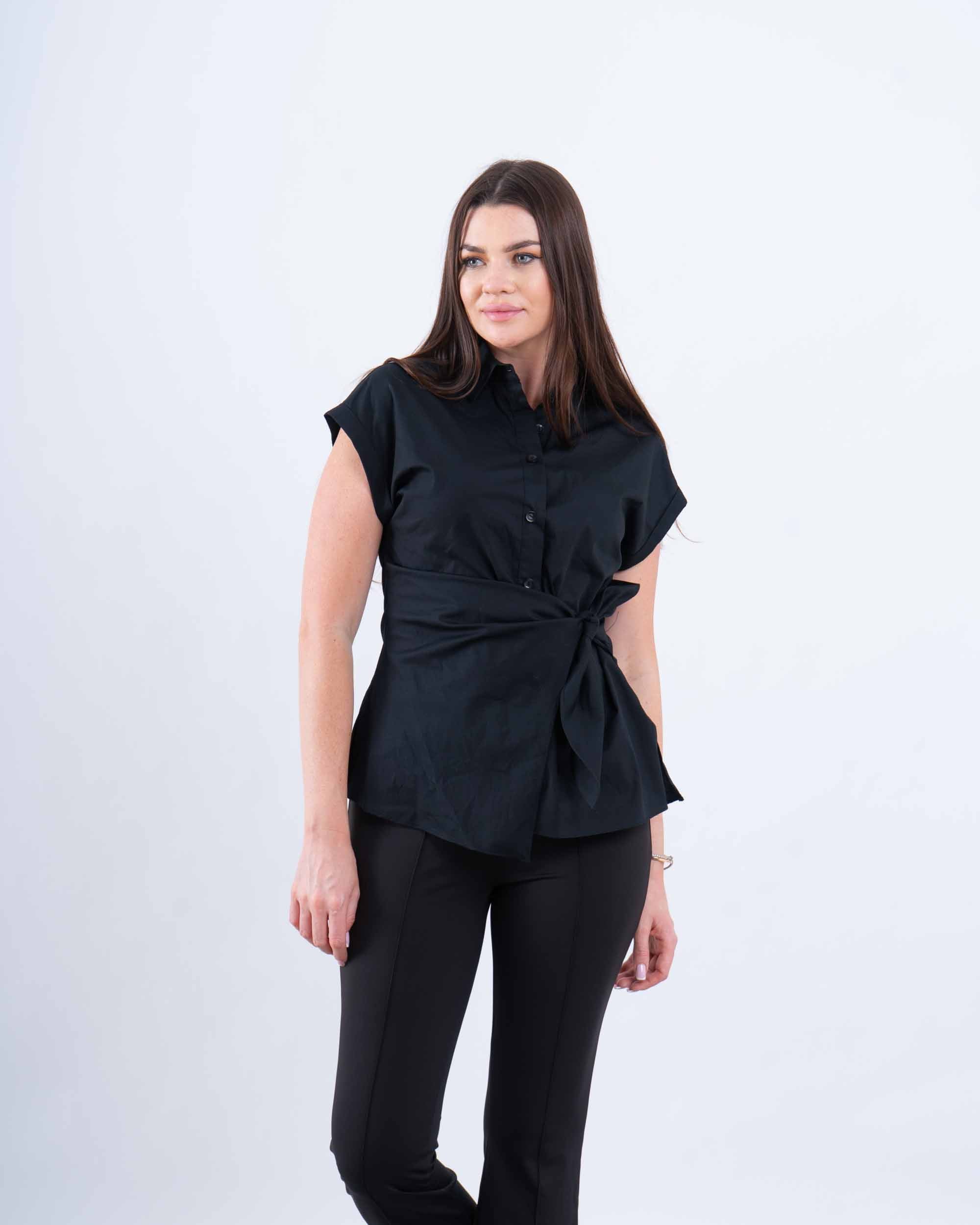 A modern twist on the classic shirt. This crisp poplin top features cap sleeves, a structured button-down front, and an adjustable waist tie for a flattering silhouette. An effortlessly chic essential for workdays or evenings out.