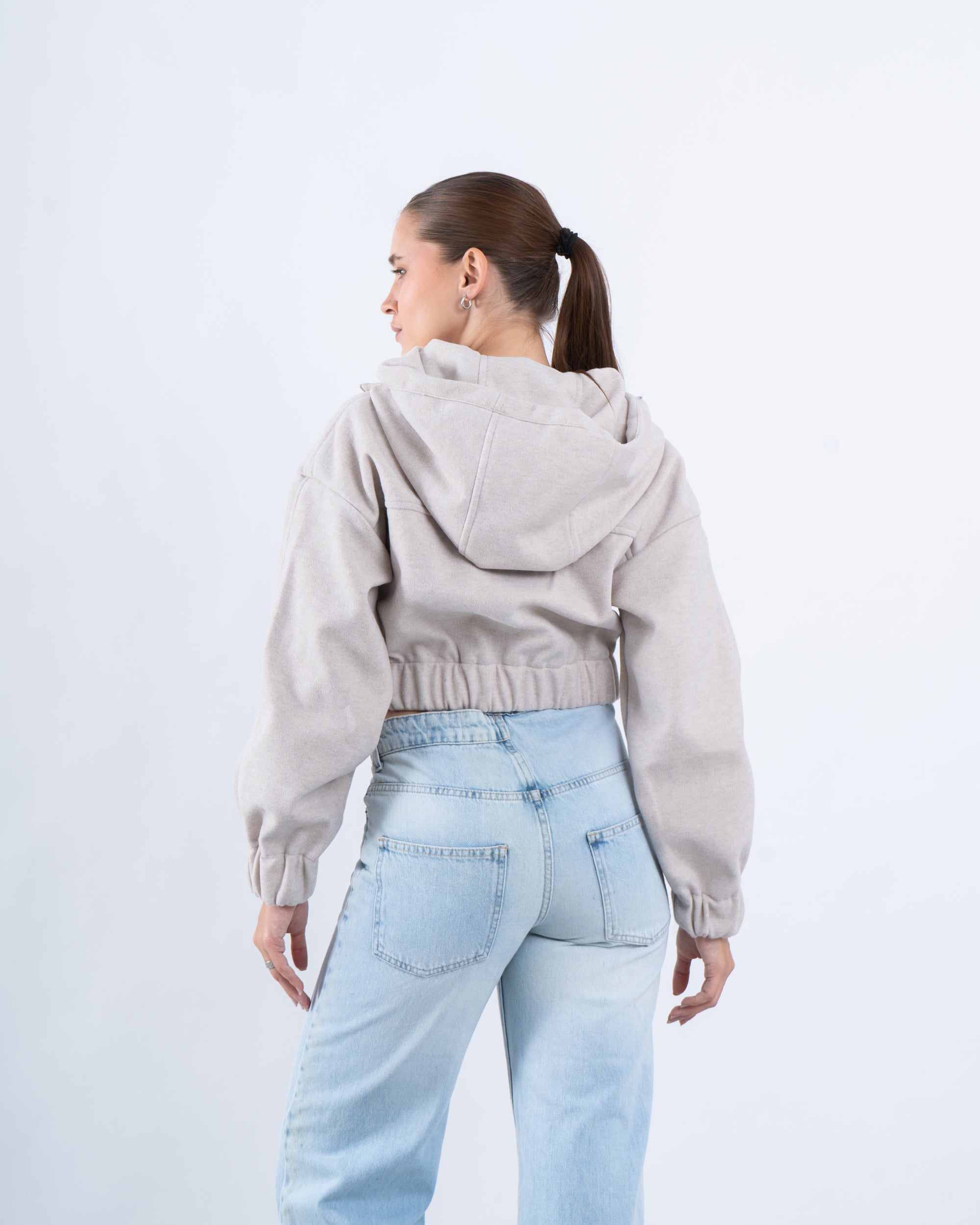 This chic wool jacket brings warmth and style together in one versatile piece. Featuring a soft wool blend fabric, it offers a cozy and luxurious feel, perfect for cooler days. The zip-up design with a hood adds a modern twist, while the cropped length creates a flattering silhouette. With elasticated cuffs and hem for a comfortable fit, this jacket is ideal for layering over casual outfits.